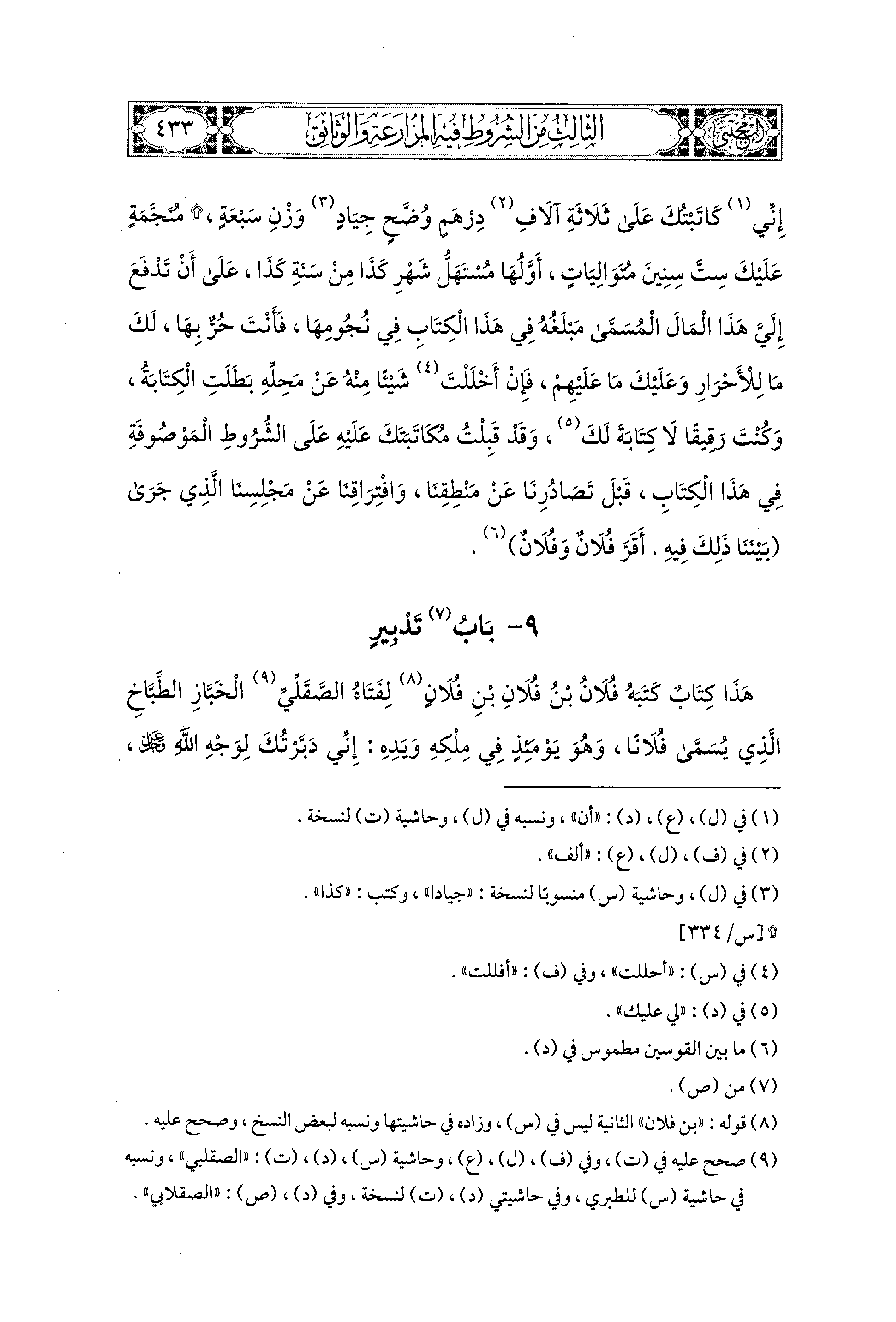 هَذَا كِتَابٌ كَتَبَهُ فُلاَنُ بْنُ فُلاَنِ بْنِ فُلاَنٍ لِفَتَاهُ الصَّقَلِّيِّ الخَبَّازِ الطَّبَّاخِ الَّذِي يُسَمَّى فُلاَنًا وَهُوَ يَوْمَئِذٍ فِي مِلْكِهِ وَيَدِهِ إِنِّي دَبَّرْتُكَ لِوَجْهِ اللهِ عَزَّ وَجَلَّ وَرَجَاءَ ثَوَابِهِ فَأَنْتَ حُرٌّ بَعْدَ مَوْتِي لاَ سَبِيلَ لأَحَدٍ عَلَيْكَ بَعْدَ وَفَاتِي إِلاَّ سَبِيلَ الوَلاَءِ فَإِنَّهُ لِي وَلِعَقِبِي مِنْ بَعْدِي أَقَرَّ فُلاَنُ بْنُ فُلاَنٍ بِجَميعِ مَا فِي هَذَا الكِتَابِ طَوْعًا فِي صِحَّةٍ مِنْهُ وَجَوَازِ أَمْرٍ بَعْدَ أَنْ قُرِئَ ذَلِكَ كُلُّهُ عَلَيْهِ بِمَحْضَرٍ مِنَ الشُّهُودِ المُسَمَّيْنَ فِيهِ فَأَقَرَّ عِنْدَهُمْ أَنَّهُ قَدْ سَمِعَهُ وَفَهِمَهُ وَعَرَفَهُ وَأَشْهَدَ اللهَ عَلَيْهِ وَكَفَى بِالله شَهِيدًا ثُمَّ مَنْ حَضَرَهُ مِنَ الشُّهُودِ عَلَيْهِ أَقَرَّ فُلاَنٌ الصَّقَلِّيُّ الطَّبَّاخُ فِي صِحَّةٍ مِنْ عَقْلِهِ وَبَدَنِهِ أَنَّ جَميعَ مَا فِي هَذَا الكِتَابِ حَقٌّ عَلَى مَا سُمِّيَ وَوُصِفَ فِيهِ.