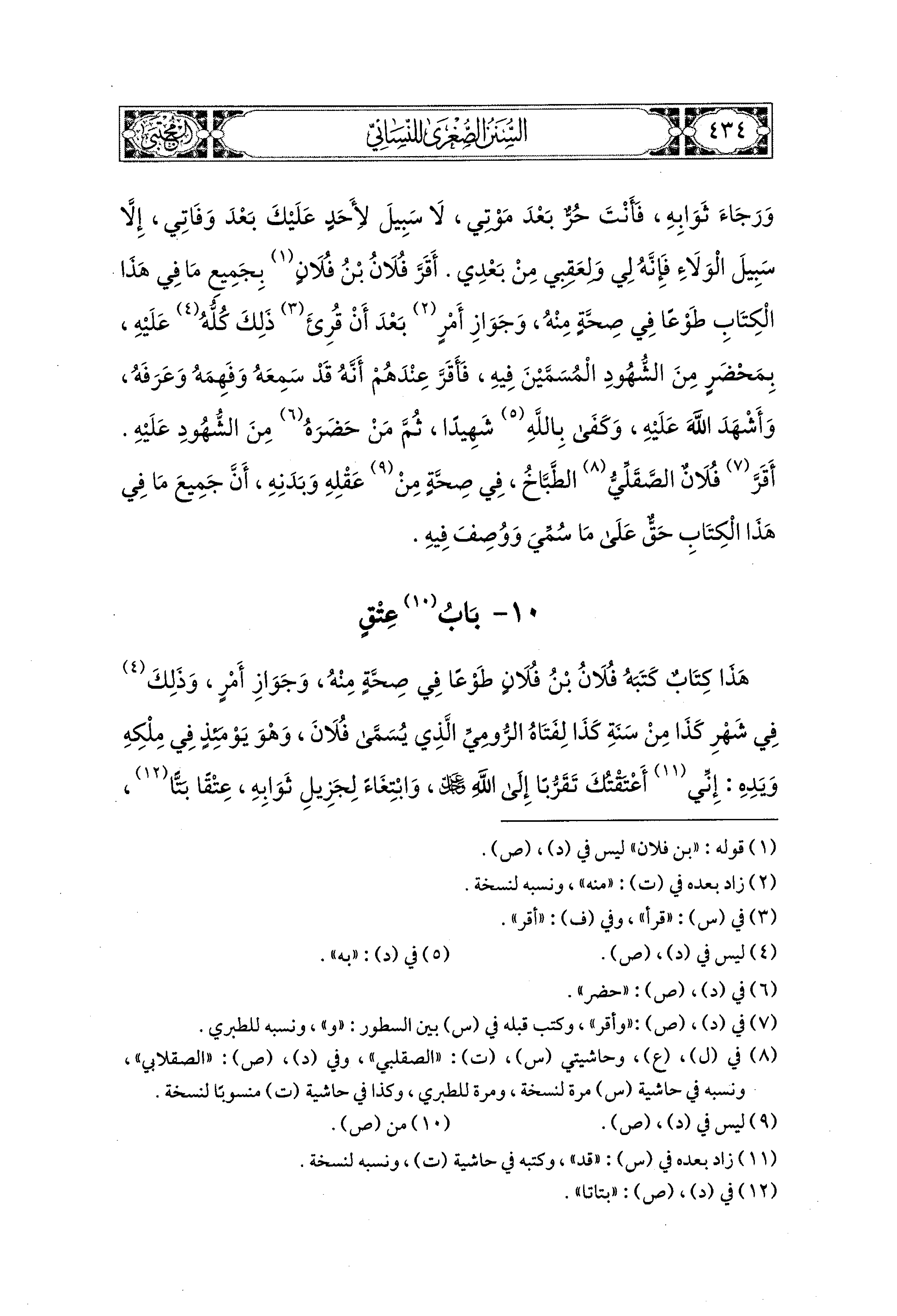 هَذَا كِتَابٌ كَتَبَهُ فُلاَنُ بْنُ فُلاَنٍ طَوْعًا فِي صِحَّةٍ مِنْهُ وَجَوَازِ أَمْرٍ وَذَلِكَ فِي شَهْرِ كَذَا مِنْ سَنَةِ كَذَا لِفَتَاهُ الرُّوميِّ الَّذِي يُسَمَّى فُلاَنًا، وَهُوَ يَوْمَئِذٍ فِي مِلْكِهِ وَيَدِهِ إِنِّي أَعْتَقْتُكَ تَقَرُّبًا إِلَى اللهِ عَزَّ وَجَلَّ وَابْتِغَاءً لِجَزِيلِ ثَوَابِهِ عِتْقًا بَتًّا لاَ مَثْنَوِيَّةَ فِيهِ، وَلاَ رَجْعَةَ لِي عَلَيْكَ فَأَنْتَ حُرٌّ لِوَجْهِ اللهِ عز وجل وَالدَّارِ الآخِرَةِ لاَ سَبِيلَ لِي وَلاَ لأَحَدٍ عَلَيْكَ إِلاَّ الوَلاَءَ فَإِنَّهُ لِي وَلِعَصَبَتِي مِنْ بَعْدِي.