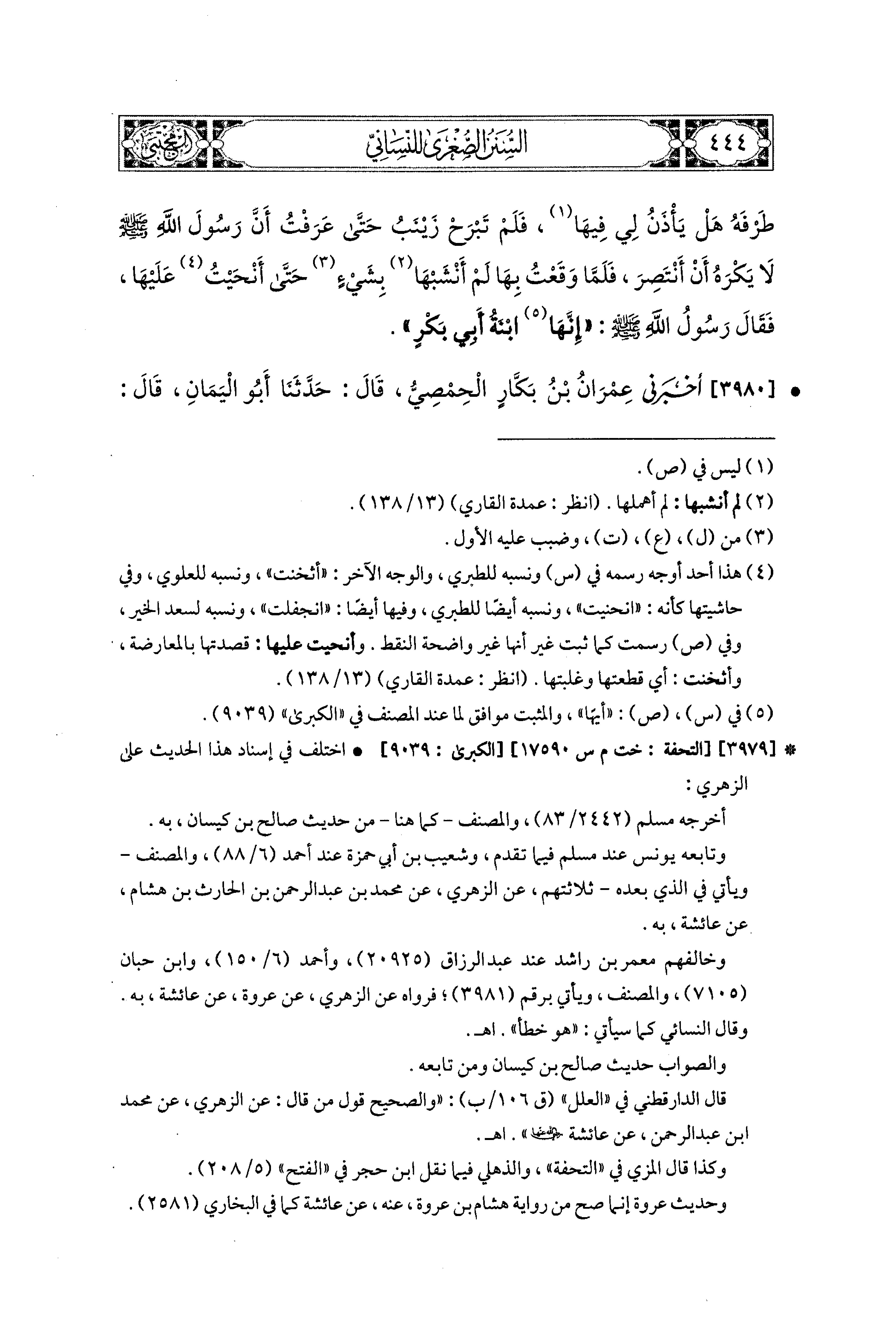 3980- أَخْبَرَني عِمْرَانُ بْنُ بَكَّارٍ الحِمْصِيُّ، قال: حَدثنا أَبو اليَمَانِ، قَالَ: أَخبَرنا شُعَيبٌ، عَنِ الزُّهْرِيِّ، قَالَ: أَخْبَرَني مُحَمدُ بْنُ عَبدِ الرَّحمَنِ بْنِ الحَارِثِ بْنِ هِشَامٍ، أَنَّ عَائِشَةَ قَالَتْ: فَذَكَرَتْ نَحْوَهُ، وَقَالَتْ: أَرْسَلَ أَزْوَاجُ النَّبيِّ صَلى الله عَليه وسَلم زَيْنَبَ، فَاسْتَأْذَنَتْ، فَأَذِنَ لَهَا فَدَخَلَتْ، فَقَالَتْ ... نَحْوَهُ.