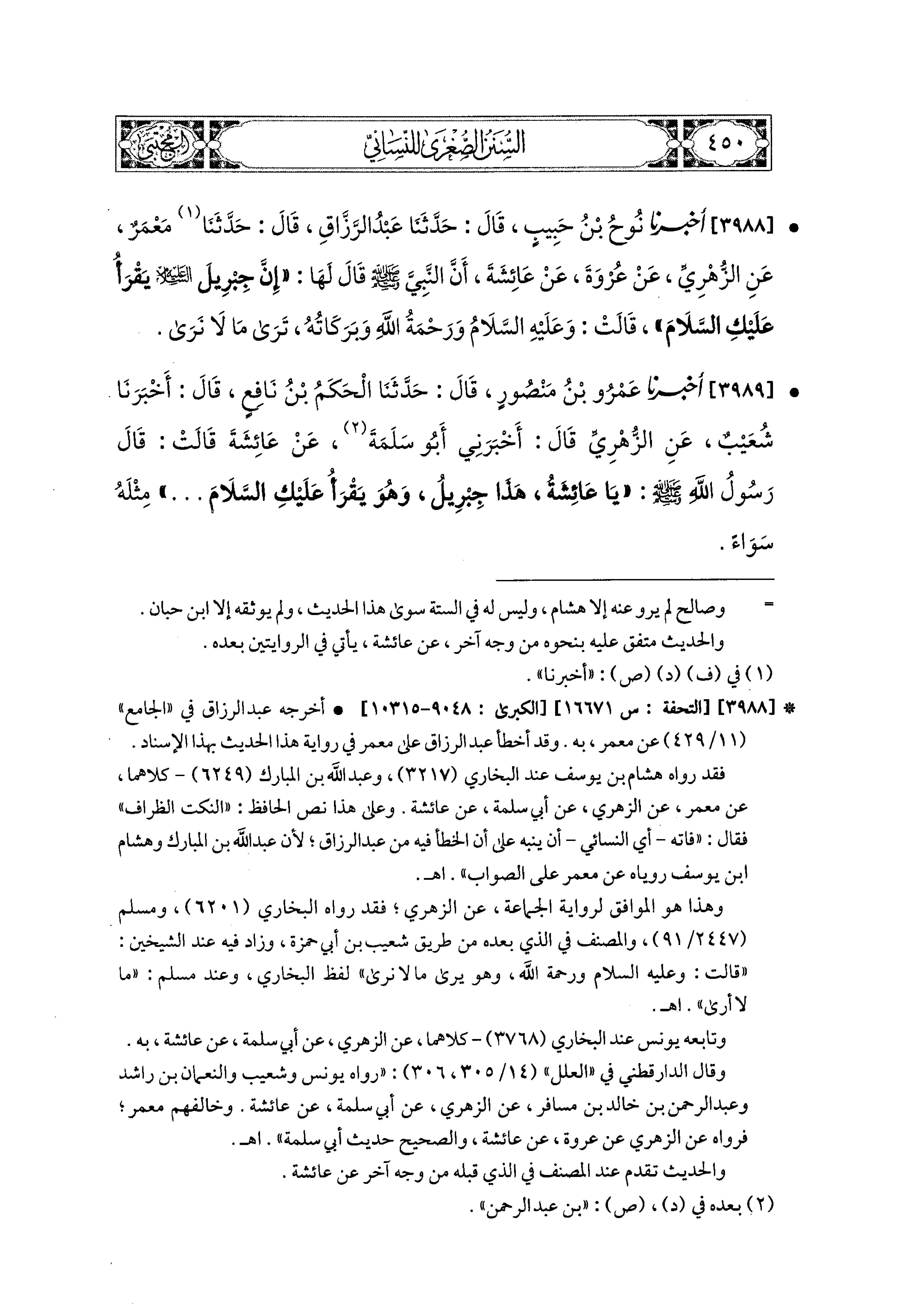 3988- أَخبَرَنا نُوحُ بْنُ حَبِيبٍ، قال: حَدثنا عَبدُ الرَّزَّاقِ، قال: حَدثنا مَعْمَرٌ، عَنِ الزُّهْرِيِّ، عَن عُرْوَةَ، عَن عَائِشَةَ، أَنَّ النَّبيَّ صَلى الله عَليه وسَلم قَالَ لَهَا: إِنَّ جِبْرِيلَ عَلَيْهِ السَّلاَمُ يَقْرَأُ عَلَيْكِ السَّلاَمَ، قَالَتْ: وَعَلَيْهِ السَّلاَمُ وَرَحْمَةُ اللهِ وَبَرَكَاتُهُ، تَرَى مَا لاَ نَرَى.