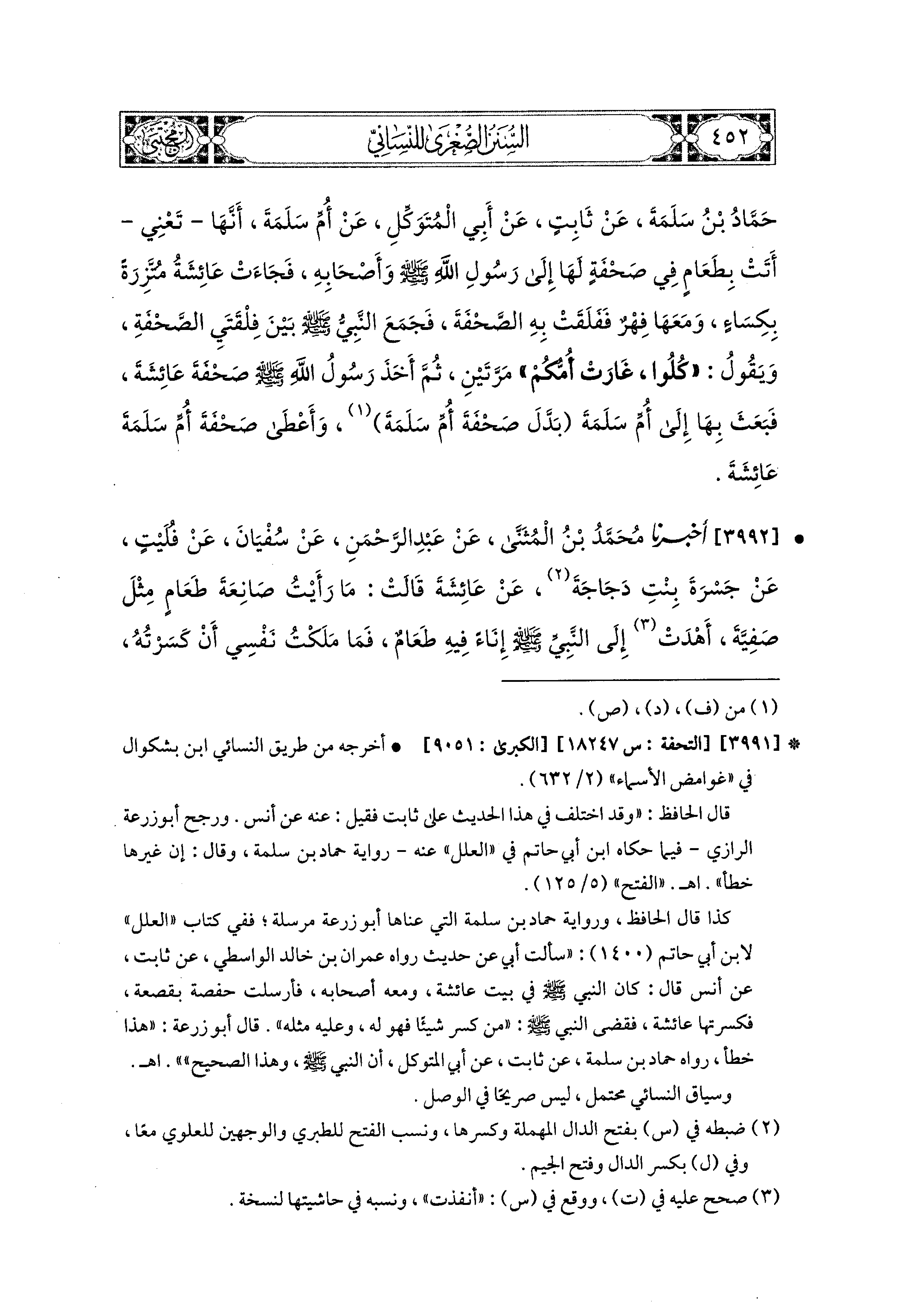 3992- أَخبَرَنا مُحَمد بْنُ المُثَنَّى، عَن عَبدِ الرَّحمَنِ، عَن سُفْيَانَ، عَن فُلَيْتٍ، عَن جَسْرَةَ بِنْتِ دُجَاجَةَ، عَن عَائِشَةَ قَالَتْ: مَا رَأَيْتُ صَانِعَةَ طَعَامٍ مِثْلَ صَفِيَّةَ، أَهْدَتْ إِلَى النَّبيِّ صَلى الله عَليه وسَلم إِنَاءً فِيهِ طَعَامٌ، فَمَا مَلَكْتُ نَفْسِي أَنْ كَسَرْتُهُ، فَسَأَلْتُ النَّبيَّ صَلى الله عَليه وسَلم عَن كَفَّارَتِهِ، فَقَالَ: إِنَاءٌ كَإِنَاءٍ، وَطَعَامٌ كَطَعَامٍ.