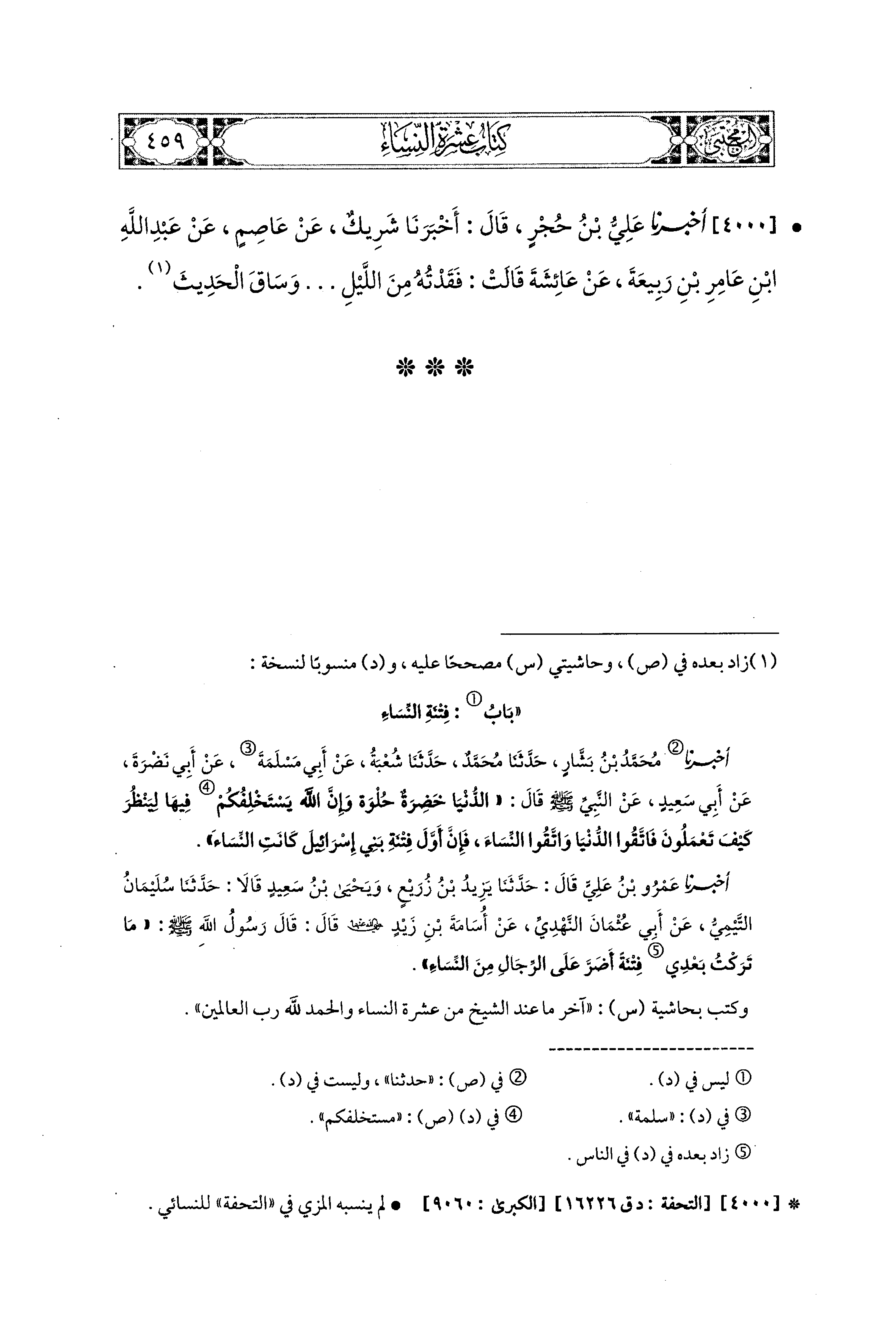 4000- أَخبَرَنا عَلِيُّ بْنُ حُجْرٍ، قَالَ: أَخبَرنا شَرِيكٌ، عَن عَاصِمٍ، عَن عَبد اللهِ بن عَامِرِ بْنِ رَبِيعَةَ، عَن عَائِشَةَ قَالَتْ: فَقَدْتُهُ مِنَ اللَّيلِ وَسَاقَ الحَدِيثَ.