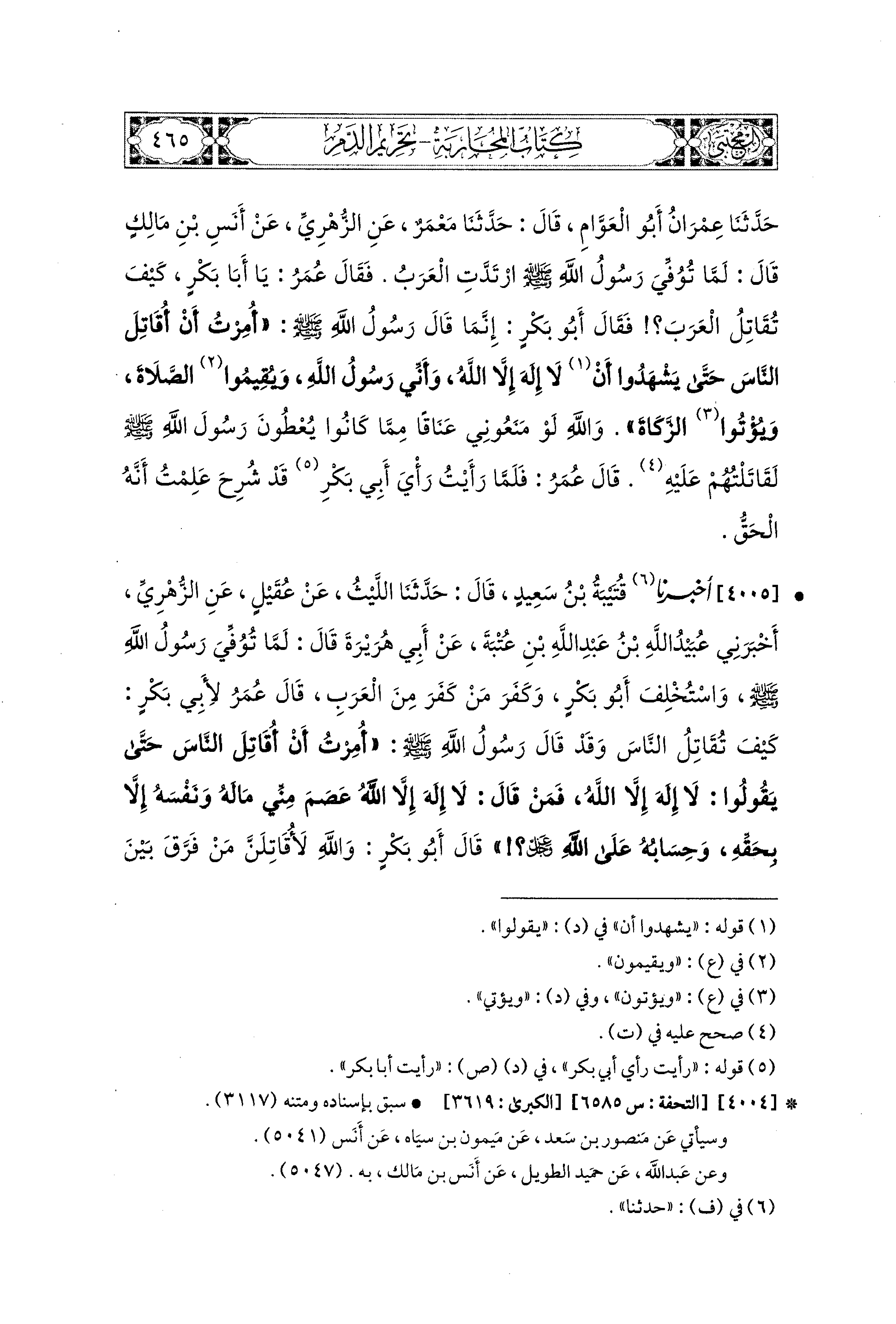 4005 - أَخبَرَنا قُتَيبَةُ بْنُ سَعيدٍ، قال: حَدثنا اللَّيْثُ، عَن عُقَيْلٍ، عَنِ الزُّهْرِيِّ، أَخْبَرَني عُبَيدُ اللهِ بْنُ عَبدِ اللهِ بْنِ عُتْبَةَ، عَن أَبِي هُرَيرَةَ قَالَ: لَمَّا تُوُفِّيَ رَسُولُ اللهِ صَلى الله عَليه وسَلم، وَاسْتُخْلِفَ أَبو بَكْرٍ، وَكَفَرَ مَنْ كَفَرَ مِنَ العَرَبِ، قَالَ عُمَرُ لأَبِي بَكْرٍ: كَيْفَ تُقَاتِلُ النَّاسَ، وَقَدْ قَالَ رَسُولُ اللهِ صَلى الله عَليه وسَلم: أُمِرْتُ أَنْ أُقَاتِلَ النَّاسَ حَتَّى يَقُولُوا: لاَ إِلَهَ إِلاَّ اللهُ، فَمَنْ قَالَ: لاَ إِلَهَ إِلاَّ اللهُ، عَصَمَ مِنِّي مَالَهُ وَنَفْسَهُ، إِلاَّ بِحَقِّهِ وَحِسَابُهُ عَلَى اللهِ عز وجل، قَالَ أَبو بَكْرٍ: وَالله لأُقَاتِلَنَّ مَنْ فَرَّقَ بَيْنَ الصَّلاَةِ وَالزَّكَاةِ، فَإِنَّ الزَّكَاةَ حَقُّ المَالِ، وَالله لَوْ مَنَعُوني عِقَالاً كَانُوا يُؤَدُّونَهُ إِلَى رَسُولِ اللهِ صَلى الله عَليه وسَلم لَقَاتَلْتُهُمْ عَلَى مَنْعِهِ، قَالَ عُمَرُ: فَوَالله مَا هُوَ إِلاَّ أَنِّي رَأَيْتُ اللهَ شَرَحَ صَدْرَ أَبِي بَكْرٍ لِلْقِتَالِ فَعَرَفْتُ أَنَّهُ الحَقُّ.