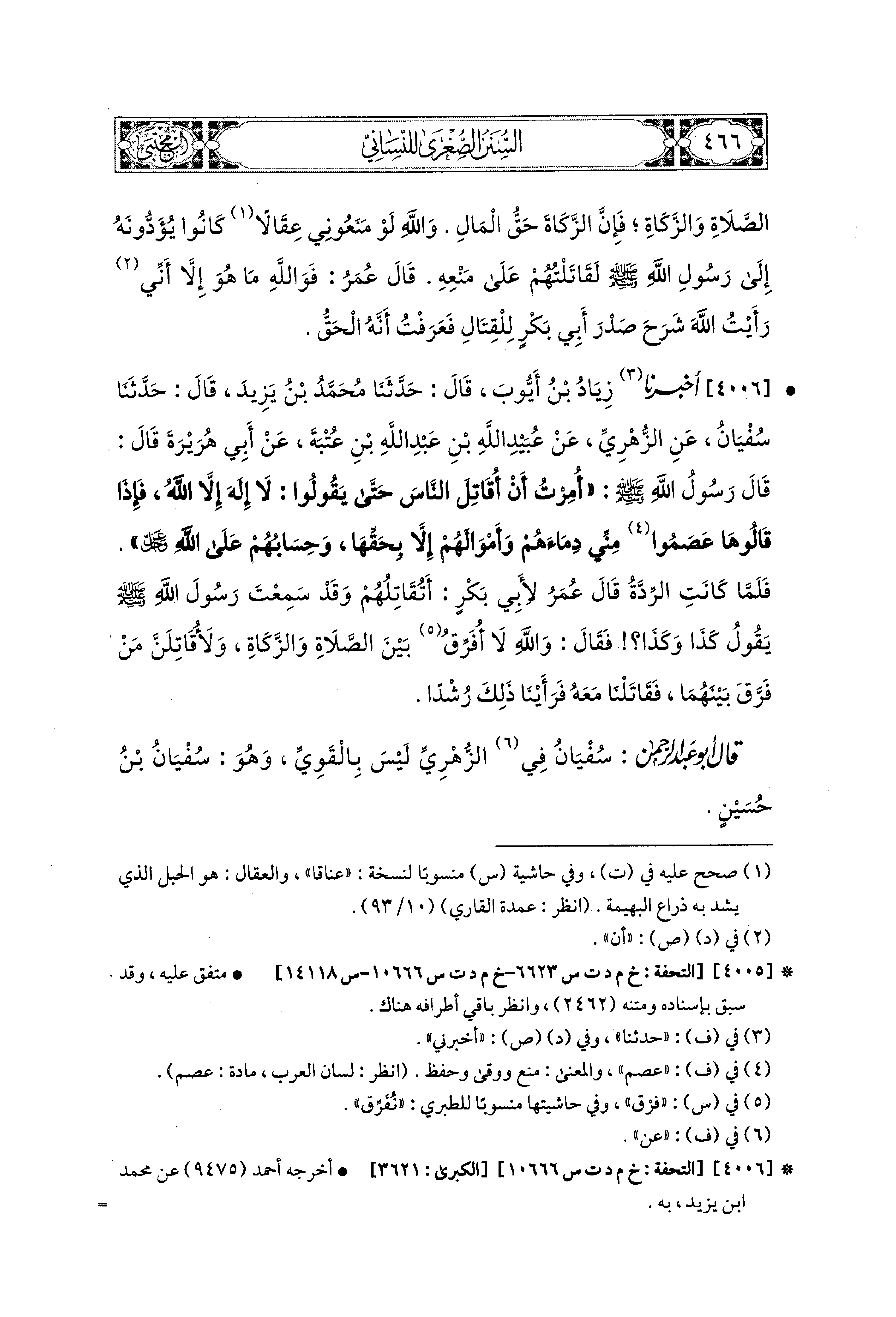 4006 - أَخبَرَنا زِيَادُ بْنُ أَيُّوبَ، قال: حَدثنا مُحَمدُ بْنُ يَزِيدَ، قال: حَدثنا سُفْيَانُ، عَنِ الزُّهْرِيِّ، عَن عُبَيدِ اللهِ بْنِ عَبدِ اللهِ بْنِ عُتْبَةَ، عَن أَبِي هُرَيرَةَ قَالَ: قَالَ رَسُولُ اللهِ صَلى الله عَليه وسَلم: أُمِرْتُ أَنْ أُقَاتِلَ النَّاسَ حَتَّى يَقُولُوا: لاَ إِلَهَ إِلاَّ اللهُ، فَإِذَا قَالُوهَا فَقَدْ عَصَمُوا مِنِّي دِمَاءَهُمْ وَأَمْوَالَهُمْ، إِلاَّ بِحَقِّهَا وَحِسَابُهُمْ عَلَى اللهِ عز وجل، فَلَمَّا كَانَتِ الرِّدَّةُ، قَالَ عُمَرُ لأَبِي بَكْرٍ: أَتُقَاتِلُهُمْ وَقَدْ سَمِعْتَ رَسُولَ اللهِ صَلى الله عَليه وسَلم يَقُولُ: كَذَا وَكَذَا؟ فَقَالَ: وَالله لاَ أُفَرِّقُ بَيْنَ الصَّلاَةِ، وَالزَّكَاةِ، وَلأُقَاتِلَنَّ مَنْ فَرَّقَ بَيْنَهُمَا، فَقَاتَلْنَا مَعَهُ فَرَأَيْنَا ذَلِكَ رُشْدًا.