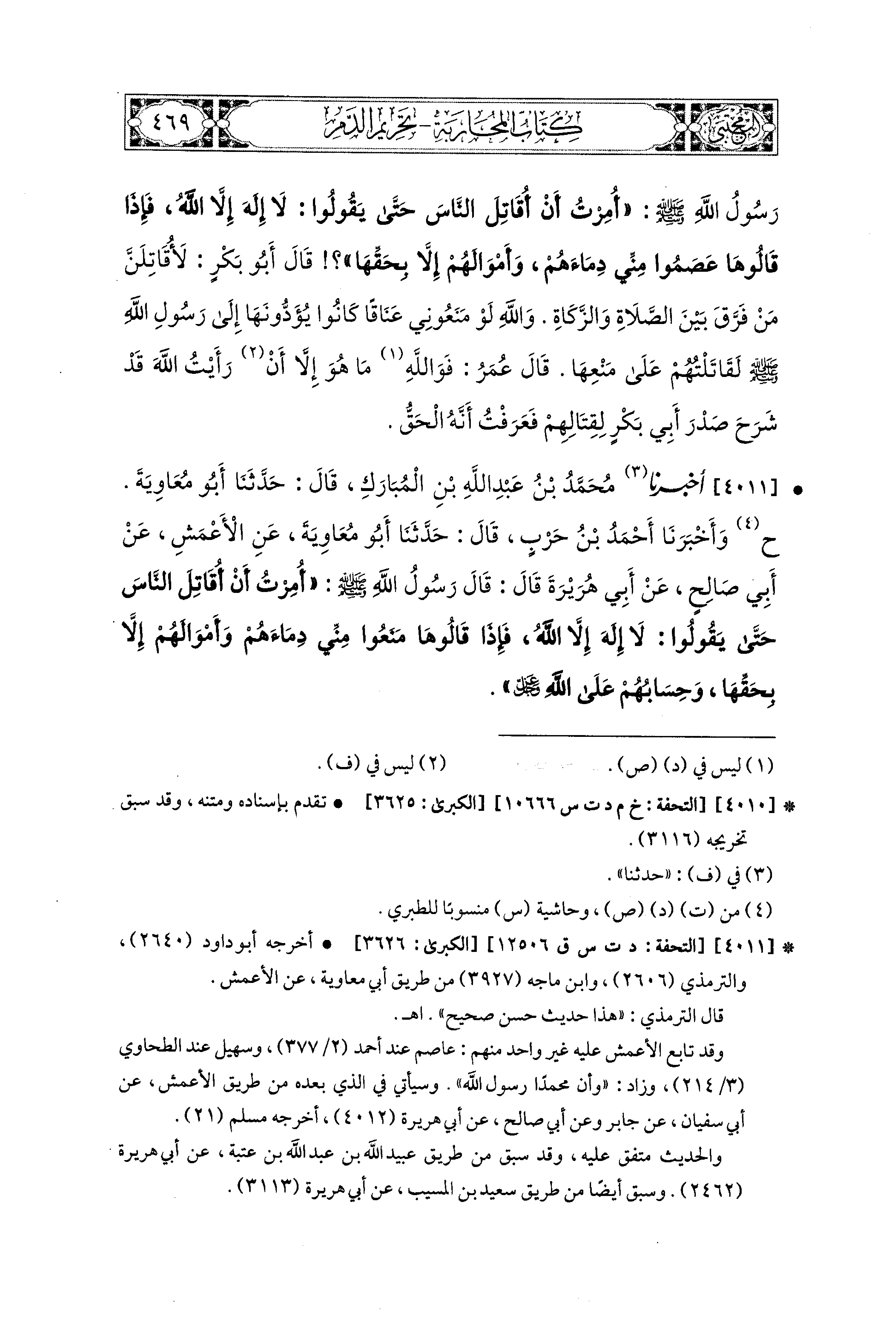 4011 - أَخبَرَنا مُحَمد بْنُ عَبدِ اللهِ بْنِ المُبَارَكِ، قال: حَدثنا أَبو مُعَاوِيَةَ (ح) وَأَخبَرنا أَحْمَدُ بْنُ حَرْبٍ، قال: حَدثنا أَبو مُعَاوِيَةَ، عَنِ الأَعْمَشِ، عَن أَبِي صَالِحٍ، عَن أَبِي هُرَيرَةَ قَالَ: قَالَ رَسُولُ اللهِ صَلى الله عَليه وسَلم: أُمِرْتُ أَنْ أُقَاتِلَ النَّاسَ حَتَّى يَقُولُوا: لاَ إِلَهَ إِلاَّ اللهُ، فَإِذَا قَالُوهَا مَنَعُوا مِنِّي دِمَاءَهُمْ، وَأَمْوَالَهُمْ إِلاَّ بِحَقِّهَا، وَحِسَابُهُمْ عَلَى اللهِ عَزَّ وَجَلَّ.