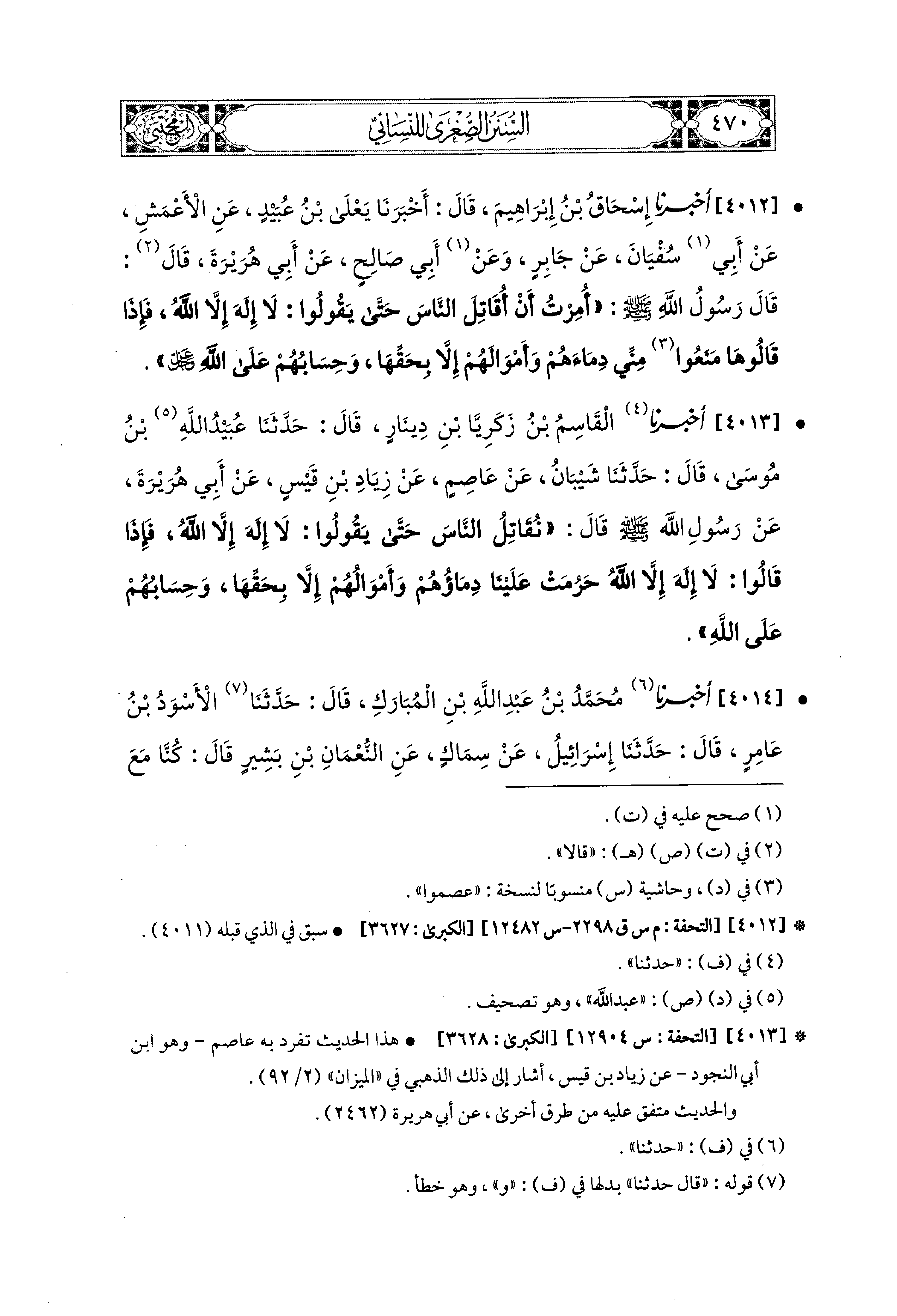 4013 - أَخبَرَنا القَاسِمُ بْنُ زَكَرِيَّا بْنِ دِينَارٍ، قال: حَدثنا عُبَيدُ اللهِ بْنُ مُوسَى، قال: حَدثنا شَيْبَانُ، عَن عَاصِمٍ، عَن زِيَادِ بْنِ قَيْسٍ، عَن أَبِي هُرَيرَةَ، عَن رَسُولِ اللهِ صَلى الله عَليه وسَلم قَالَ: نُقَاتِلُ النَّاسَ حَتَّى يَقُولُوا: لاَ إِلَهَ إِلاَّ اللهُ، فَإِذَا قَالُوا لاَ إِلَهَ إِلاَّ اللهُ، حَرُمَتْ عَلَيْنَا دِمَاؤُهُمْ وَأَمْوَالُهُمْ، إِلاَّ بِحَقِّهَا وَحِسَابُهُمْ عَلَى الله.