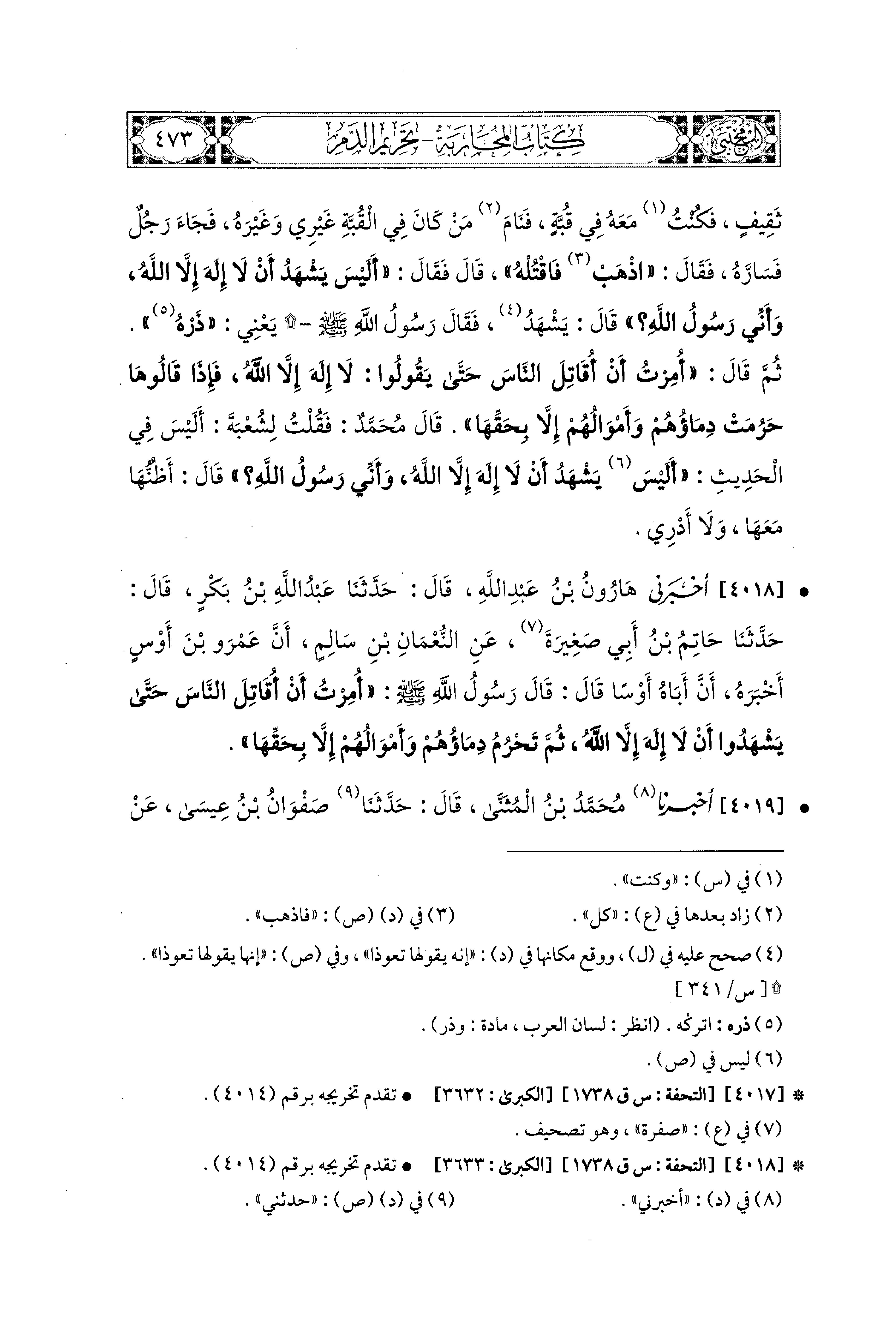 4018 - أَخْبَرَني هَارُونُ بْنُ عَبدِ اللهِ، قال: حَدثنا عَبدُ اللهِ بْنُ بَكْرٍ، قال: حَدثنا حَاتِمُ بْنُ أَبِي صَغِيرَةَ، عَنِ النُّعْمَانِ بْنِ سَالِمٍ، أَنَّ عَمْرَو بْنَ أَوْسٍ، أَخْبَرَهُ، أَنَّ أَبَاهُ أَوْسًا قَالَ: قَالَ رَسُولُ اللهِ صَلى الله عَليه وسَلم: أُمِرْتُ أَنْ أُقَاتِلَ النَّاسَ حَتَّى يَشْهَدُوا أَنْ لاَ إِلَهَ إِلاَّ اللهُ، ثُمَّ تَحْرُمُ دِمَاؤُهُمْ وَأَمْوَالُهُمْ، إِلاَّ بِحَقِّهَا.