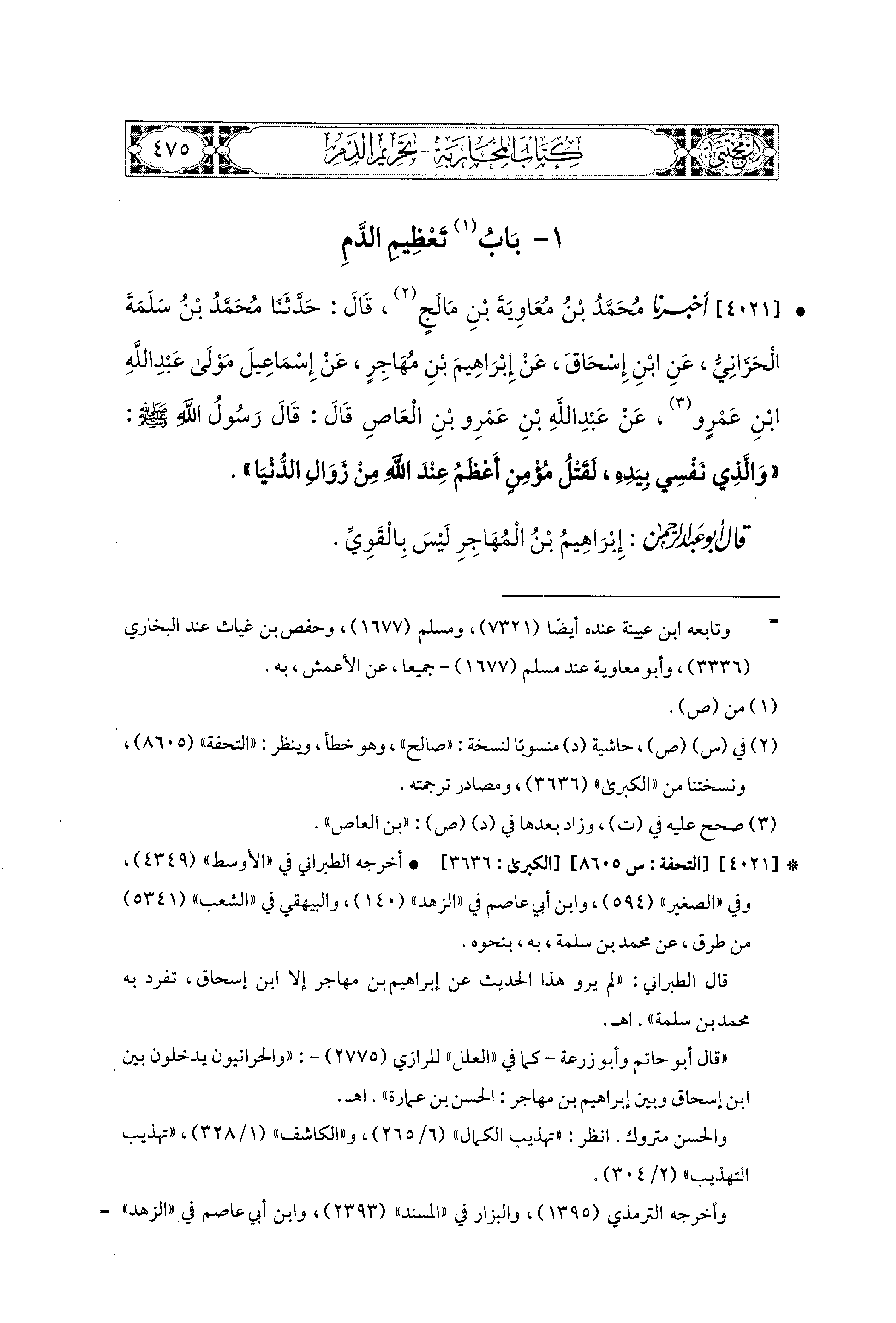 4021 - أَخبَرَنا مُحَمد بْنُ مُعَاوِيَةَ بْنِ مَالَجَ، قال: حَدثنا مُحَمدُ بْنُ سَلَمَةَ الحَرَّانيُّ، عَنِ ابنِ إِسحَاقَ، عَن إِبراهِيمَ بْنِ مُهَاجِرٍ، عَن إِسماعِيلَ، مَوْلَى عَبدِ اللهِ بْنِ عَمْرٍو، عَن عَبد اللهِ بن عَمْرِو بْنِ العَاصِ قَالَ: قَالَ رَسُولُ اللهِ صَلى الله عَليه وسَلم: وَالَّذِي نَفْسِي بِيَدِهِ، لَقَتْلُ مُؤْمِنٍ أَعْظَمُ عِنْدَ اللهِ مِنْ زَوَالِ الدُّنْيَا.