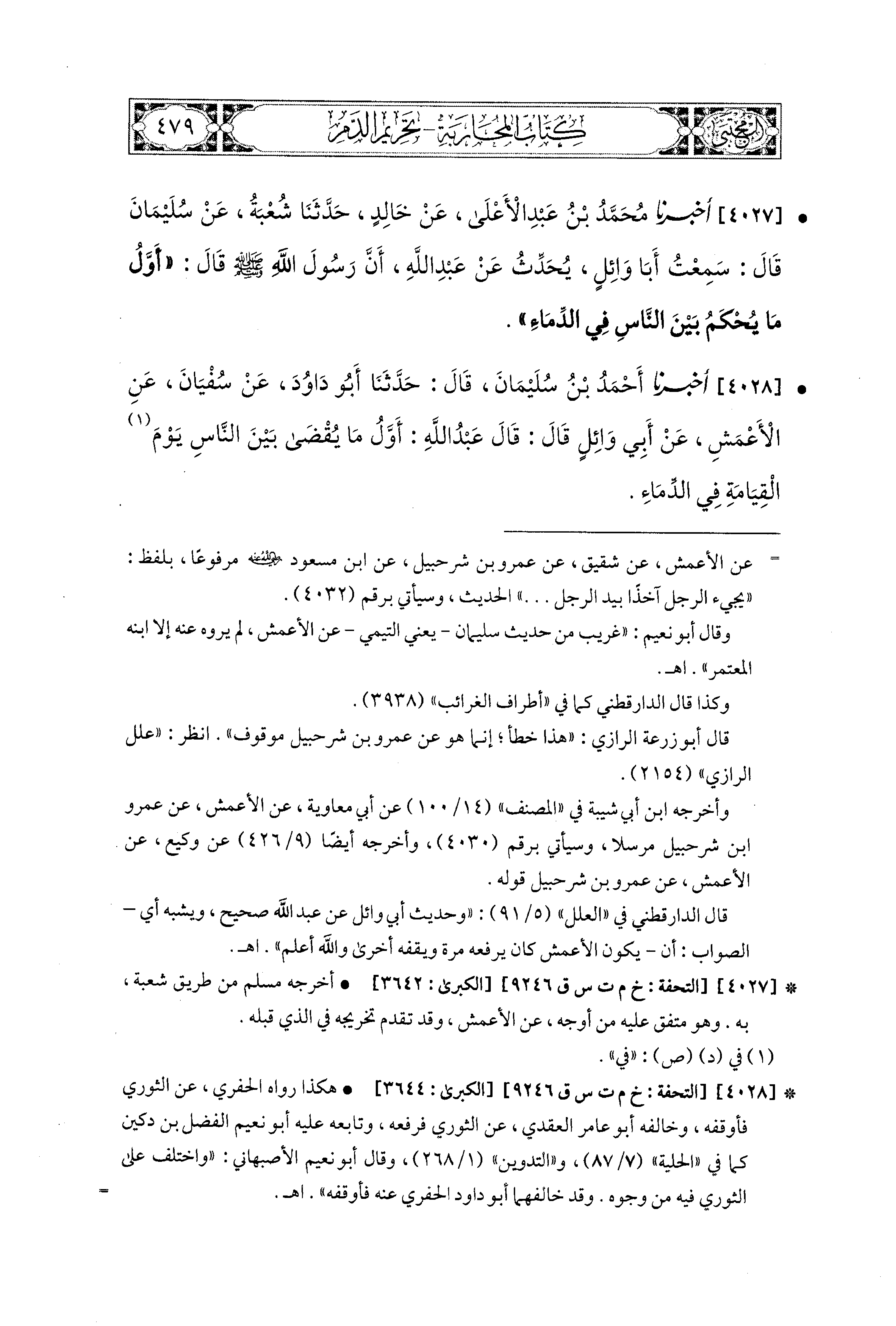 4028 - أَخبَرَنا أَحْمَدُ بْنُ سُلَيمَانَ، قال: حَدثنا أَبو دَاوُدَ، عَن سُفْيَانَ، عَنِ الأَعْمَشِ، عَن أَبِي وَائِلٍ قَالَ: قَالَ عَبدُ اللهِ: أَوَّلُ مَا يُقْضَى بَيْنَ النَّاسِ يَوْمَ القِيَامَةِ فِي الدِّمَاءِ.
