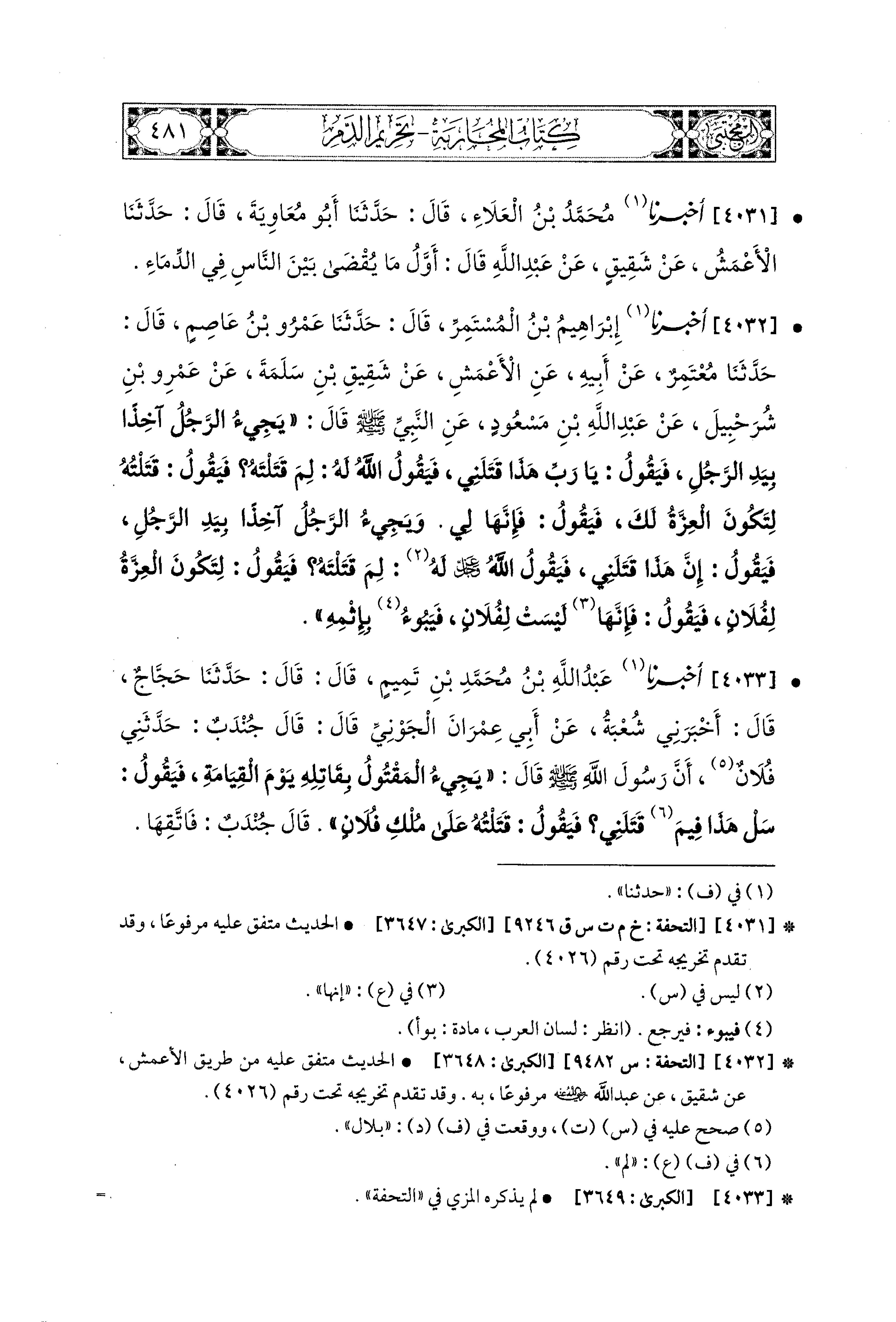 4033 - أَخبَرَنا عَبدُ اللهِ بْنُ مُحَمدِ بْنِ تَميمٍ، قال: حَدثنا حَجَّاجٌ، قَالَ: أَخْبَرَني شُعْبَةُ، عَن أَبِي عِمْرَانَ الجَوْنيِّ قَالَ: قَالَ جُنْدَبٌ: حَدَّثَني فُلاَنٌ، أَنَّ رَسُولَ اللهِ صَلى الله عَليه وسَلم قَالَ: يَجِيءُ المَقْتُولُ بِقَاتِلِهِ يَوْمَ القِيَامَةِ فَيَقُولُ: سَلْ هَذَا فِيمَ قَتَلَني، فَيَقُولُ: قَتَلْتُهُ عَلَى مُلْكِ فُلاَنٍ، قَالَ جُنْدَبٌ: فَاتَّقِهَا.