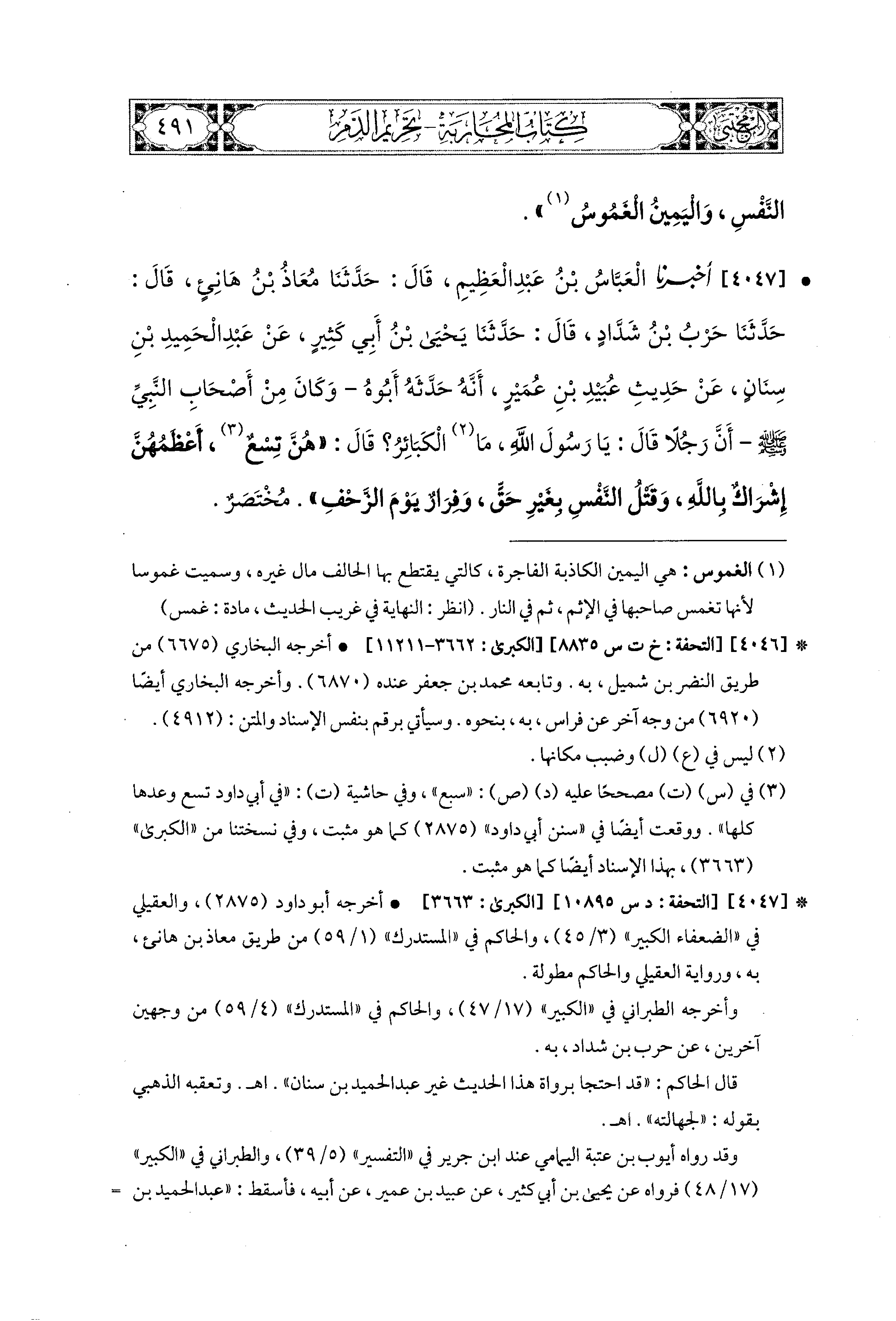 4047 - أَخبَرَنا العَبَّاسُ بْنُ عَبدِ العَظِيمِ، قال: حَدثنا مُعَاذُ بْنُ هَانِئٍ، قال: حَدثنا حَرْبُ بْنُ شَدَّادٍ، قال: حَدثنا يَحيَى بْنُ أَبِي كَثِيرٍ، عَن عَبدِ الحَميدِ بْنِ سِنَانٍ، عَن حَدِيثِ عُبَيدِ بْنِ عُمَيْرٍ، أَنَّهُ حَدَّثَهُ أَبوهُ، وَكَانَ مِنْ أَصْحَابِ النَّبيِّ صَلى الله عَليه وسَلم، أَنَّ رَجُلاً قَالَ: يَا رَسُولَ اللهِ، مَا الكَبَائِرُ؟ قَالَ: هُنَّ تِسْعٌ، أَعْظَمُهُنَّ إِشْرَاكٌ بِالله، وَقَتْلُ النَّفْسِ بِغَيْرِ حَقٍّ، وَفِرَارٌ يَوْمَ الزَّحْفِ. مُخْتَصَرٌ.