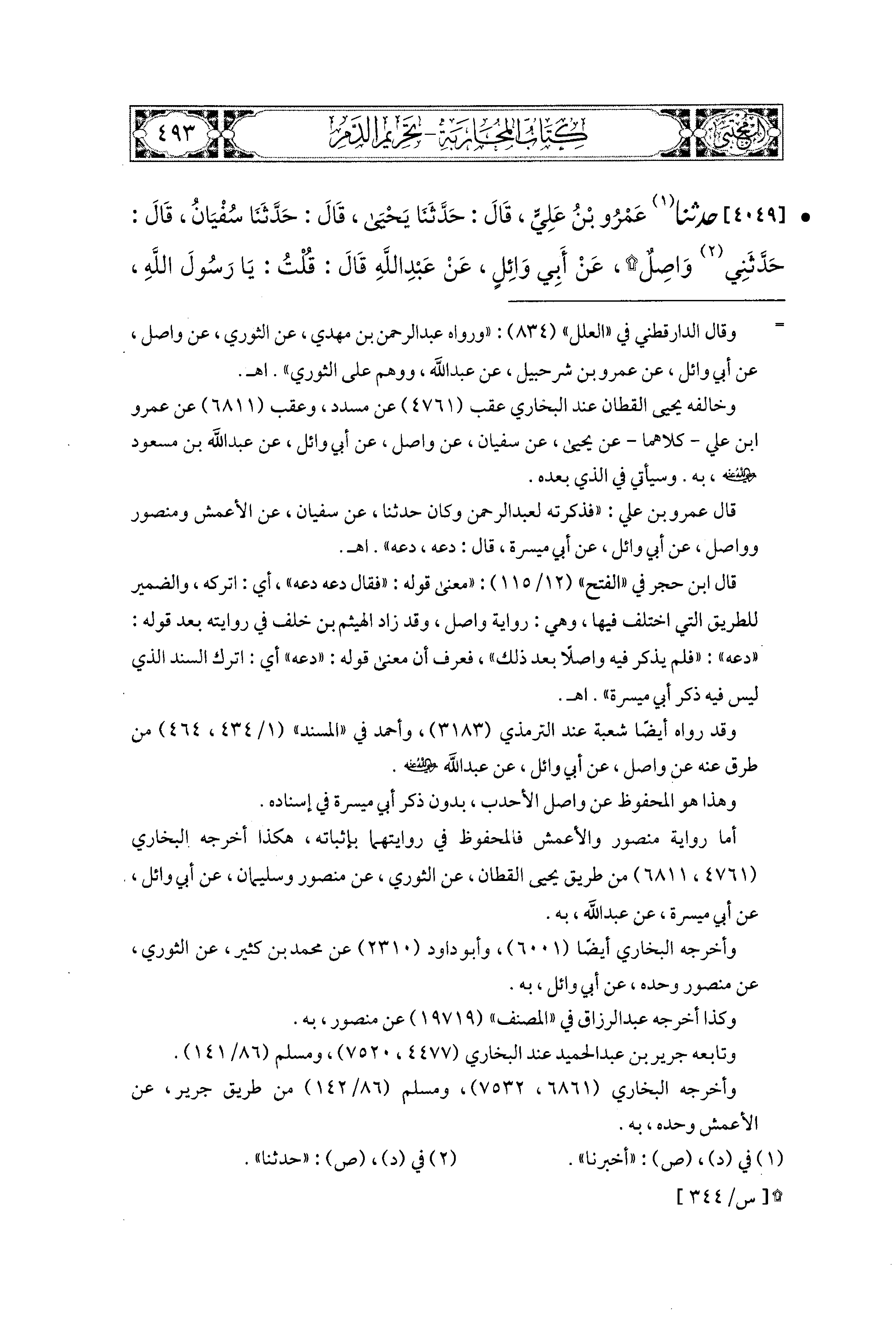4049 - حَدَّثَنَا عَمْرُو بْنُ عَلِيٍّ، قال: حَدثنا يَحيَى، قال: حَدثنا سُفْيَانُ، قَالَ: حَدَّثَني وَاصِلٌ، عَن أَبِي وَائِلٍ، عَن عَبدِ اللهِ، قَالَ: قُلْتُ: يَا رَسُولَ اللهِ، أَيُّ الذَّنْبِ أَعْظَمُ؟ قَالَ: أَنْ تَجْعَلَ لِلَّهِ نِدًّا وَهُوَ خَلَقَكَ، قُلْتُ: ثُمَّ أَيٌّ؟ قَالَ: أَنْ تَقْتُلَ وَلَدَكَ مِنْ أَجْلِ أَنْ يَطْعَمَ مَعَكَ، قُلْتُ: ثُمَّ أَيٌّ؟ قَالَ: ثُمَّ أَنْ تُزَانيَ بِحَلِيلَةِ جَارِكَ.