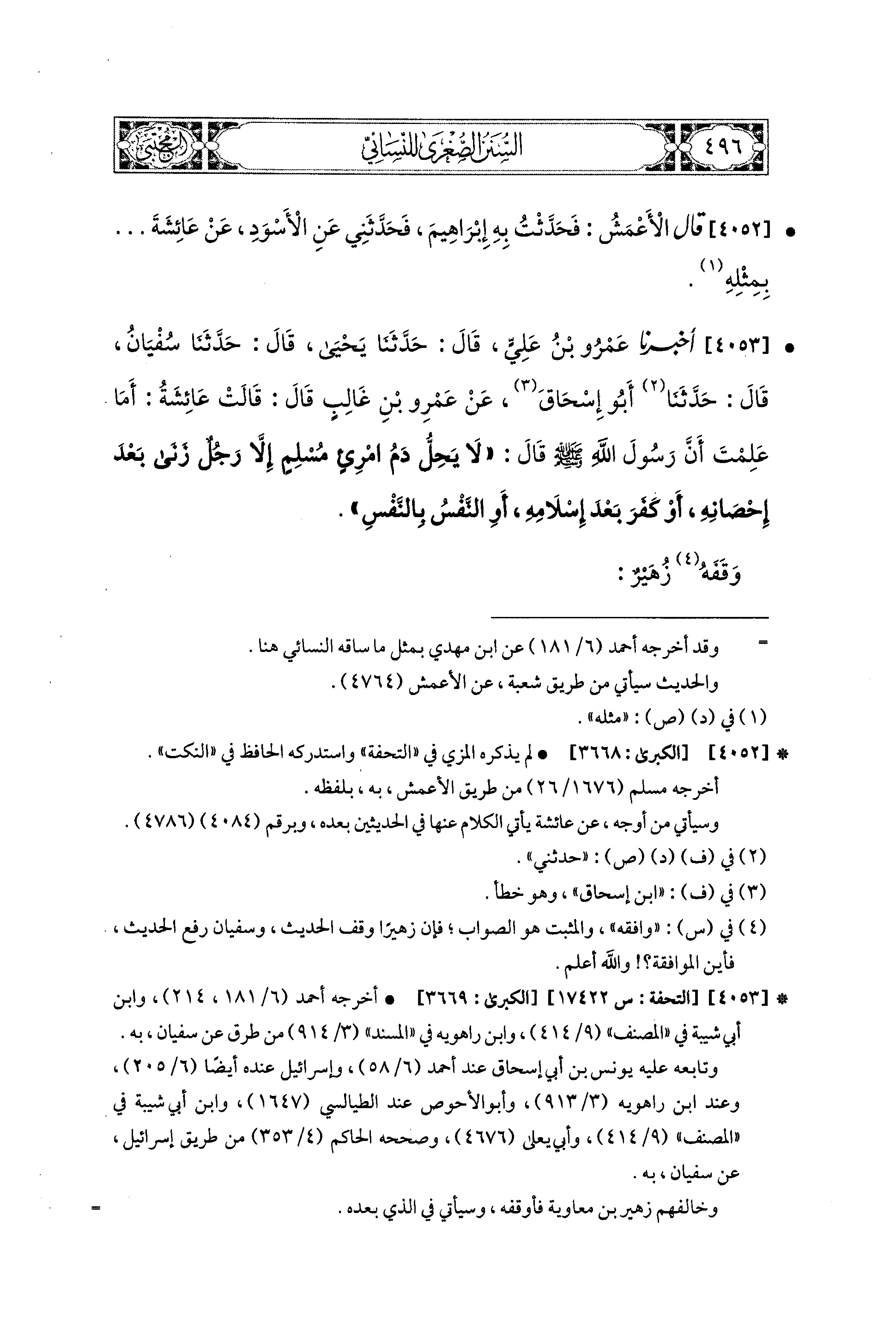4053 - أَخبَرَنا عَمْرُو بْنُ عَلِيٍّ، قال: حَدثنا يَحيَى، قال: حَدثنا سُفْيَانُ، قال: حَدثنا أَبو إِسحَاقَ، عَن عَمْرِو بْنِ غَالِبٍ قَالَ: قَالَتْ عَائِشَةُ: أَمَا عَلِمْتَ أَنَّ رَسُولَ اللهِ صَلى الله عَليه وسَلم قَالَ: لاَ يَحِلُّ دَمُ امْرِئٍ مُسْلِمٍ إِلاَّ رَجُلٌ زَنَى بَعْدَ إِحْصَانِهِ، أَوْ كَفَرَ بَعْدَ إِسْلاَمِهِ، أَوِ النَّفْسُ بِالنَّفْسِ.