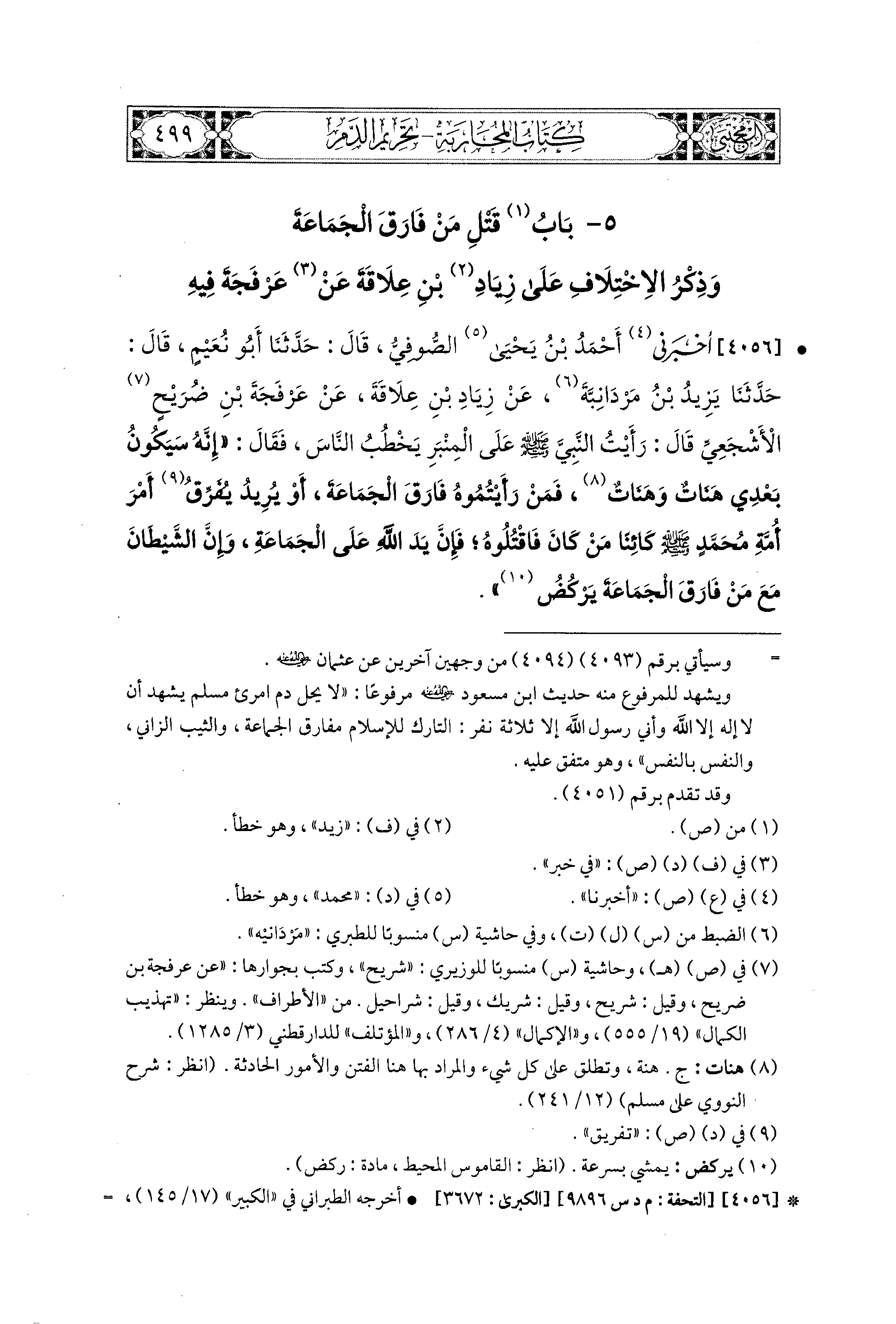 4056 - أَخْبَرَني أَحْمَدُ بْنُ يَحيَى الصُّوفِيُّ، قال: حَدثنا أَبو نُعَيْمٍ، قال: حَدثنا يَزِيدُ بْنُ مَرْدَانُبَةَ، عَن زِيَادِ بْنِ عِلاَقَةَ، عَن عَرْفَجَةَ بْنِ ضُرَيْحٍ الأَشْجَعِيِّ قَالَ: رَأَيْتُ النَّبيَّ صَلى الله عَليه وسَلم عَلَى المِنْبَرِ يَخْطُبُ النَّاسَ، فَقَالَ: إِنَّهُ سَيَكُونُ بَعْدِي هَنَاتٌ وَهَنَاتٌ، فَمَنْ رَأَيْتُمُوهُ فَارَقَ الجَمَاعَةَ، أَوْ يُرِيدُ يُفَرِّقُ أَمْرَ أُمَّةِ مُحَمدٍ صَلى الله عَليه وسَلم كَائِنًا مَنْ كَانَ فَاقْتُلُوهُ، فَإِنَّ يَدَ اللهِ عَلَى الجَمَاعَةِ، وَإِنَّ الشَّيْطَانَ مَعَ مَنْ فَارَقَ الجَمَاعَةَ يَرْكُضُ.