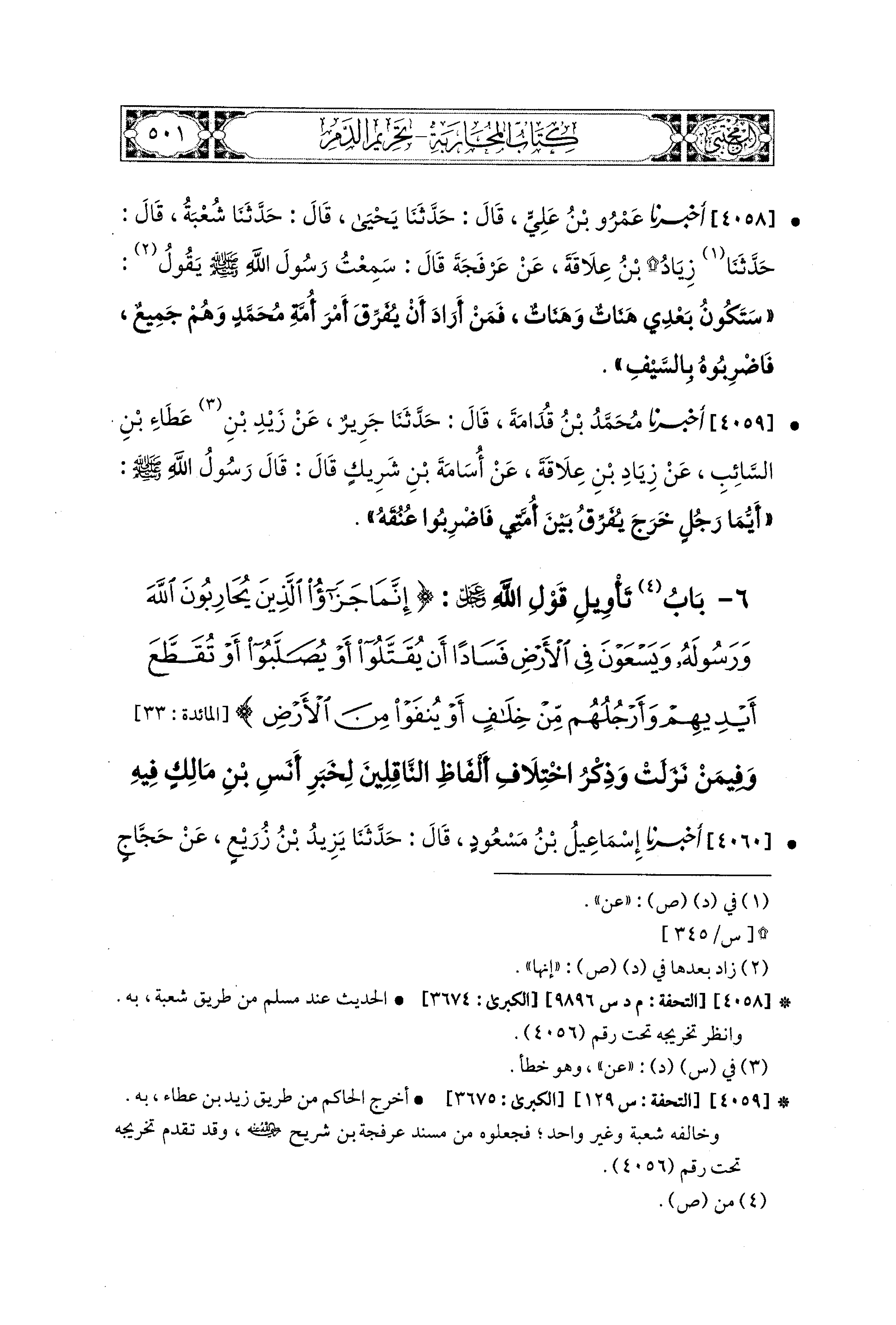 4059 - أَخبَرَنا مُحَمد بْنُ قُدَامَةَ، قال: حَدثنا جَرِيرٌ، عَن زَيْدِ بْنِ عَطَاءِ بْنِ السَّائِبِ، عَن زِيَادِ بْنِ عِلاَقَةَ، عَن أُسَامَةَ بْنِ شَرِيكٍ قَالَ: قَالَ رَسُولُ اللهِ صَلى الله عَليه وسَلم: أَيُّمَا رَجُلٍ خَرَجَ يُفَرِّقُ بَيْنَ أُمَّتِي، فَاضْرِبُوا عُنُقَهُ.