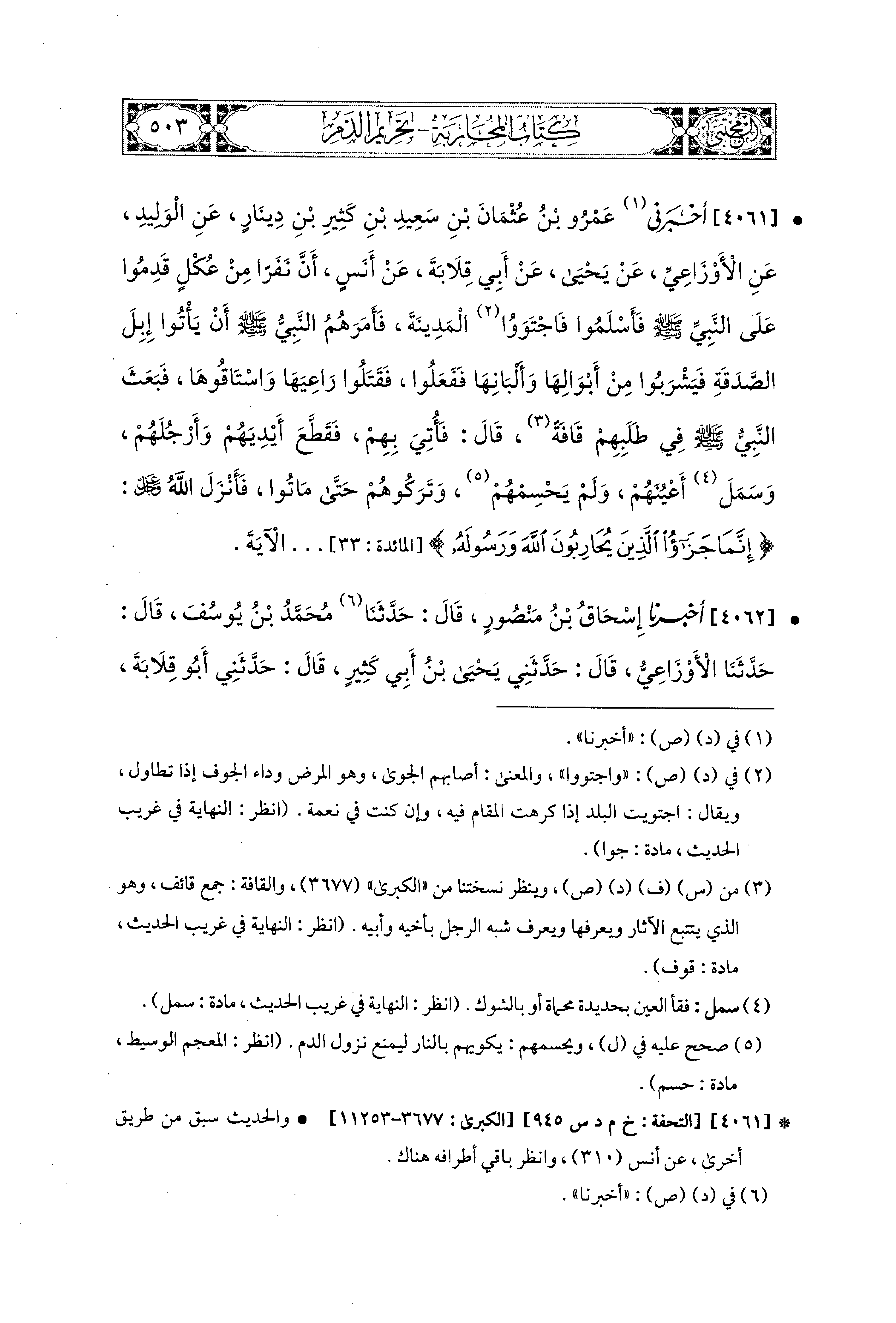 4061 - أَخْبَرَني عَمْرُو بْنُ عُثمَانَ بْنِ سَعيدِ بْنِ كَثِيرِ بْنِ دِينَارٍ، عَنِ الوَلِيدِ، عَنِ الأَوْزَاعِيِّ، عَن يَحيَى، عَن أَبِي قِلاَبَةَ، عَن أَنَسٍ، أَنَّ نَفَرًا مِنْ عُكْلٍ قَدِمُوا عَلَى النَّبيِّ صَلى الله عَليه وسَلم, فأسلموا فَاجْتَوَوْا المَدِينَةَ، فَأَمَرَهُمُ النَّبيُّ صَلى الله عَليه وسَلم أَنْ يَأْتُوا إِبِلَ الصَّدَقَةِ، فَيَشْرَبُوا مِنْ أَبْوَالِهَا وَأَلْبَانِهَا، فَفَعَلُوا فَقَتَلُوا رَاعِيَهَا وَاسْتَاقُوهَا، فَبَعَثَ النَّبيُّ صَلى الله عَليه وسَلم فِي طَلَبِهِمْ، قَالَ: فَأُتِيَ بِهِمْ، فَقَطَّعَ أَيْدِيَهُمْ وَأَرْجُلَهُمْ، وَسَمل أَعْيُنَهُمْ، وَلَمْ يَحْسِمْهُمْ وَتَرَكَهُمْ حَتَّى مَاتُوا، فَأَنْزَلَ اللهُ عَزَّ وَجَلَّ: {إِنَّمَا جَزَاءُ الَّذِينَ يُحَارِبُونَ اللهَ وَرَسُولَهُ} الآيَةَ.