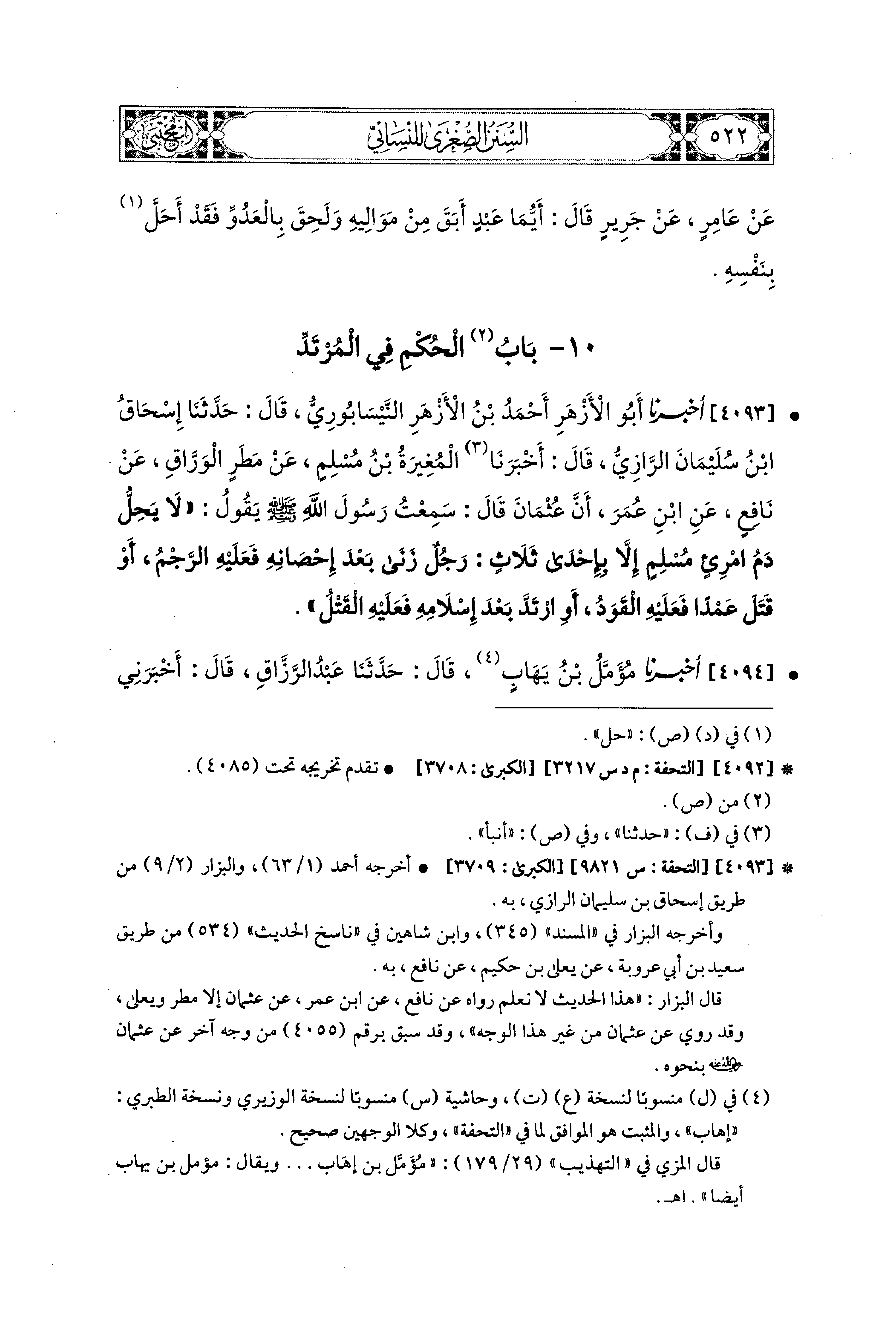 4094 - أَخبَرَنا مُؤَمَّلُ بْنُ إِهَابٍ، قال: حَدثنا عَبدُ الرَّزَّاقِ، قَالَ: أَخْبَرَني ابْنُ جُرَيْجٍ, عَن أَبِي النَّضْرِ، عَن بُسْرِ بْنِ سَعيدٍ، عَن عُثمَانَ بْنِ عَفَّانَ، قَالَ: سَمِعْتُ رَسُولَ اللهِ صَلى الله عَليه وسَلم يَقُولُ: لاَ يَحِلُّ دَمُ امْرِئٍ مُسْلِمٍ إِلاَّ بِثَلاَثٍ (1): أَنْ يَزْنيَ بَعْدَ مَا أُحْصِنَ، أَوْ يَقْتُلَ إِنْسَانًا فَيُقْتَلُ، أَوْ يَكْفُرَ بَعْدَ إِسْلاَمِهِ فَيُقْتَلُ.