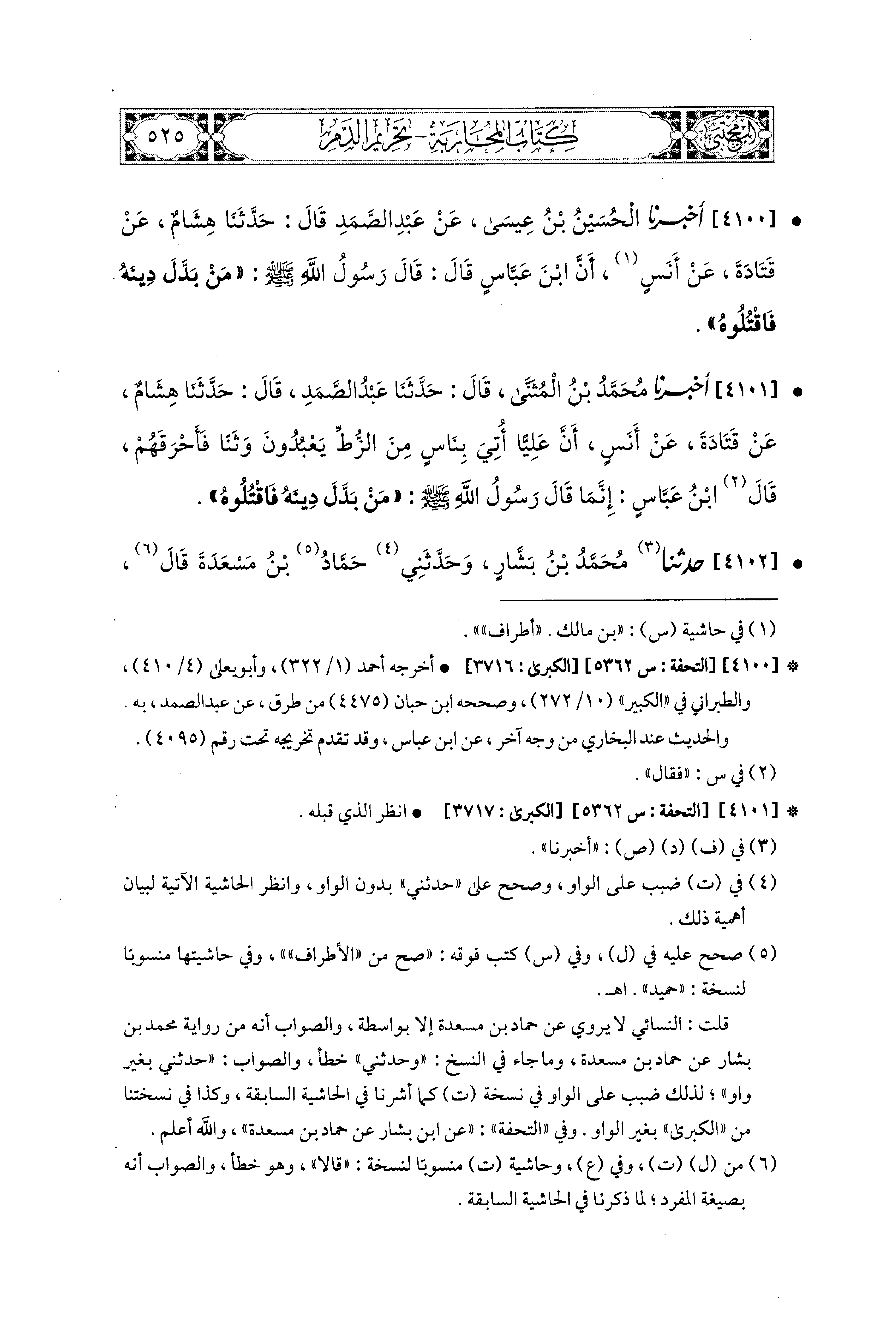 4100 - أَخبَرَنا الحُسَيْنُ بْنُ عِيسَى، عَن عَبدِ الصَّمَدِ، قال: حَدثنا هِشَامٌ، عَن قَتَادَةَ، عَن أَنَسٍ، أَنَّ ابْنَ عَبَّاسٍ، قَالَ: قَالَ رَسُولُ اللهِ صَلى الله عَليه وسَلم: مَنْ بَدَّلَ دِينَهُ فَاقْتُلُوهُ.