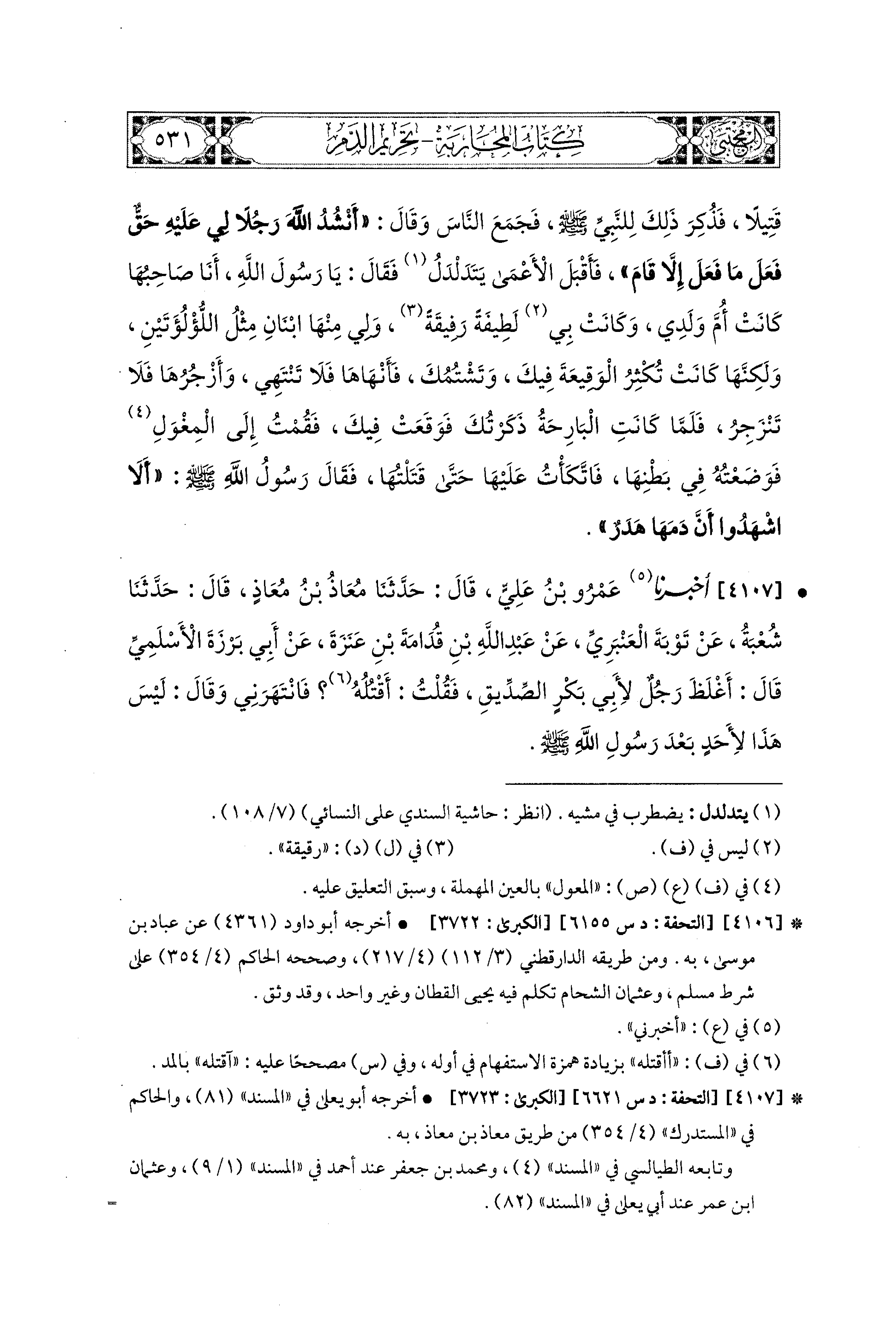 4107 - أَخبَرَنا عَمْرُو بْنُ عَلِيٍّ، قال: حَدثنا مُعَاذُ بْنُ مُعَاذٍ، قال: حَدثنا شُعْبَةُ، عَن تَوْبَةَ العَنْبَرِيِّ، عَن عَبد اللهِ بن قُدَامَةَ بْنِ عَنَزَةَ، عَن أَبِي بَرْزَةَ الأَسْلَميِّ قَالَ: أَغْلَظَ رَجُلٌ لأَبِي بَكْرٍ الصِّدِّيقِ، فَقُلْتُ: أَقْتُلُهُ، فَانْتَهَرَني، وَقَالَ: لَيْسَ هَذَا لأَحَدٍ بَعْدَ رَسُولِ اللهِ صَلى الله عَليه وسَلم.