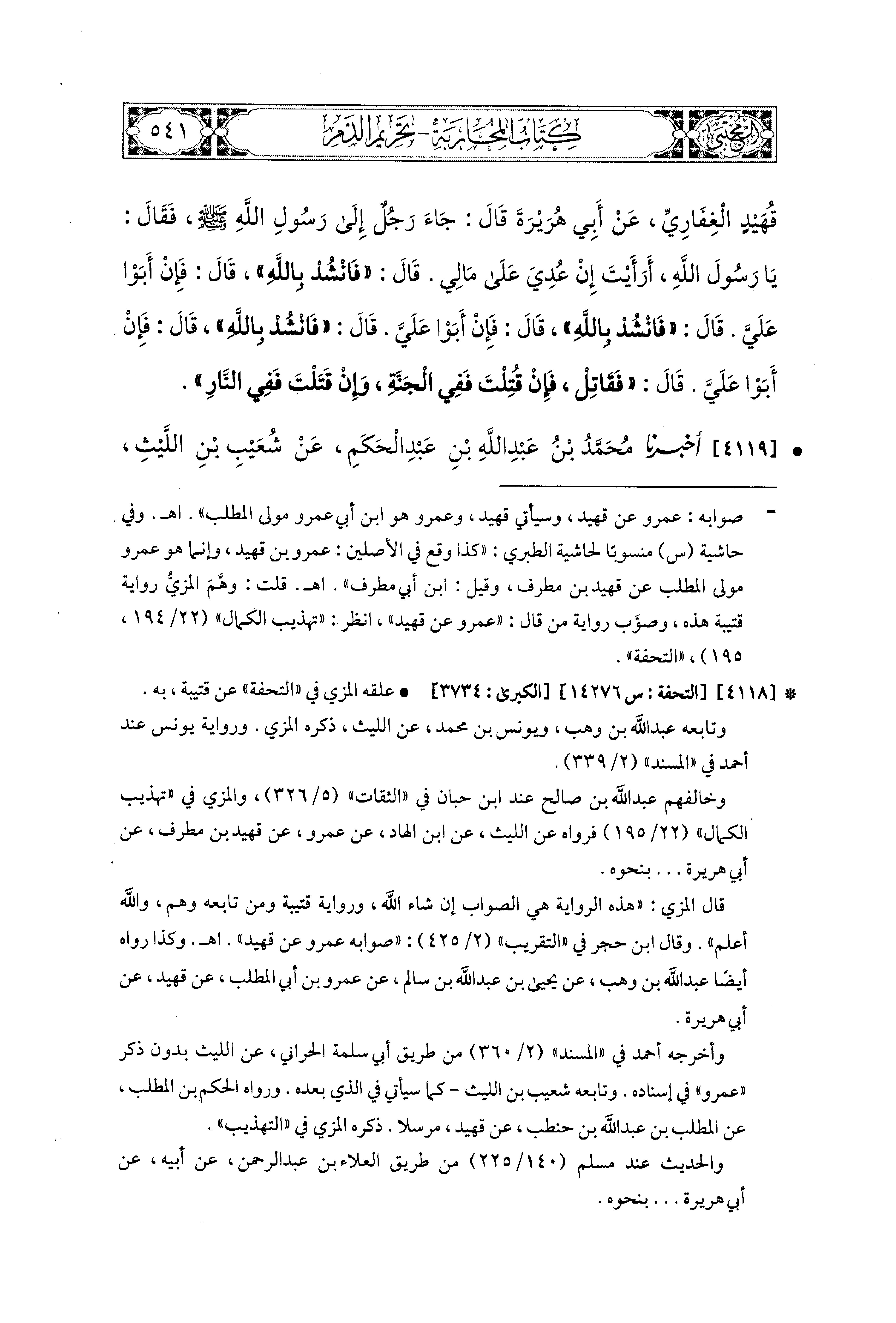 4119 - أَخبَرَنا مُحَمد بْنُ عَبدِ اللهِ بْنِ عَبدِ الحَكَمِ، عَن شُعَيبِ بْنِ اللَّيْثِ، قَالَ: أَخبَرنا اللَّيْثُ، عَنِ ابنِ الهَادِ، عَن قُهَيْدِ بْنِ مُطَرِّفٍ الغِفَارِيِّ، عَن أَبِي هُرَيرَةَ، أَنَّ رَجُلاً جَاءَ إِلَى رَسُولِ اللهِ صَلى الله عَليه وسَلم فَقَالَ: يَا رَسُولَ اللهِ، أَرَأَيْتَ إِنْ عُدِيَ عَلَى مَالِي؟ قَالَ: فَانْشُدْ بِالله، قَالَ: فَإِنْ أَبَوْا عَلَيَّ؟ قَالَ: فَانْشُدْ بِالله، قَالَ: فَإِنْ أَبَوْا عَلَيَّ؟ قَالَ: فَانْشُدْ بِالله، قَالَ: فَإِنْ أَبَوْا عَلَيَّ؟ قَالَ: فَقَاتِلْ، فَإِنْ قُتِلْتَ فَفِي الجَنَّةِ، وَإِنْ قَتَلْتَ فَفِي النَّارِ.
