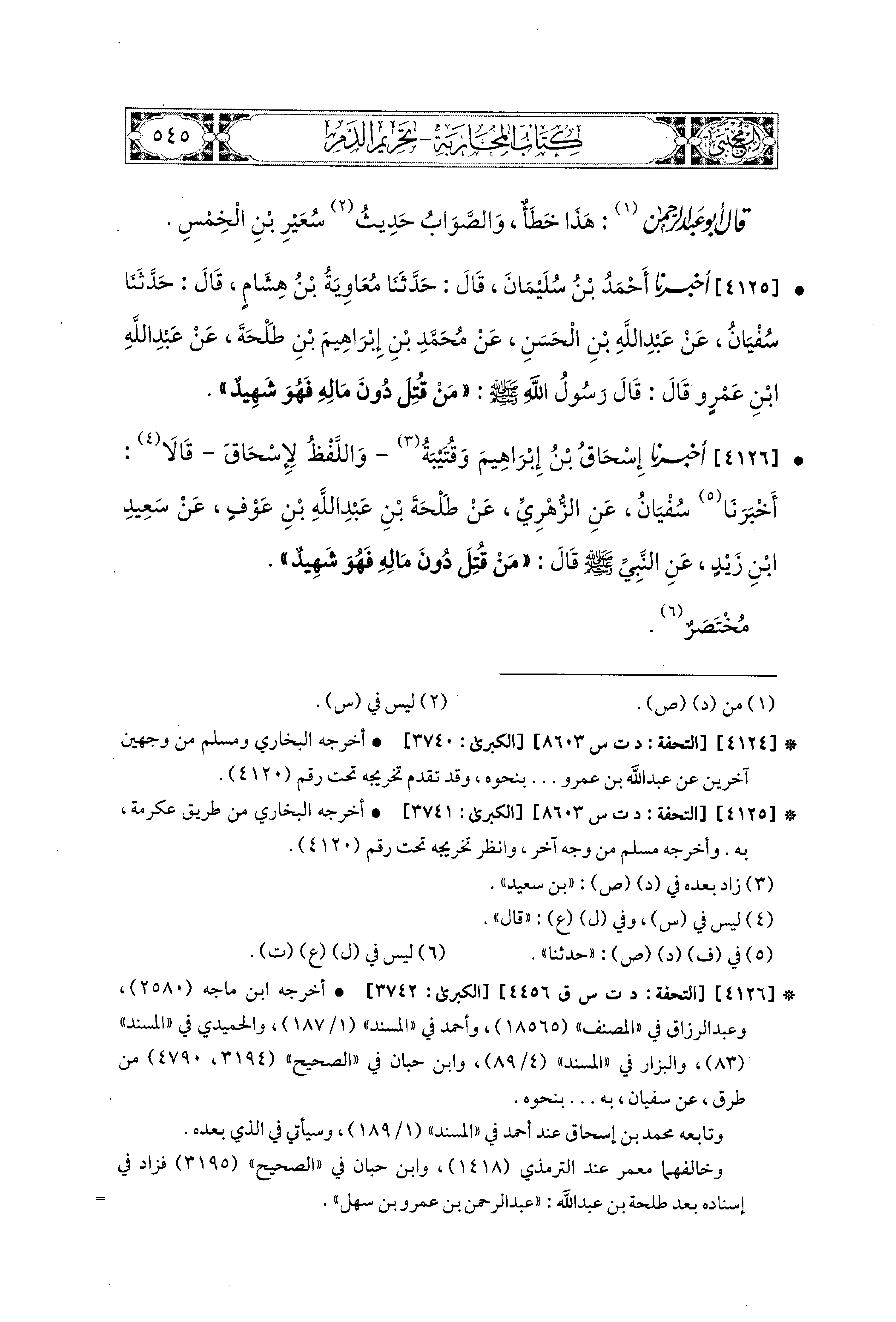 4125 - أَخبَرَنا أَحْمَدُ بْنُ سُلَيمَانَ، قال: حَدثنا مُعَاوِيَةُ بْنُ هِشَامٍ، قال: حَدثنا سُفْيَانُ، عَن عَبد اللهِ بن الحَسَنِ، عَن مُحَمدِ بْنِ إِبراهِيمَ بْنِ طَلْحَةَ، عَن عَبد اللهِ بن عَمْرٍو قَالَ: قَالَ رَسُولُ اللهِ صَلى الله عَليه وسَلم: مَنْ قُتِلَ دُونَ مَالِهِ فَهُوَ شَهِيدٌ.
