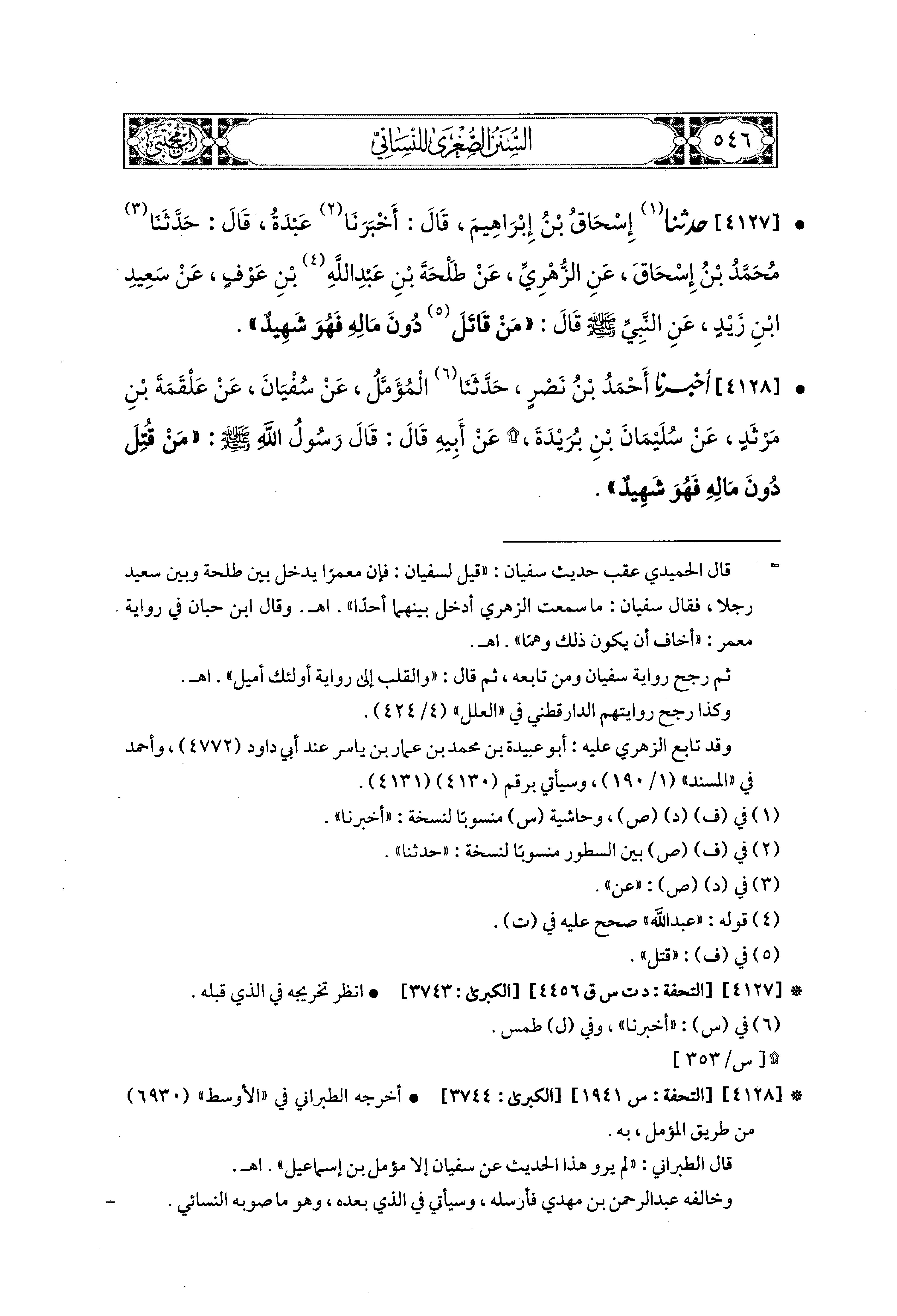 4128 - أَخبَرَنا أَحْمَدُ بْنُ نَصْرٍ، حَدثنا المُؤَمَّلُ، عَن سُفْيَانَ، عَن عَلْقَمَةَ بْنِ مَرْثَدٍ، عَن سُلَيمَانَ بْنِ بُرَيْدَةَ، عَن أَبِيهِ، قَالَ: قَالَ رَسُولُ اللهِ صَلى الله عَليه وسَلم: مَنْ قُتِلَ دُونَ مَالِهِ فَهُوَ شَهِيدٌ.