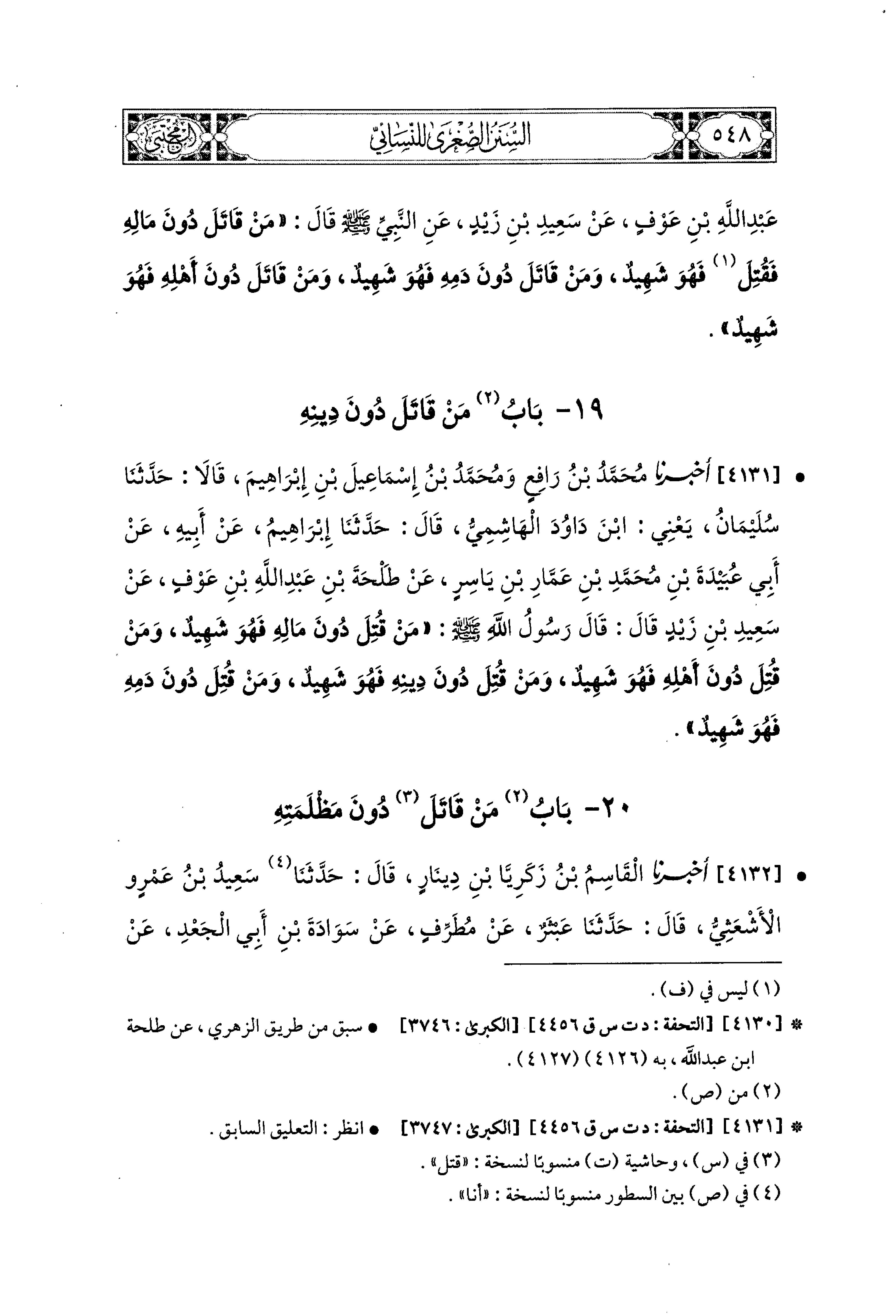 4131 - أَخبَرَنا مُحَمد بْنُ رَافِعٍ، وَمُحَمدُ بْنُ إِسماعِيلَ بْنِ إِبراهِيمَ قَالاَ: حَدَّثَنَا سُلَيمَانُ، يَعْني ابْنَ دَاوُدَ الهَاشِميُّ، قال: حَدثنا إِبراهِيمُ، عَن أَبِيهِ، عَن أَبِي عُبَيدَةَ بْنِ مُحَمدِ بْنِ عَمَّارِ بْنِ يَاسِرٍ، عَن طَلْحَةَ بْنِ عَبدِ اللهِ بْنِ عَوْفٍ، عَن سَعيدِ بْنِ زَيْدٍ قَالَ: قَالَ رَسُولُ اللهِ صَلى الله عَليه وسَلم: مَنْ قُتِلَ دُونَ مَالِهِ فَهُوَ شَهِيدٌ، وَمَنْ قُتِلَ دُونَ أَهْلِهِ فَهُوَ شَهِيدٌ، وَمَنْ قُتِلَ دُونَ دِينِهِ فَهُوَ شَهِيدٌ، وَمَنْ قُتِلَ دُونَ دَمِهِ فَهُوَ شَهِيدٌ.