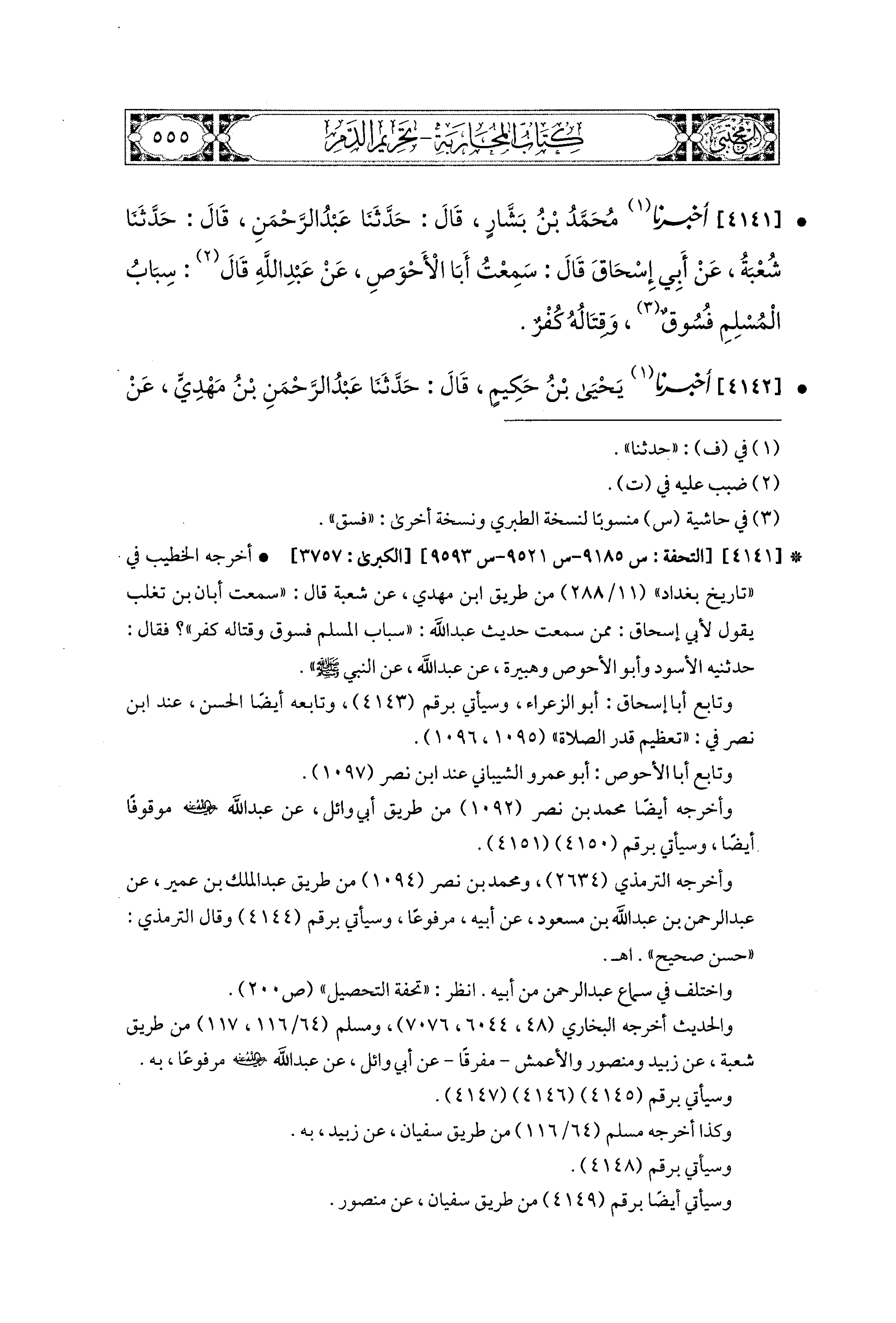 4141 - أَخبَرَنا مُحَمد بْنُ بَشَّارٍ، قال: حَدثنا عَبدُ الرَّحمَنِ، قال: حَدثنا شُعْبَةُ، عَن أَبِي إِسحَاقَ، قَالَ: سَمِعْتُ أَبَا الأَحْوَصِ، عَن عَبدِ اللهِ قَالَ: سِبَابُ المُسْلِمِ فُسُوقٌ، وَقِتَالُهُ كُفْرٌ.