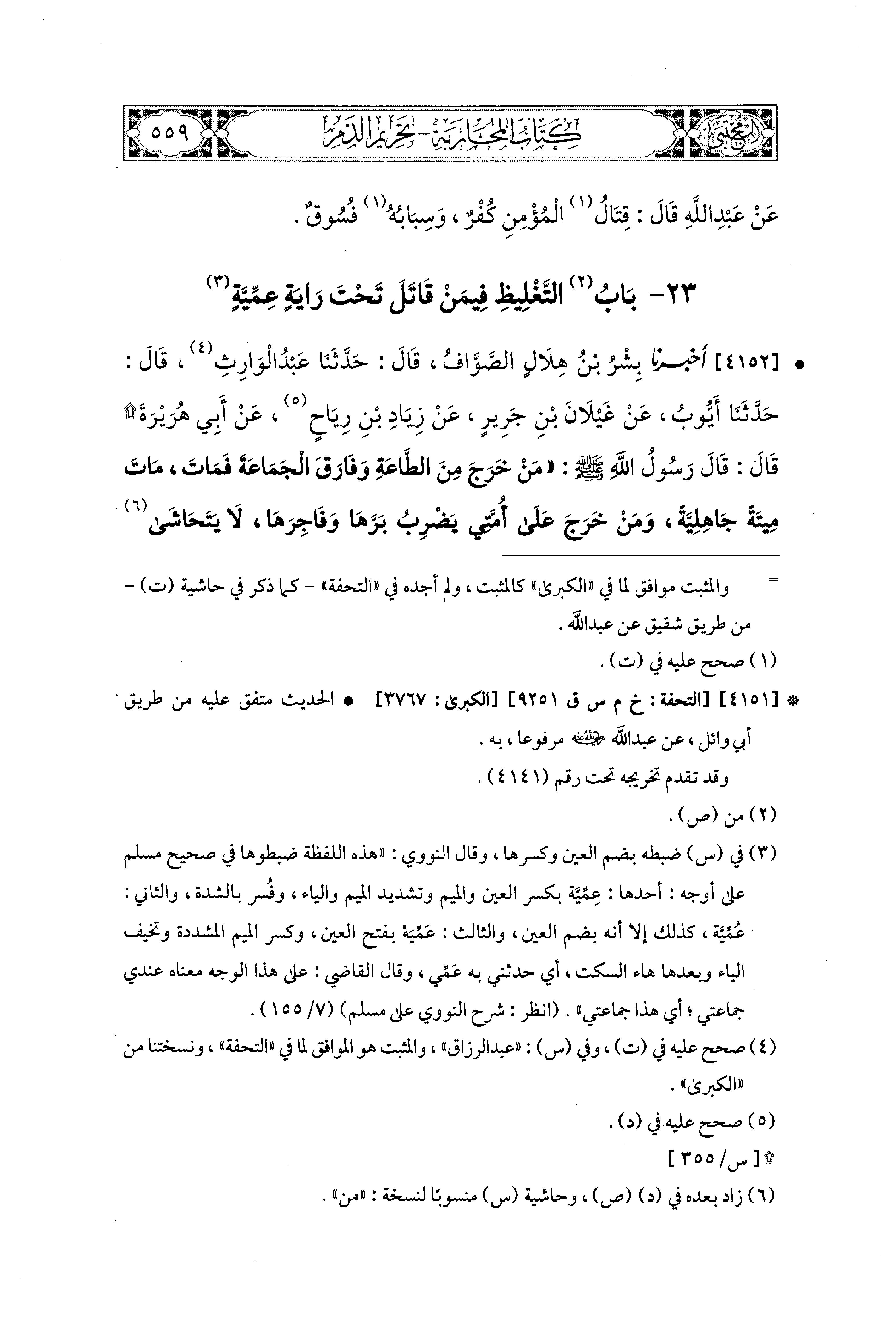 4152 - أَخبَرَنا بِشْرُ بْنُ هِلاَلٍ الصَّوَّافُ، قال: حَدثنا عَبدُ الوَارِثِ، قال: حَدثنا أَيُّوبُ، عَن غَيْلاَنَ بْنِ جَرِيرٍ، عَن زِيَادِ بْنِ رِيَاحٍ، عَن أَبِي هُرَيرَةَ قَالَ: قَالَ رَسُولُ اللهِ صَلى الله عَليه وسَلم: مَنْ خَرَجَ مِنَ الطَّاعَةِ، وَفَارَقَ الجَمَاعَةَ فَمَاتَ مَاتَ ميتَةً جَاهِلِيَّةً، وَمَنْ خَرَجَ عَلَى أُمَّتِي يَضْرِبُ بَرَّهَا، وَفَاجِرَهَا لاَ يَتَحَاشَى مِنْ مُؤْمِنِهَا، وَلاَ يَفِي لِذِي عَهْدِهَا فَلَيْسَ مِنِّي، وَمَنْ قَاتَلَ تَحْتَ رَايَةٍ عُمِّيَّةٍ، يَدْعُو إِلَى عَصَبِيَّةٍ، أَوْ يَغْضَبُ لِعَصَبِيَّتة فَقُتِلَ فَقِتْلَةٌ جَاهِلِيَّةٌ.