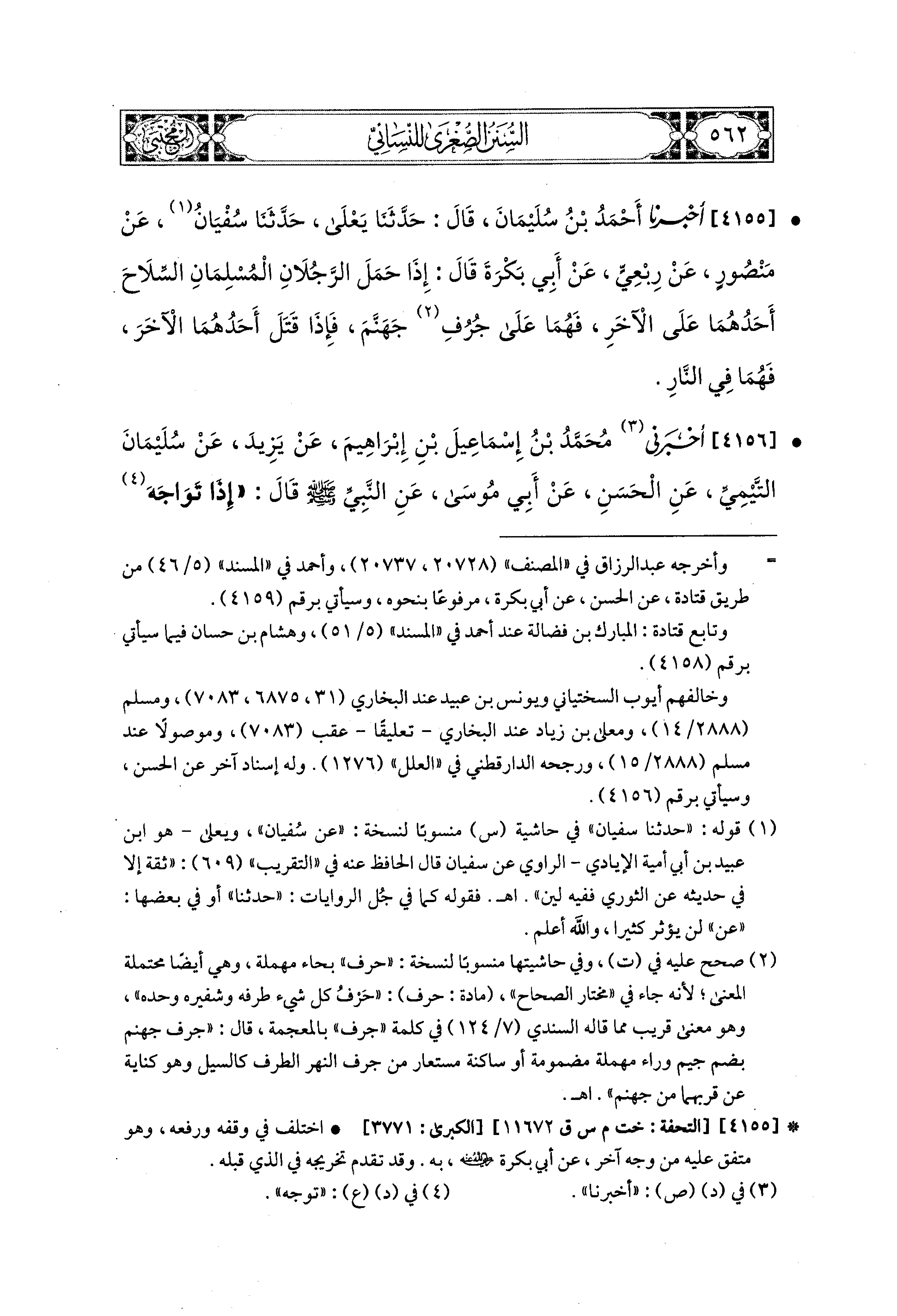 4155 - أَخبَرَنا أَحْمَدُ بْنُ سُلَيمَانَ، قال: حَدثنا يَعْلَى، قال: حَدثنا سُفْيَانُ، عَن مَنْصُورٍ، عَن رِبْعِيٍّ، عَن أَبِي بَكْرَةَ قَالَ: إِذَا حَمَلَ الرَّجُلاَنِ المُسْلِمَانِ السِّلاَحَ أَحَدُهُمَا عَلَى الآخَرِ، فَهُمَا عَلَى جُرُفِ جَهَنَّمَ، فَإِذَا قَتَلَ أَحَدُهُمَا الآخَرَ فَهُمَا فِي النَّارِ.