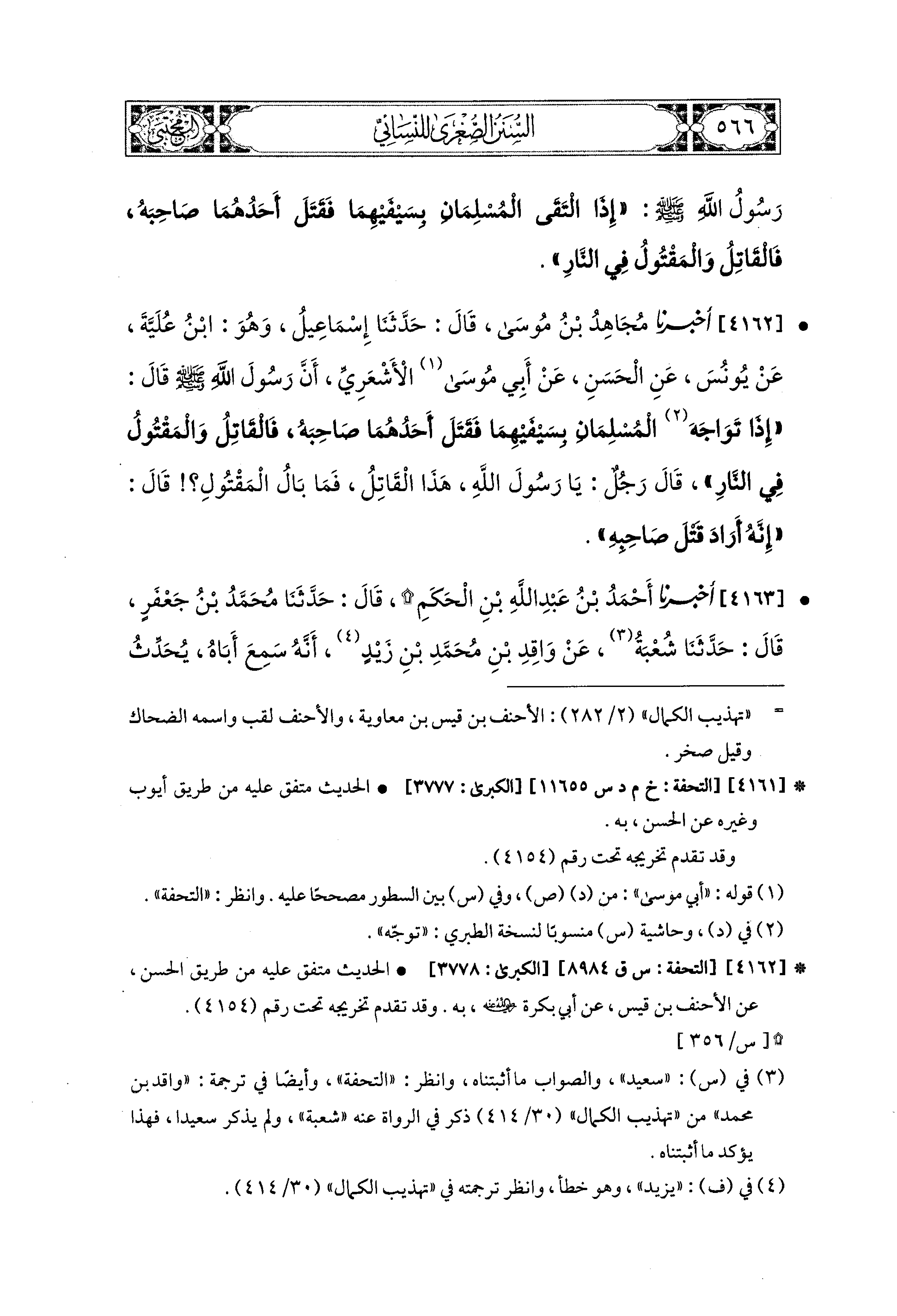 4162 - أَخبَرَنا مُجَاهِدُ بْنُ مُوسَى، قال: حَدثنا إِسماعِيلُ، وَهُوَ ابْنُ عُلَيَّةَ، عَن يُونُسَ، عَنِ الحَسَنِ، عَن أَبِي مُوسَى الأَشْعَرِيِّ، أَنَّ رَسُولَ اللهِ صَلى الله عَليه وسَلم قَالَ: إِذَا تَوَاجَهَ المُسْلِمَانِ بِسَيْفَيْهِمَا، فَقَتَلَ أَحَدُهُمَا صَاحِبَهُ، فَالقَاتِلُ وَالمَقْتُولُ فِي النَّارِ، قَالَ رَجُلٌ: يَا رَسُولَ اللهِ، هَذَا القَاتِلُ فَمَا بَالُ المَقْتُولِ؟ قَالَ: إِنَّهُ أَرَادَ قَتْلَ صَاحِبِهِ.