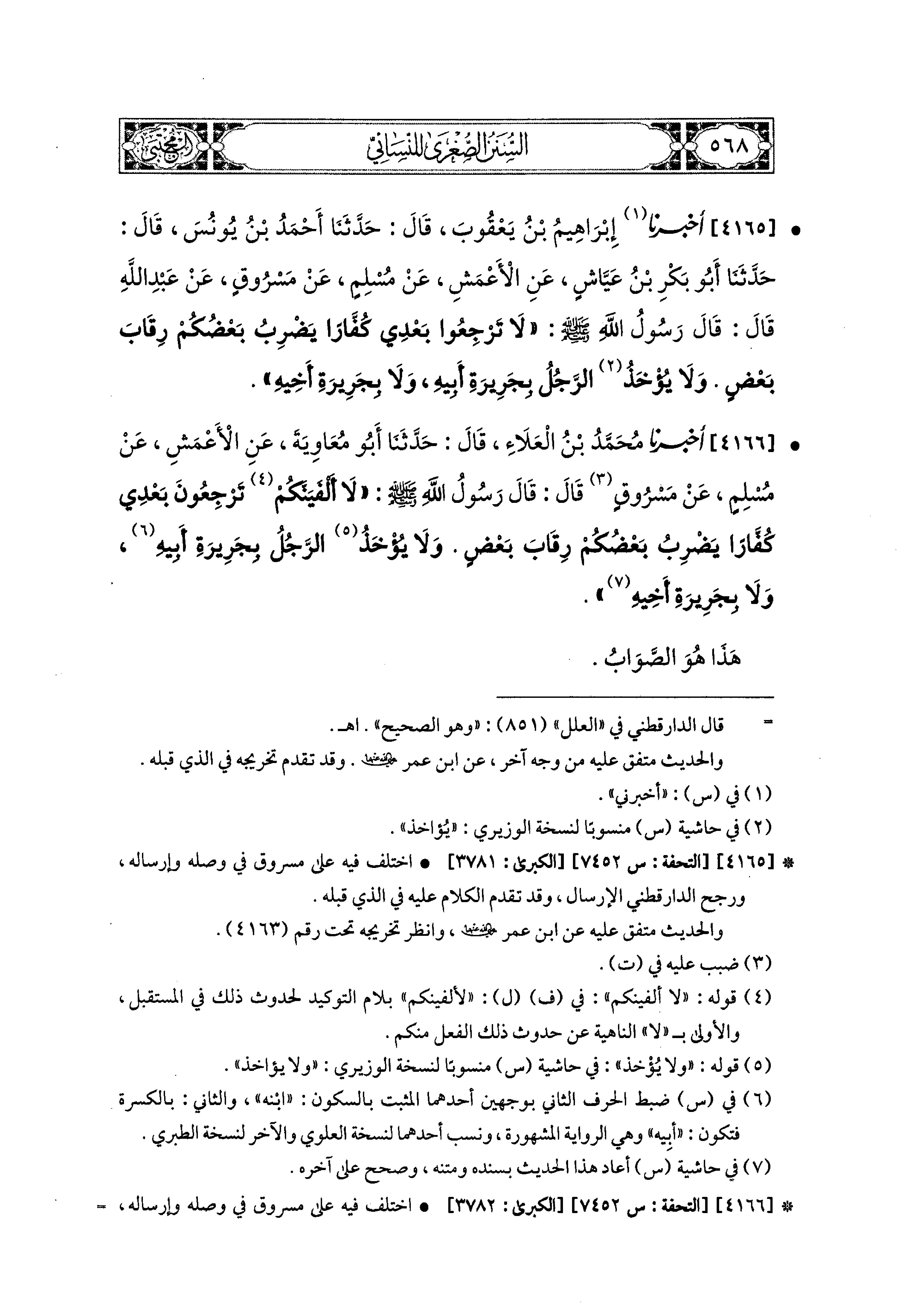 4165 - أَخبَرَنا إِبراهِيمُ بْنُ يَعْقُوبَ، قال: حَدثنا أَحْمَدُ بْنُ يُونُسَ، قال: حَدثنا أَبو بَكْرِ بْنُ عَيَّاشٍ، عَنِ الأَعْمَشِ، عَن مُسْلِمٍ، عَن مَسْرُوقٍ، عَن عَبدِ اللهِ قَالَ: قَالَ رَسُولُ اللهِ صَلى الله عَليه وسَلم: لاَ تَرْجِعُوا بَعْدِي كُفَّارًا، يَضْرِبُ بَعْضُكُمْ رِقَابَ بَعْضٍ، وَلاَ يُؤْخَذُ الرَّجُلُ بِجَرِيرَةِ أَبِيهِ، وَلاَ بِجَرِيرَةِ أَخِيهِ.