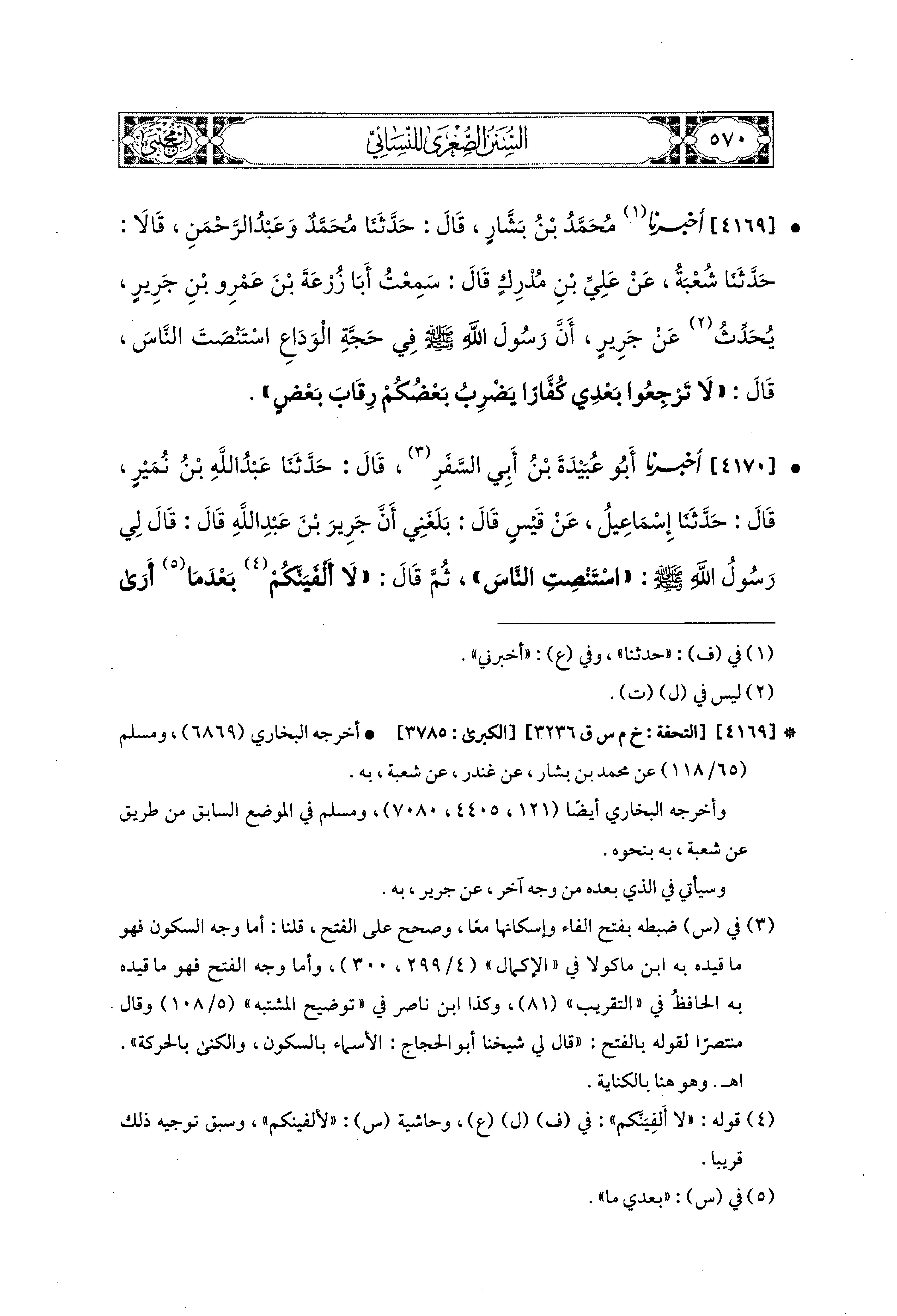 4169 - أَخبَرَنا مُحَمد بْنُ بَشَّارٍ، قال: حَدثنا مُحَمدٌ، وَعَبدُ الرَّحمَنِ قَالاَ: حَدَّثَنَا شُعْبَةُ، عَن عَلِيِّ بْنِ مُدْرِكٍ، قَالَ: سَمِعْتُ أَبَا زُرْعَةَ بْنَ عَمْرِو بْنِ جَرِيرٍ، يحدث عَن جَرِيرٍ، أَنَّ رَسُولَ اللهِ صَلى الله عَليه وسَلم فِي حَجَّةِ الوَدَاعِ اسْتَنْصَتَ النَّاسَ، قَالَ: لاَ تَرْجِعُوا بَعْدِي كُفَّارًا، يَضْرِبُ بَعْضُكُمْ رِقَابَ بَعْضٍ.