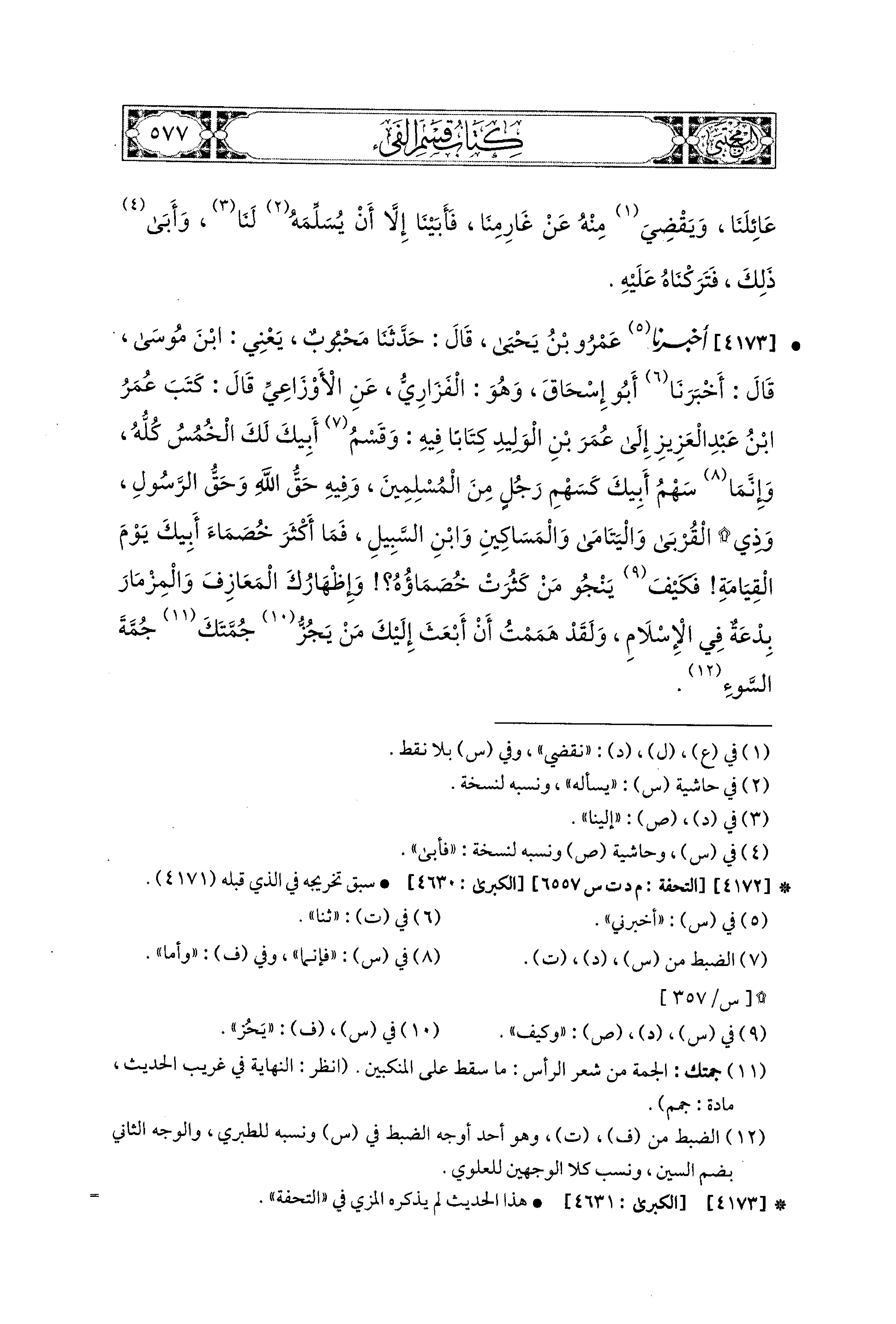 4173 - أَخبَرَنا عَمْرُو بْنُ يَحيَى، قال: حَدثنا مَحْبُوبٌ، يَعْني ابْنَ مُوسَى، قَالَ: أَخبَرنا أَبو إِسحَاقَ وَهُوَ الفَزَارِيُّ، عَنِ الأَوْزَاعِيِّ قَالَ: كَتَبَ عُمَرُ بْنُ عَبدِ العَزِيزِ إِلَى عُمَرَ بْنِ الوَلِيدِ كِتَابًا فِيهِ: وَقَسْمُ أَبِيكَ لَكَ الخُمُسُ كُلُّهُ، وَإِنَّمَا سَهْمُ أَبِيكَ كَسَهْمِ رَجُلٍ مِنَ المُسْلِمينَ، وَفِيهِ حَقُّ اللهِ، وَحَقُّ الرَّسُولِ، وَذِي القُرْبَى، وَاليَتَامَى، وَالمَسَاكِينِ، وَابْنِ السَّبِيلِ، فَمَا أَكْثَرَ خُصَمَاءَ أَبِيكَ يَوْمَ القِيَامَةِ، فَكَيْفَ يَنْجُو مَنْ كَثُرَتْ خُصَمَاؤُهُ، وَإِظْهَارُكَ المَعَازِفَ، وَالمِزْمَارَ بِدْعَةٌ فِي الإِسْلاَمِ، وَلَقَدْ هَمَمْتُ أَنْ أَبْعَثَ إِلَيْكَ مَنْ يَجُزُّ جُمَّتَكَ جُمَّةَ السُّوءِ.