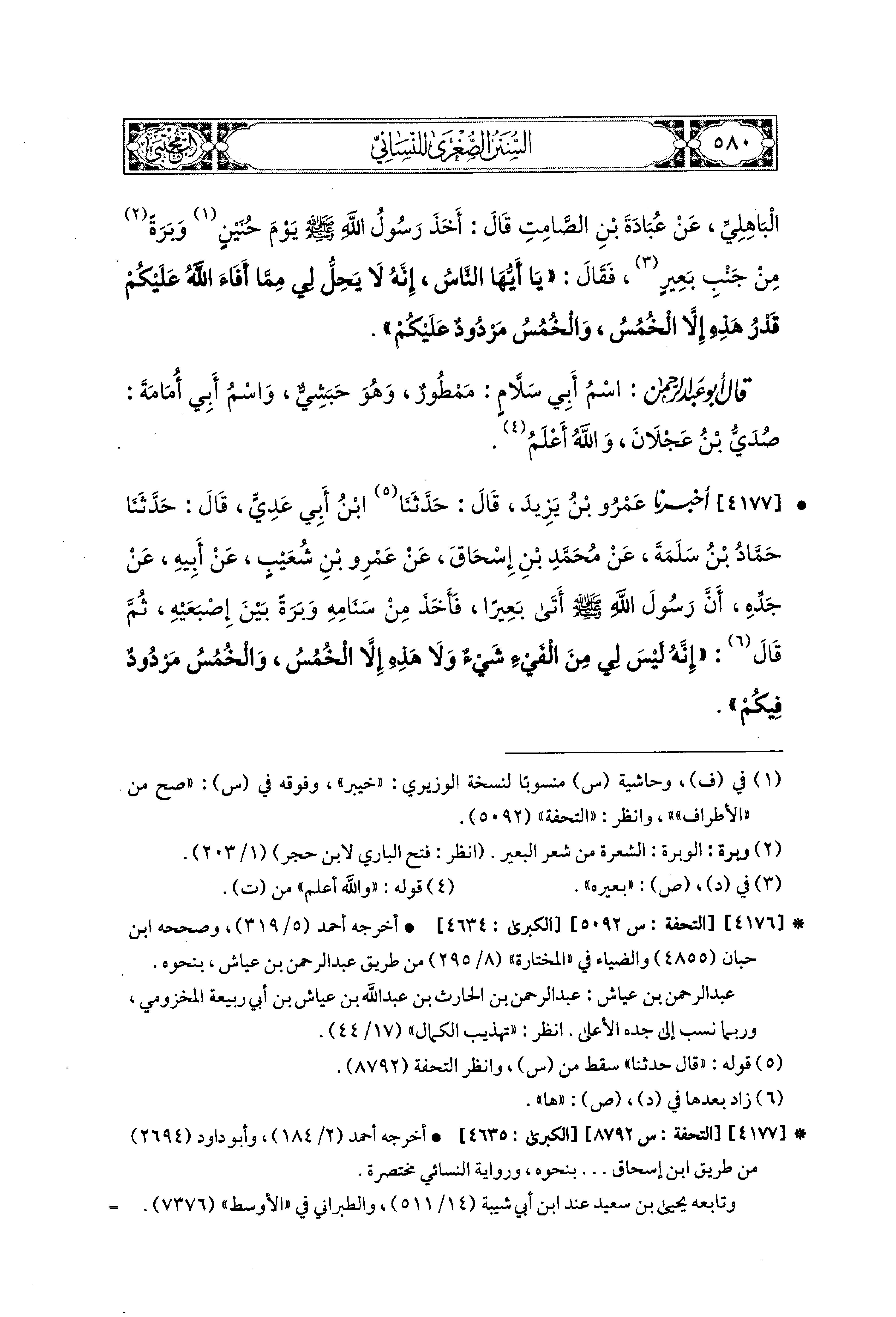 4177- أَخبَرَنا عَمْرُو بْنُ يَزِيدَ، قال: حَدثنا ابْنُ أَبِي عَدِيٍّ، قال: حَدثنا حَمَّادُ بْنُ سَلَمَةَ، عَن مُحَمدِ بْنِ إِسحَاقَ، عَن عَمْرِو بْنِ شُعَيبٍ، عَن أَبِيهِ، عَن جَدِّهِ، أَنَّ رَسُولَ اللهِ صَلى الله عَليه وسَلم أَتَى بَعِيرًا فَأَخَذَ مِنْ سَنَامِهِ وَبَرَةً بَيْنَ إِصْبَعَيْهِ، ثُمَّ قَالَ: إِنَّهُ لَيْسَ لِي مِنَ الفَيْءِ شَيْءٌ وَلاَ هَذِهِ إِلاَّ الخُمُسُ، وَالخُمُسُ مَرْدُودٌ فِيكُمْ.