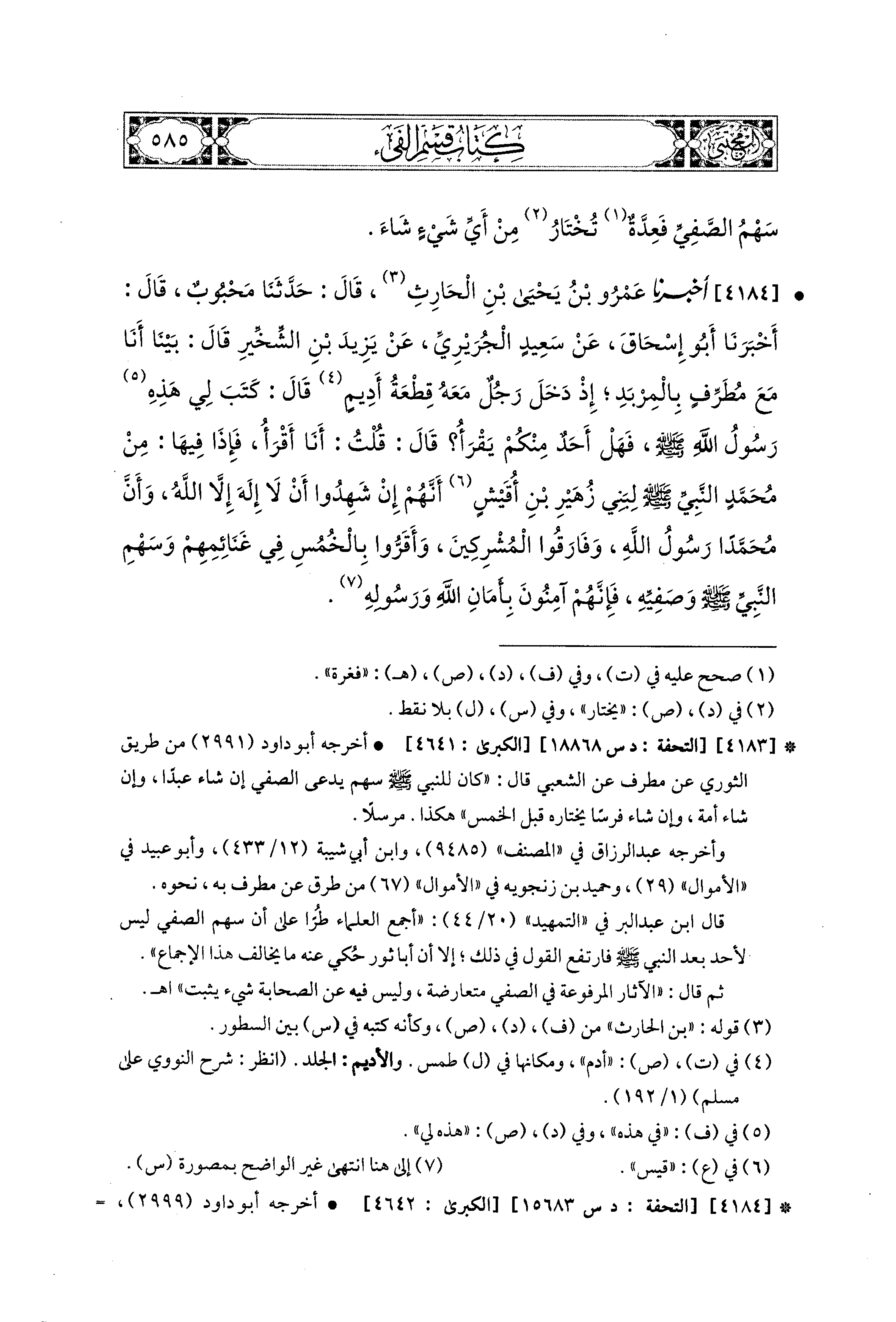 4184- أَخبَرَنا عَمْرُو بْنُ يَحيَى بن الحارث، قال: حَدثنا مَحْبُوبٌ، قَالَ: أَخبَرنا أَبو إِسحَاقَ، عَن سَعيدٍ الجُرَيْرِيِّ، عَن يَزِيدَ بْنِ الشِّخِّيرِ قَالَ: بَيْنَا أَنَا مَعَ مُطَرِّفٍ بِالمِرْبَدِ إِذْ دَخَلَ رَجُلٌ، مَعَهُ قِطْعَةُ أديمٍ، قَالَ: كَتَبَ لِي هَذِهِ رَسُولُ اللهِ صَلى الله عَليه وسَلم فَهَلْ أَحَدٌ مِنْكُمْ يَقْرَأُ؟ قَالَ: قُلْتُ: أَنَا أَقْرَأُ، فَإِذَا فِيهَا: مِنْ مُحَمدٍ النَّبيِّ صَلى الله عَليه وسَلم لِبَني زُهَيْرِ بْنِ أُقَيْشٍ، أَنَّهُمْ إِنْ شَهِدُوا أَنْ لاَ إِلَهَ إِلاَّ اللهُ، وَأَنَّ مُحَمدًا رَسُولُ اللهِ، وَفَارَقُوا المُشْرِكِينَ، وَأَقَرُّوا بِالخُمُسِ فِي غَنَائِمِهِمْ، وَسَهْمِ النَّبيِّ صَلى الله عَليه وسَلم وَصَفِيِّهِ، فَإِنَّهُمْ آمِنُونَ بِأَمَانِ اللهِ وَرَسُولِهِ.