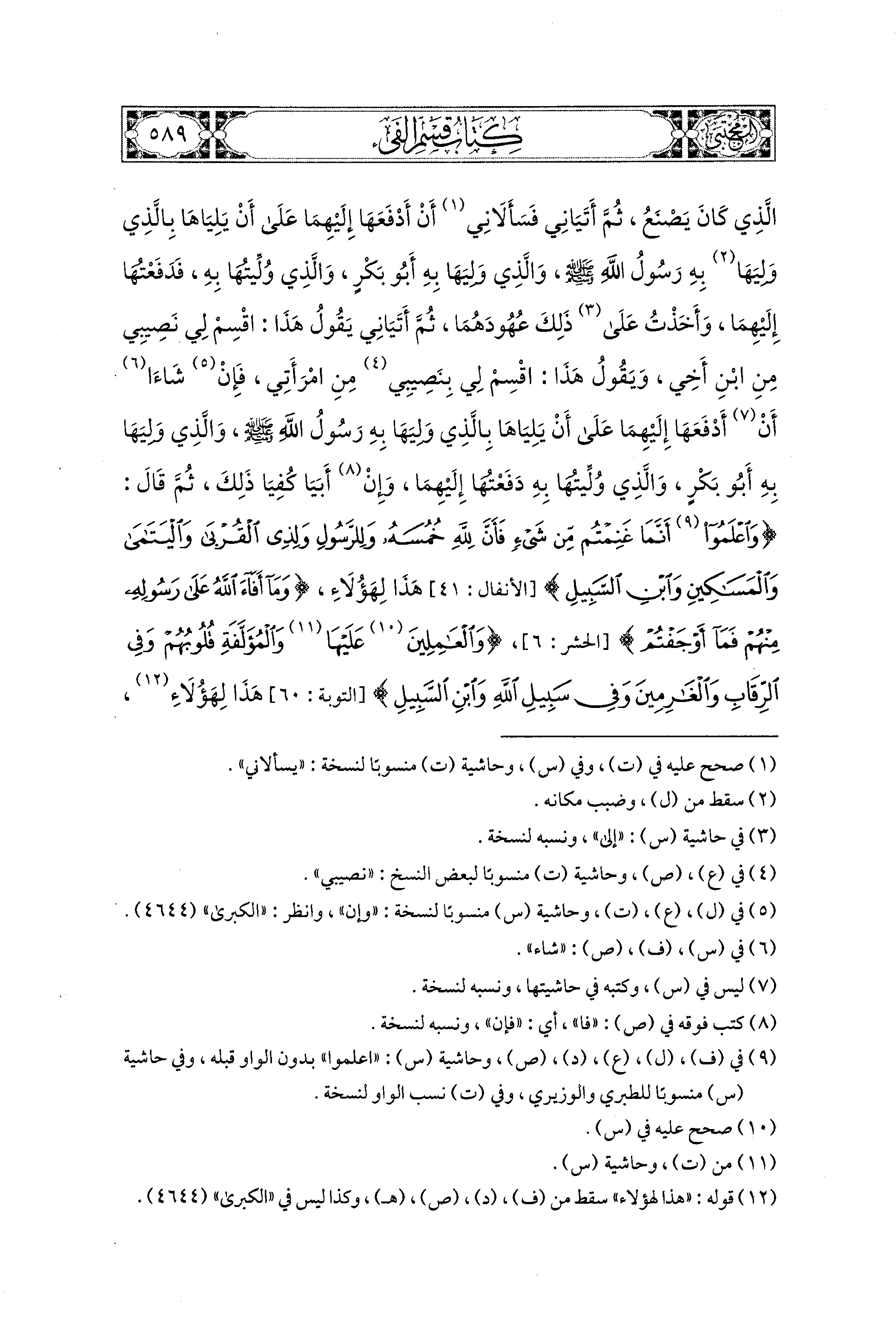 - وجاء في طبعة التأصيل عقب قوله: "هذا لهؤلاء": "{وَمَا أَفَاءَ اللهُ عَلَى رَسُولِهِ مِنْهُمْ فَمَا أَوْجَفْتُمْ عَلَيْهِ مِنْ خَيْلٍ وَلاَ رِكَابٍ} الحشر: 6، {وَالعَامِلِينَ عَلَيْهَا وَالمُؤَلَّفَةِ قُلُوبُهُمْ وَفِي الرِّقَابِ وَالغَارِمينَ وَفِي سَبِيلِ الله وَابْنِ السَّبِيلِ} هذا لهؤلاء" التوبة:60، وهو غير موجود في طبعة المكتبة التجارية (4148), و"السنن الكبرى" طبعة الرسالة (4434).