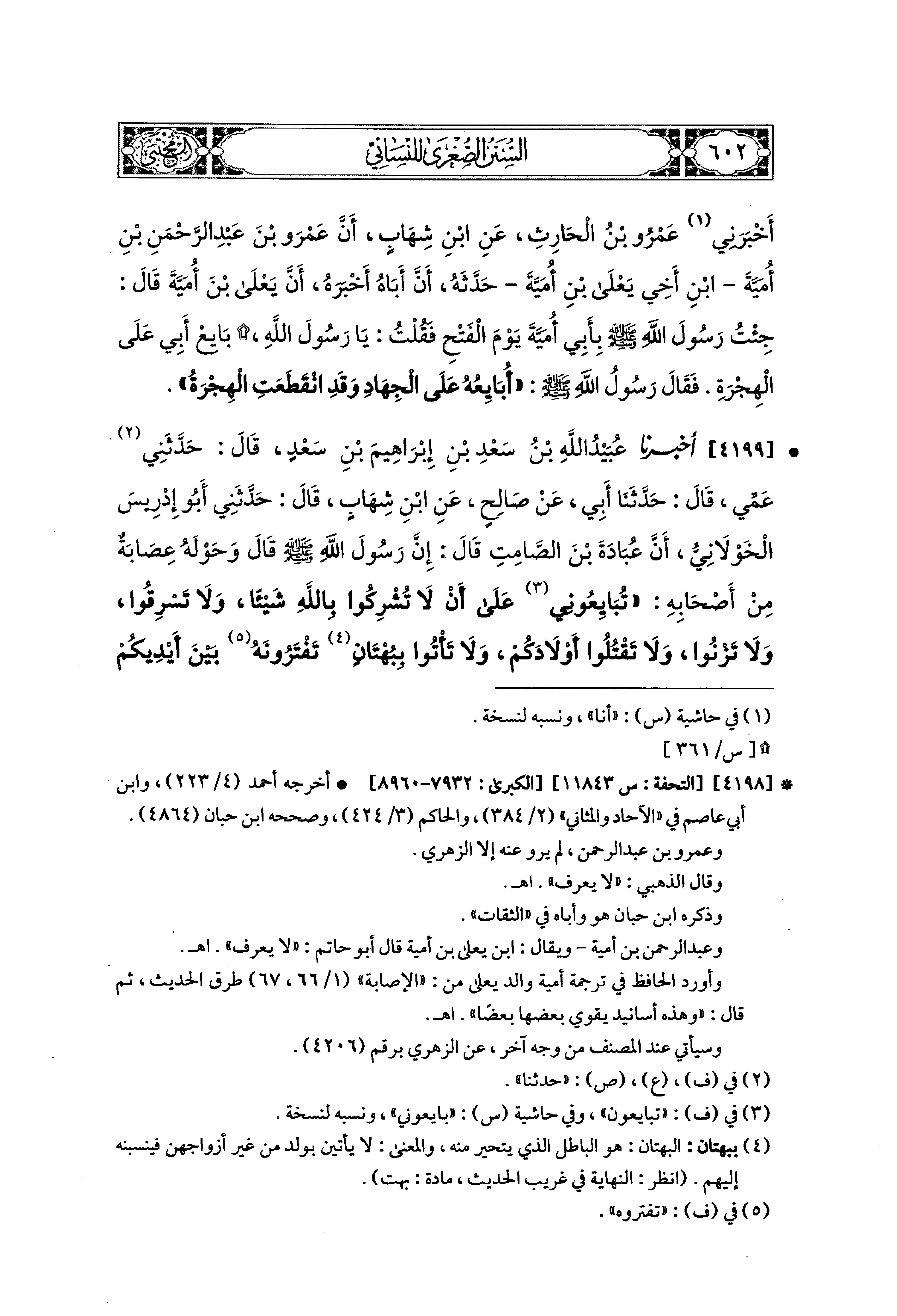 4199- أَخبَرَنا عُبَيدُ اللهِ بْنُ سَعْدِ بْنِ إِبراهِيمَ بْنِ سَعْدٍ، قَالَ: حَدَّثَني عَمِّي، قال: حَدثنا أَبِي، عَن صَالِحٍ، عَنِ ابنِ شِهَابٍ، قَالَ: حَدَّثَني أَبو إِدْرِيسَ الخَوْلاَنيُّ، أَنَّ عُبَادَةَ بْنَ الصَّامِتِ قَالَ: إِنَّ رَسُولَ اللهِ صَلى الله عَليه وسَلم قَالَ وَحَوْلَهُ عِصَابَةٌ مِنْ أَصْحَابِهِ: تُبَايِعُوني عَلَى أَنْ لاَ تُشْرِكُوا بِالله شَيْئًا، وَلاَ تَسْرِقُوا، وَلاَ تَزْنُوا، وَلاَ تَقْتُلُوا أَوْلاَدَكُمْ، وَلاَ تَأْتُوا بِبُهْتَانٍ تَفْتَرُونَهُ بَيْنَ أَيْدِيكُمْ وَأَرْجُلِكُمْ، وَلاَ تَعْصُوني فِي مَعْرُوفٍ، فَمَنْ وَفَّى فَأَجْرُهُ عَلَى اللهِ، وَمَنْ أَصَابَ مِنْكُمْ شَيْئًا فَعُوقِبَ بِهِ في الدنيا، فَهُوَ لَهُ كَفَّارَةٌ، وَمَنْ أَصَابَ مِنْ ذَلِكَ شَيْئًا، ثُمَّ سَتَرَهُ اللهُ عز وجل فَأَمْرُهُ إِلَى اللهِ عز وجل، إِنْ شَاءَ عَفَا عَنْهُ، وَإِنْ شَاءَ عَاقَبَهُ.