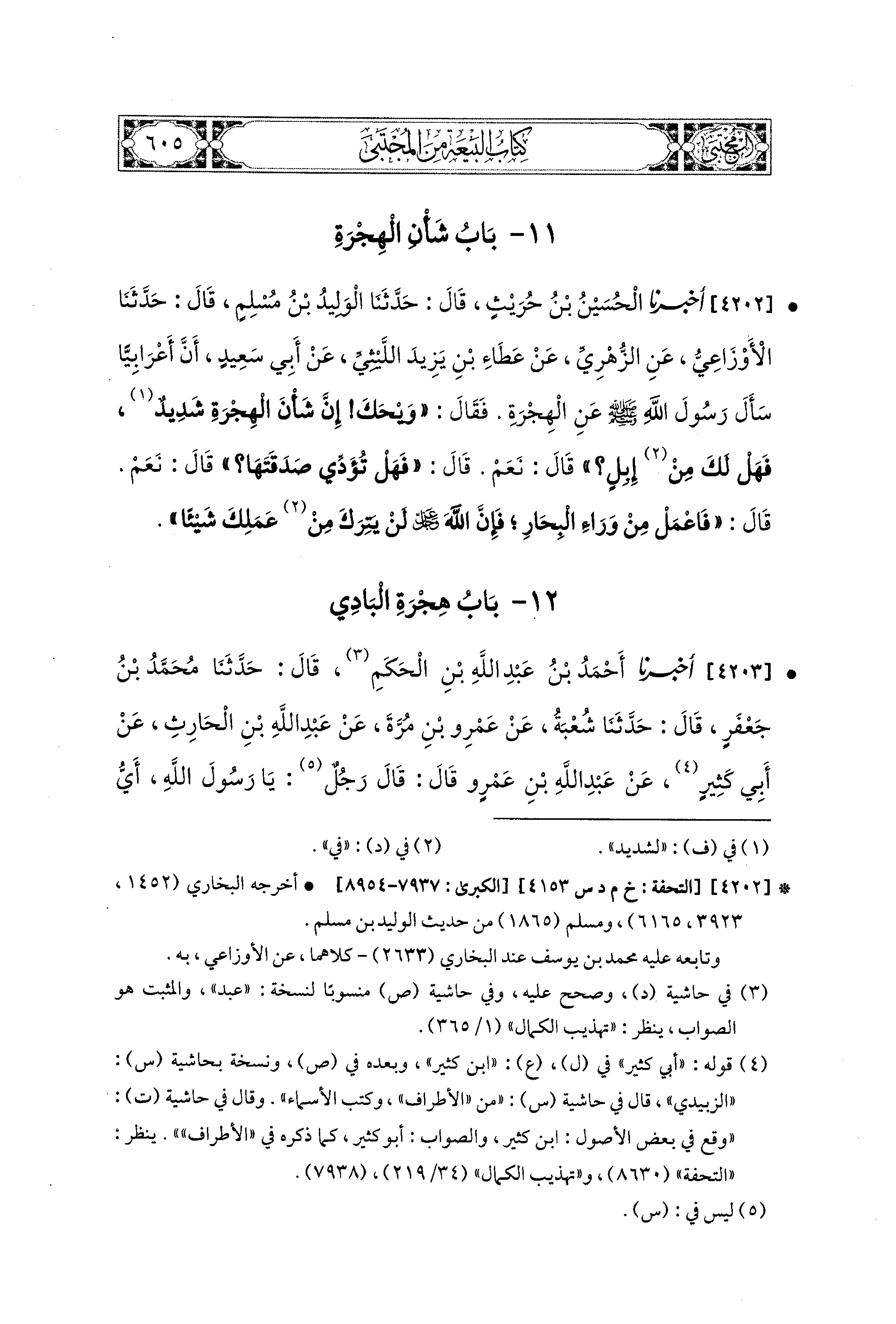 4203- أَخبَرَنا أَحْمَدُ بْنُ عَبدِ اللهِ بْنِ الحَكَمِ، قال: حَدثنا مُحَمدُ بْنُ جَعْفَرٍ، قال: حَدثنا شُعْبَةُ، عَن عَمْرِو بْنِ مُرَّةَ، عَن عَبد اللهِ بن الحَارِثِ، عَن أَبِي كَثِيرٍ، عَن عَبد اللهِ بن عَمْرٍو قَالَ: قَالَ رَجُلٌ: يَا رَسُولَ اللهِ، أَيُّ الهِجْرَةِ أَفْضَلُ؟ قَالَ: أَنْ تَهْجُرَ مَا كَرِهَ رَبُّكَ عَزَّ وَجَلَّ، وَقَالَ رَسُولُ اللهِ صَلى الله عَليه وسَلم: الهِجْرَةُ هِجْرَتَانِ: هِجْرَةُ الحَاضِرِ، وَهِجْرَةُ البَادِي، فَأَمَّا البَادِي، فَيُجِيبُ إِذَا دُعِيَ وَيُطِيعُ إِذَا أُمِرَ، وَأَمَّا الحَاضِرُ، فَهُوَ أَعْظَمُهُمَا بَلِيَّةً، وَأَعْظَمُهُمَا أَجْرًا.