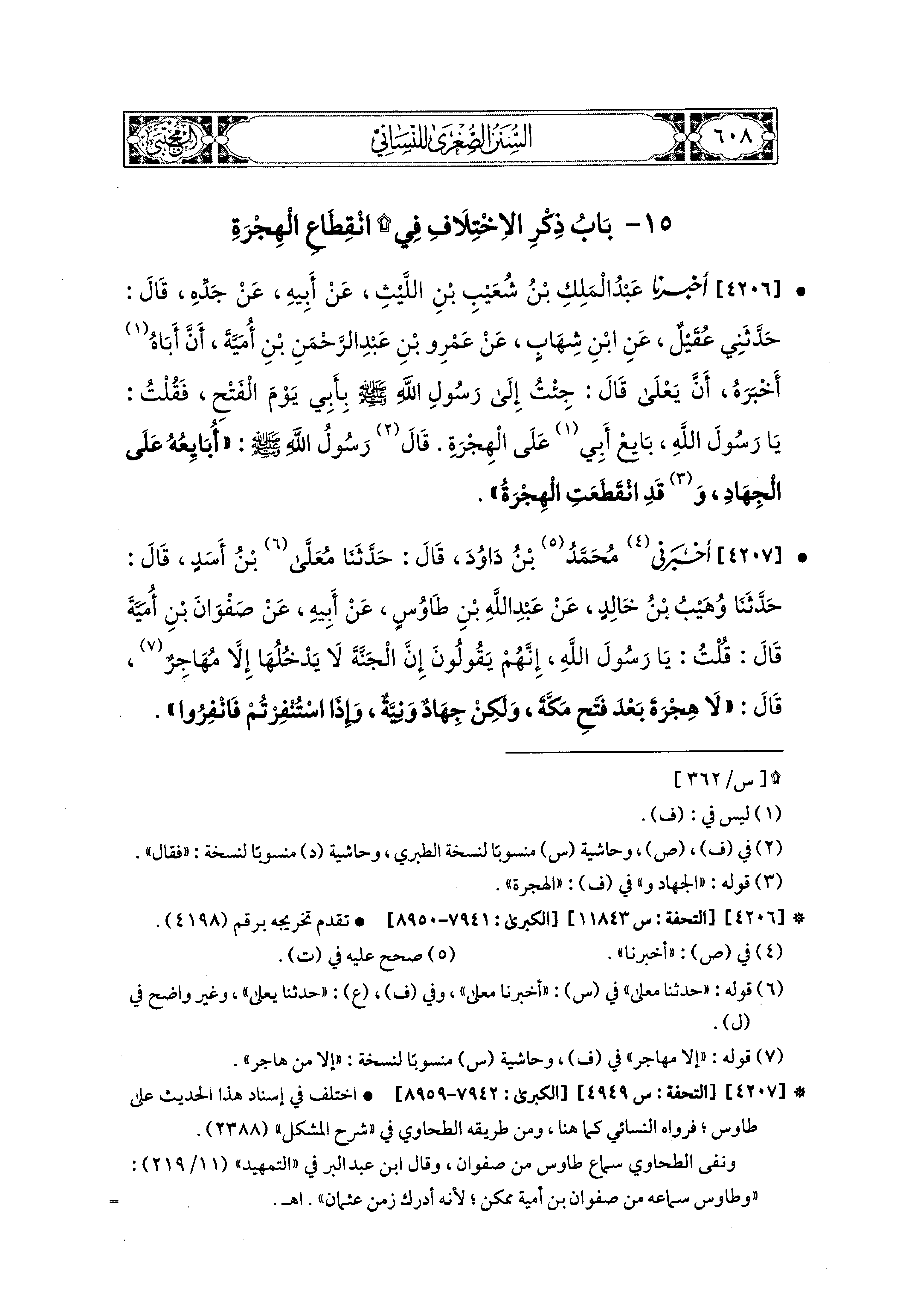 4207- أَخْبَرَني مُحَمدُ بْنُ دَاوُدَ، قال: حَدثنا مُعَلَّى بْنُ أَسَدٍ، قال: حَدثنا وُهَيْبُ بْنُ خَالِدٍ، عَن عَبد اللهِ بن طَاوُوسٍ، عَن أَبِيهِ، عَن صَفْوَانَ بْنِ أُمَيَّةَ، قَالَ: قُلْتُ: يَا رَسُولَ اللهِ، إِنَّهُمْ يَقُولُونَ: إِنَّ الجَنَّةَ لاَ يَدْخُلُهَا إِلاَّ مُهَاجِرٌ، قَالَ: لاَ هِجْرَةَ بَعْدَ فَتْحِ مَكَّةَ، وَلَكِنْ جِهَادٌ وَنيَّةٌ، فَإِذَا اسْتُنْفِرْتُمْ فَانْفِرُوا.