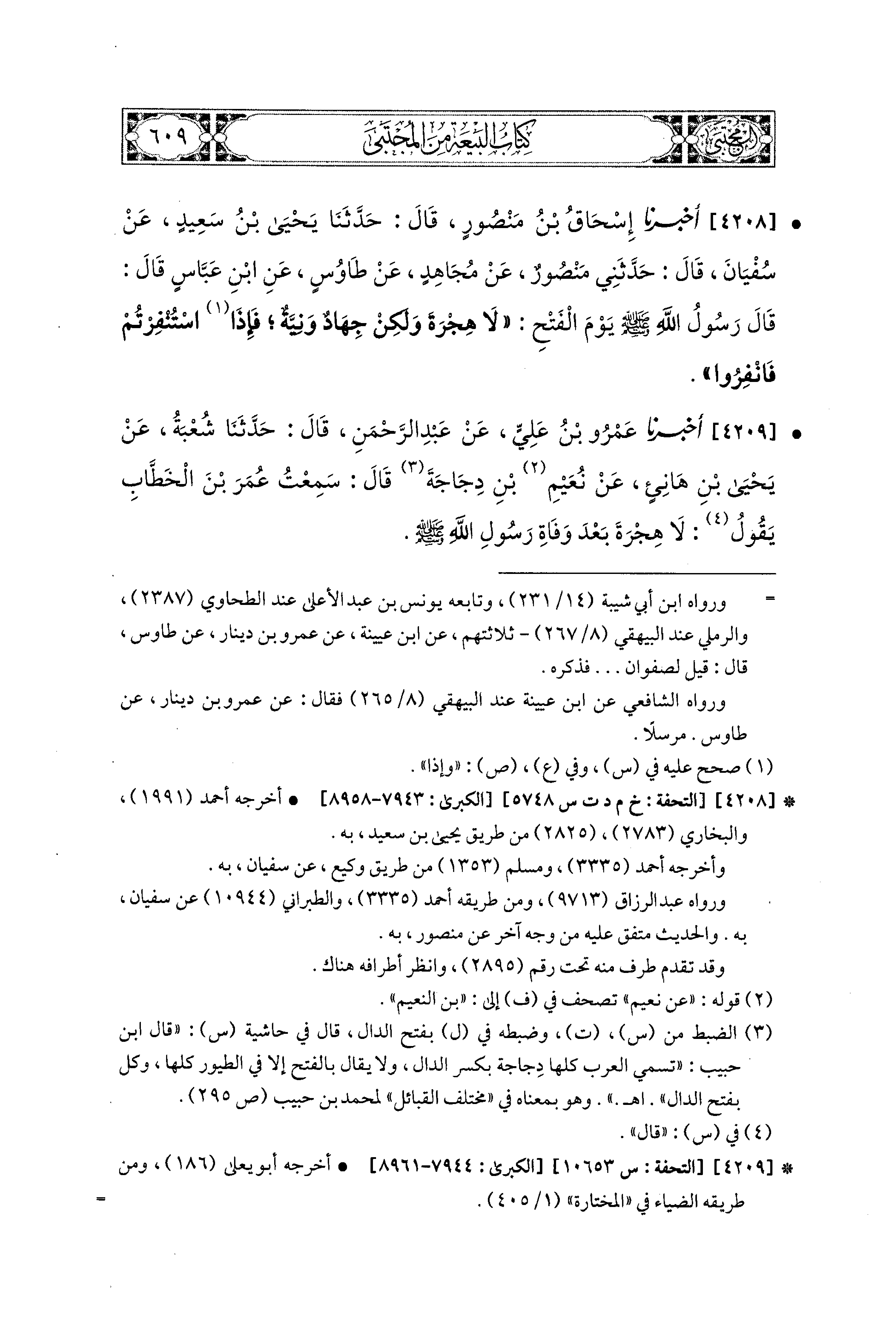 4208- أَخبَرَنا إِسحَاقُ بْنُ مَنْصُورٍ، قال: حَدثنا يَحيَى بْنُ سَعيدٍ، عَن سُفْيَانَ، قَالَ: حَدَّثَني مَنْصُورٌ، عَن مُجَاهِدٍ، عَن طَاوُوسٍ، عَنِ ابنِ عَبَّاسٍ، قَالَ: قَالَ رَسُولُ اللهِ صَلى الله عَليه وسَلم يَوْمَ الفَتْحِ: لاَ هِجْرَةَ، وَلَكِنْ جِهَادٌ وَنيَّةٌ، فَإِذَا اسْتُنْفِرْتُمْ فَانْفِرُوا.