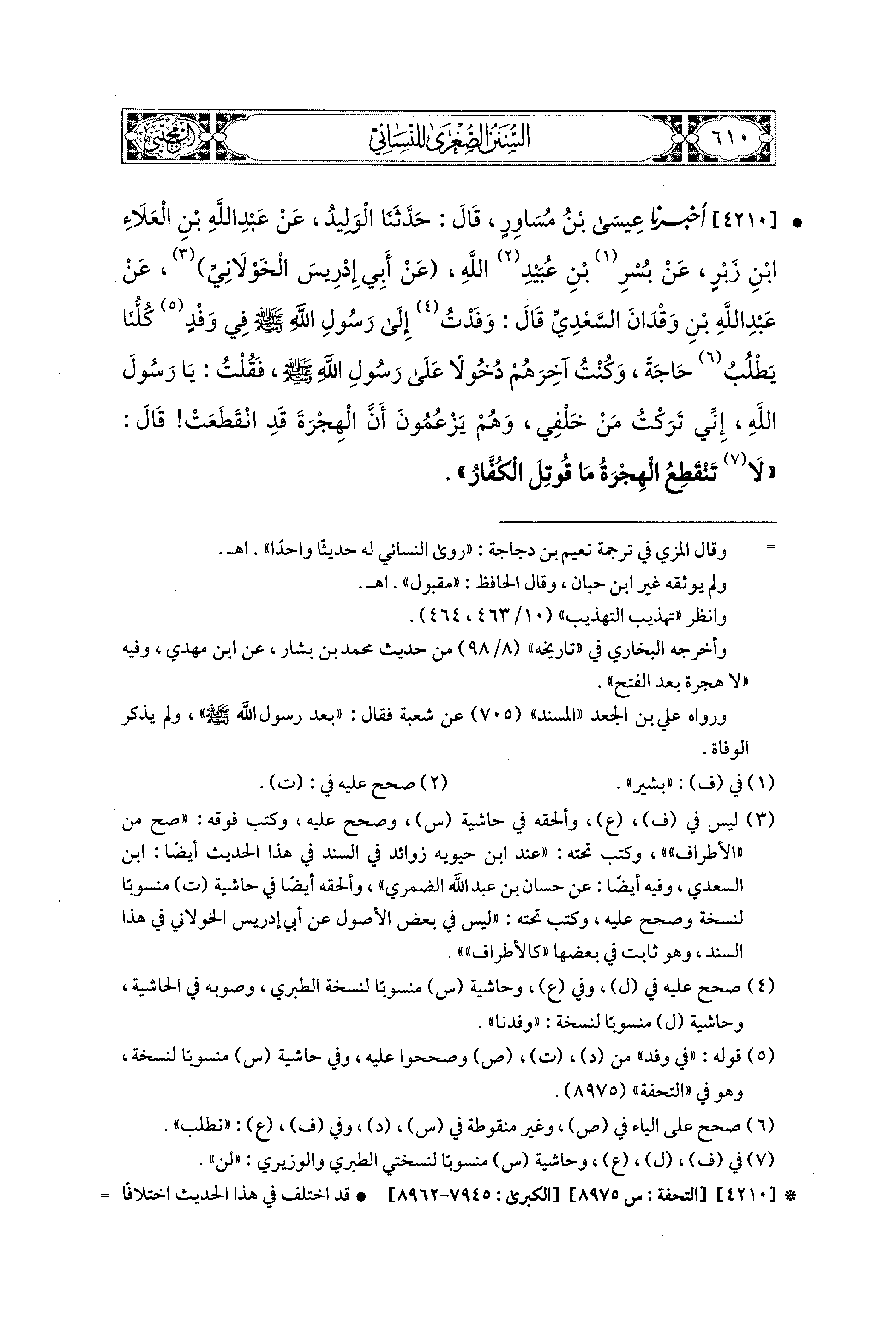 4210- أَخبَرَنا عِيسَى بْنُ مُسَاوِرٍ، قال: حَدثنا الوَلِيدُ، عَن عَبد اللهِ بن العَلاَءِ بْنِ زَبْرٍ، عَن بُسْرِ بْنِ عُبَيدِ اللهِ، عَن أَبِي إِدْرِيسَ الخَوْلاَنيِّ، عَن عَبد اللهِ بن وَقْدَانَ السَّعْدِيِّ، قَالَ: وَفَدْتُ إِلَى رَسُولِ اللهِ صَلى الله عَليه وسَلم فِي وَفْدٍ كُلُّنَا يَطْلُبُ حَاجَةً، وَكُنْتُ آخِرَهُمْ دُخُولاً عَلَى رَسُولِ اللهِ صَلى الله عَليه وسَلم، فَقُلْتُ: يَا رَسُولَ اللهِ، إِنِّي تَرَكْتُ مَنْ خَلْفِي وَهُمْ يَزْعُمُونَ أَنَّ الهِجْرَةَ قَدِ انْقَطَعَتْ، قَالَ: لاَ تَنْقَطِعُ الهِجْرَةُ مَا قُوتِلَ الكُفَّارُ.