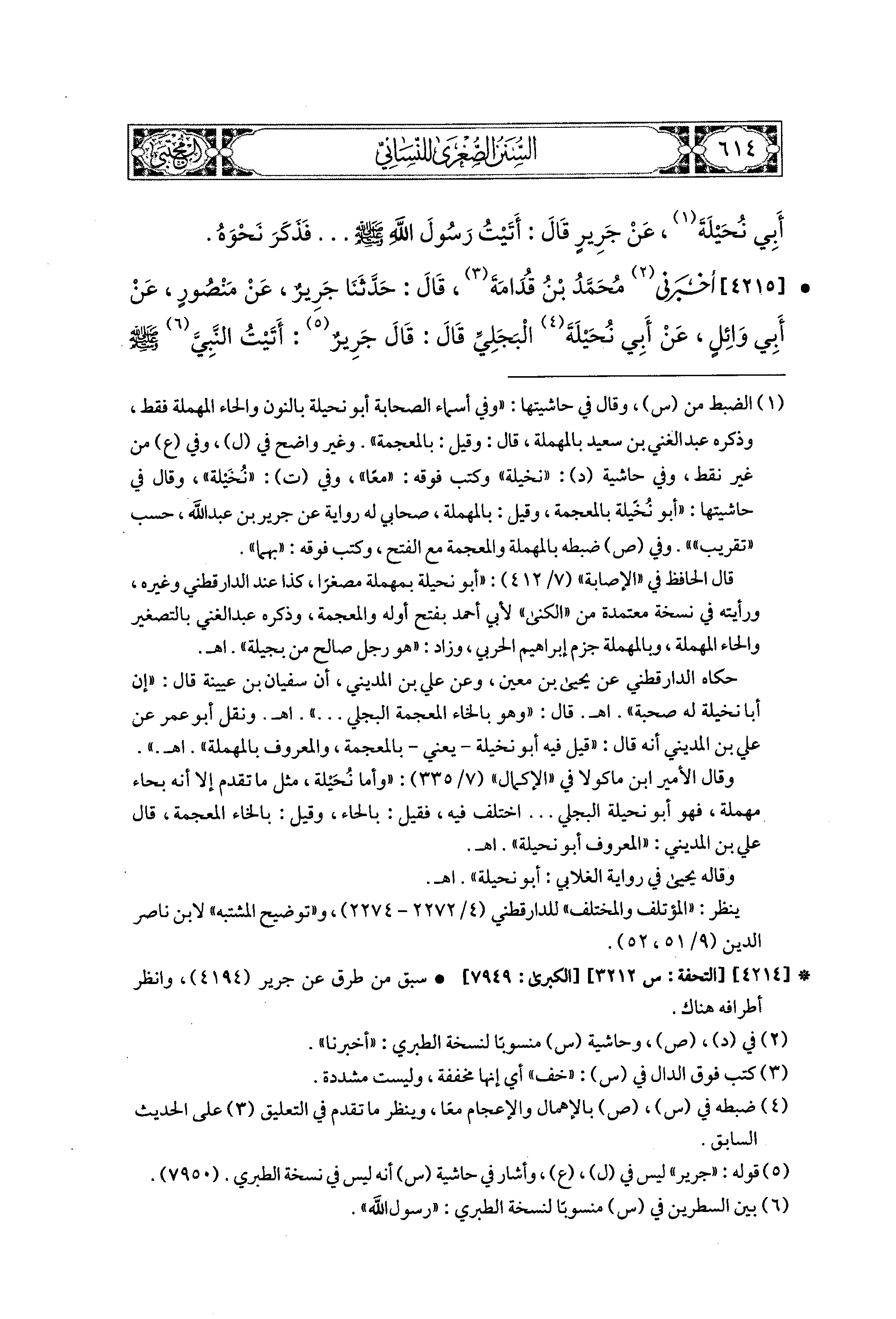 (1) قال المِزِّي: أَبو نُخيلة البجلي، ذكره عبد الغني بن سَعيد بالحاء المهملة، وذكره غيره بالمعجمة، رَوَى عَن جرير بن عَبد الله البجلي؛ بايعتُ رسول الله صَلى الله عَليه وسَلم على إقام الصلاة...الحديث، رَوَى عَنه أَبو وائل، شقيق بن سلمة، وقيل: عَن أَبي وائل، عَن أَبي جميلة، عن جرير، وقيل: عَن أَبي وائل، عن جرير، ليس بينهما أَحَدٌ. «تهذيب الكمال» 34/342.