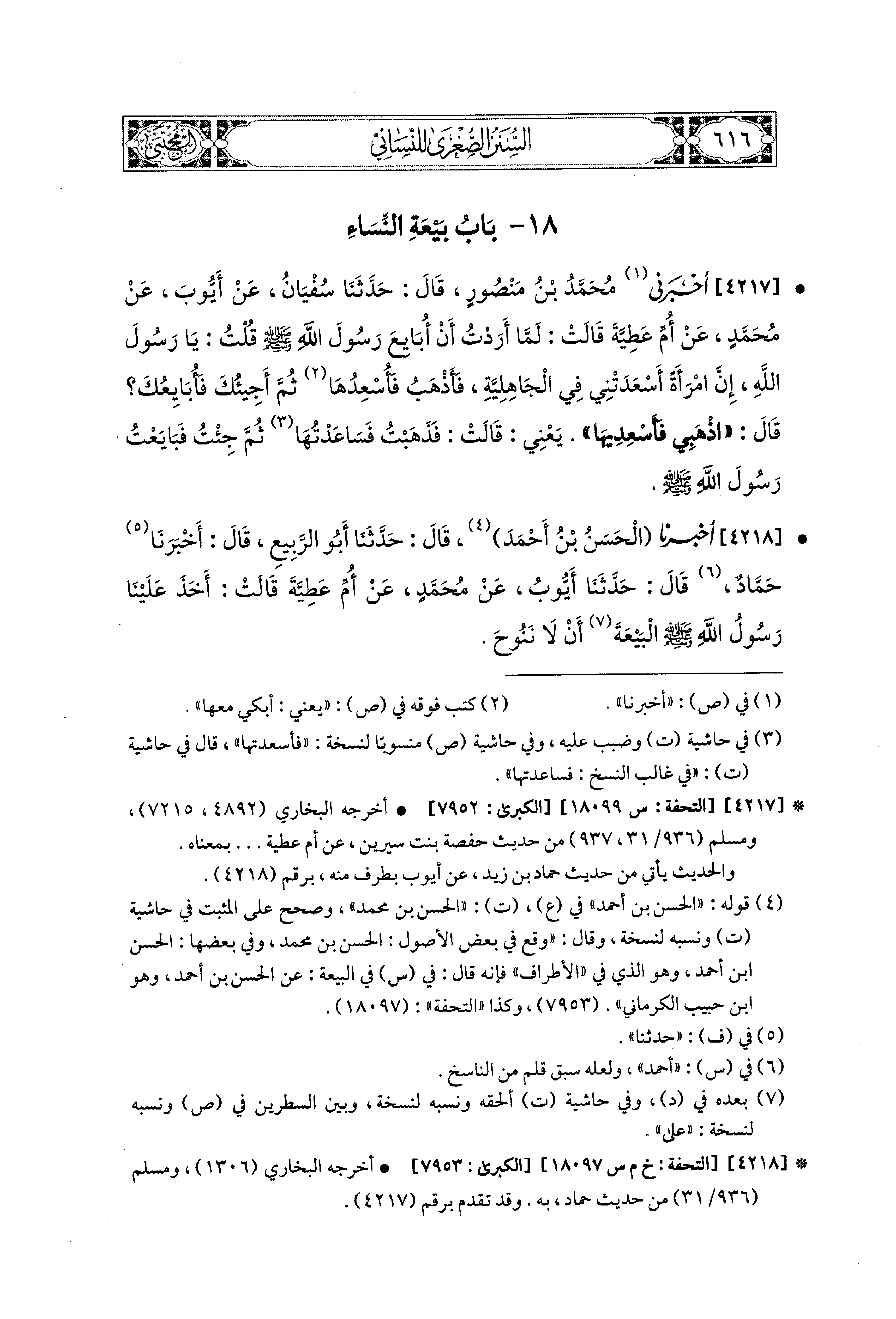 4217- أَخْبَرَني مُحَمدُ بْنُ مَنْصُورٍ، قال: حَدثنا سُفْيَانُ، عَن أَيُّوبَ، عَن مُحَمدٍ، عَن أُمِّ عَطِيَّةَ، قَالَتْ: لَمَّا أَرَدْتُ أَنْ أُبَايِعَ رَسُولَ اللهِ صَلى الله عَليه وسَلم، قُلْتُ: يَا رَسُولَ اللهِ، إِنَّ امْرَأَةً أَسْعَدَتْني فِي الجَاهِلِيَّةِ، فَأَذْهَبُ فَأُسْعِدُهَا ثُمَّ أَجِيئُكَ فَأُبَايِعُكَ؟ قَالَ: اذْهَبِي فَأَسْعِدِيهَا، يعني, قَالَتْ: فَذَهَبْتُ فَسَاعَدْتُهَا، ثُمَّ جِئْتُ فَبَايَعْتُ رَسُولَ اللهِ صَلى الله عَليه وسَلم.