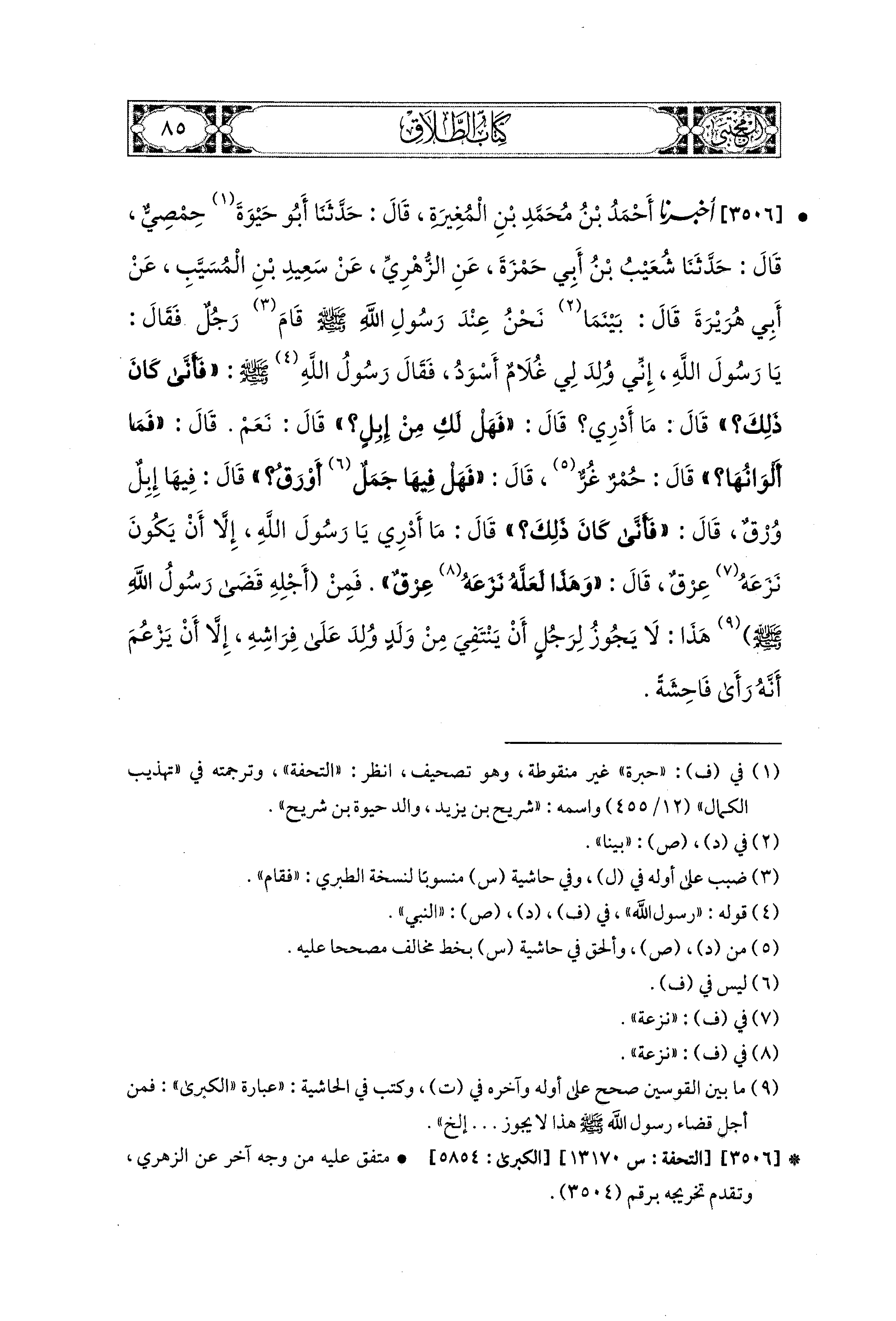 3506- أَخبَرَنا أَحْمَدُ بْنُ مُحَمدِ بْنِ المُغِيرَةِ، قال: حَدثنا أَبو حَيْوَةَ حِمْصِيٌّ، قال: حَدثنا شُعَيبُ بْنُ أَبِي حَمْزَةَ، عَنِ الزُّهْرِيِّ، عَن سَعيدِ بْنِ المُسَيَّبِ، عَن أَبِي هُرَيرَةَ، قَالَ: بَيْنَمَا نَحْنُ عِنْدَ رَسُولِ اللهِ صَلى الله عَليه وسَلم قَامَ رَجُلٌ، فَقَالَ: يَا رَسُولَ اللهِ، إِنِّي وُلِدَ لِي غُلاَمٌ أَسْوَدُ، فَقَالَ رَسُولُ اللهِ صَلى الله عَليه وسَلم: فَأَنَّى كَانَ ذَلِكَ؟ قَالَ: مَا أَدْرِي، قَالَ: فَهَلْ لَكَ مِنْ إِبِلٍ؟ قَالَ: نَعَمْ، قَالَ: فَمَا أَلْوَانُهَا؟ قَالَ: حُمْرٌ(1)، قَالَ: فَهَلْ فِيهَا جَمَلٌ أَوْرَقُ؟ قَالَ: فِيهَا إِبِلٌ وُرْقٌ، قَالَ: فَأَنَّى كَانَ ذَلِكَ؟ قَالَ: مَا أَدْرِي يَا رَسُولَ اللهِ، إِلاَّ أَنْ يَكُونَ نَزَعَهُ عِرْقٌ، قَالَ: وَهَذَا لَعَلَّهُ نَزَعَهُ عِرْقٌ، فَمِنْ أَجْلِهِ قَضَى رَسُولُ اللهِ صَلى الله عَليه وسَلم، هَذَا لاَ يَجُوزُ لِرَجُلٍ أَنْ يَنْتَفِيَ مِنْ وَلَدٍ وُلِدَ عَلَى فِرَاشِهِ، إِلاَّ أَنْ يَزْعُمَ أَنَّهُ رَأَى فَاحِشَةً.