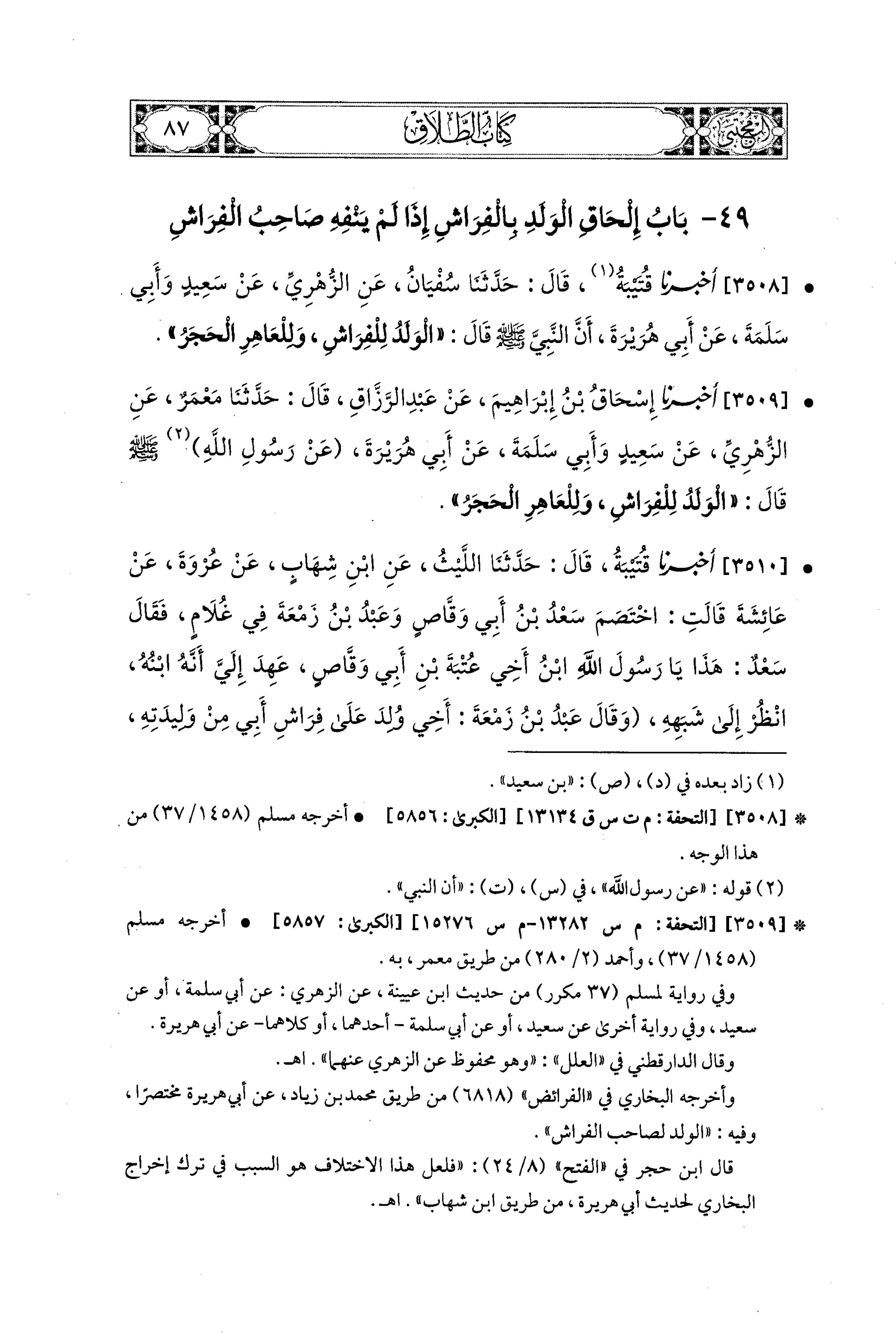3508- أَخبَرَنا قُتَيبَةُ، قال: حَدثنا سُفْيَانُ، عَنِ الزُّهْرِيِّ، عَن سَعيدٍ، وَأَبِي سَلَمَةَ، عَن أَبِي هُرَيرَةَ، أَنَّ النَّبيَّ صَلى الله عَليه وسَلم قَالَ: الوَلَدُ لِلْفِرَاشِ وَلِلْعَاهِرِ الحَجَرُ.