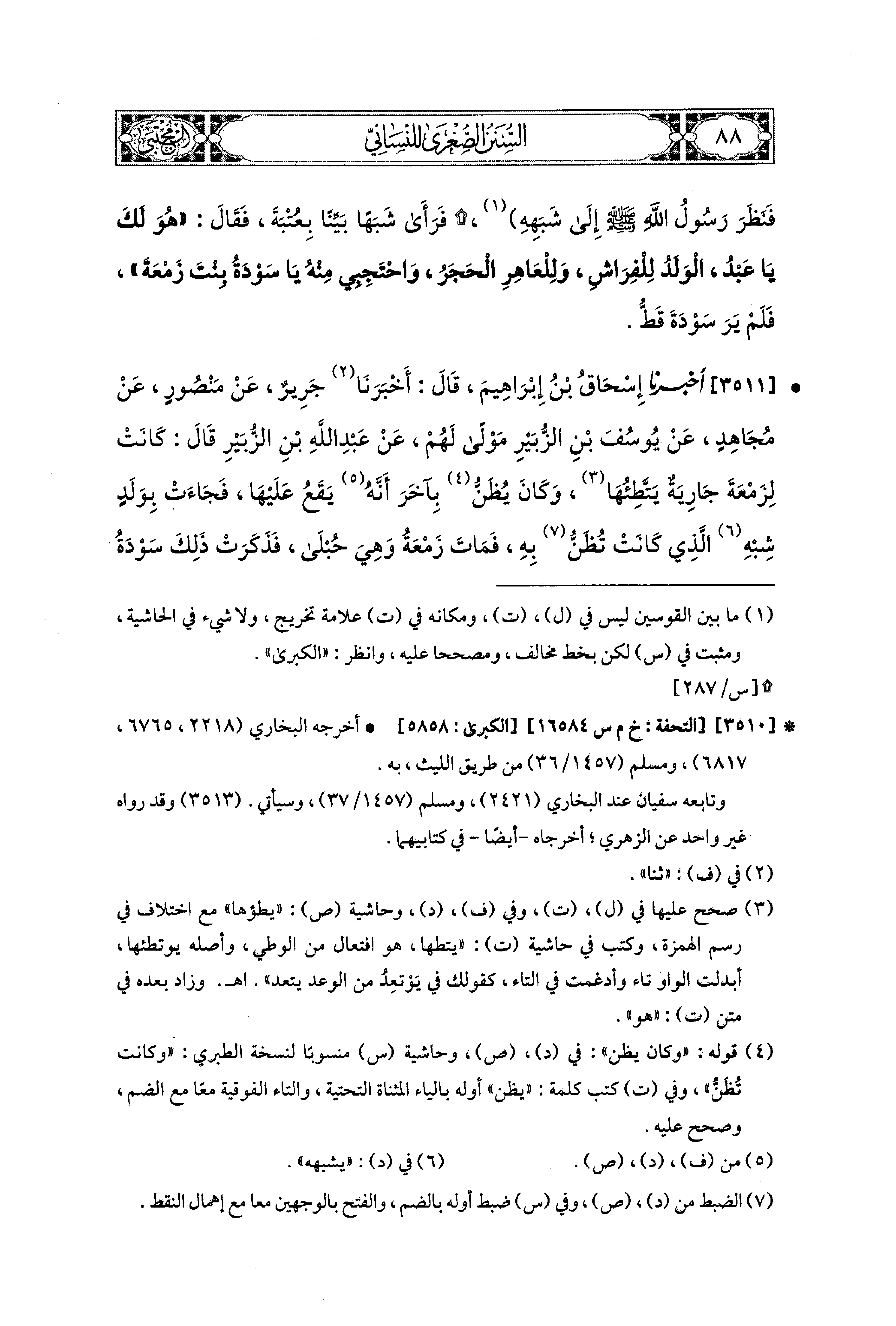 3511- أَخبَرَنا إِسحَاقُ بْنُ إِبراهِيمَ، قَالَ: أَخبَرنا جَرِيرٌ، عَن مَنْصُورٍ، عَن مُجَاهِدٍ، عَن يُوسُفَ بْنِ الزُّبَيْرِ، مَوْلًى لَهُمْ، عَن عَبد اللهِ بن الزُّبَيْرِ، قَالَ: كَانَتْ لِزَمْعَةَ جَارِيَةٌ يَطَؤُهَا هُوَ، وَكَانَ يَظُنُّ بِآخَرَ أنه يَقَعُ عَلَيْهَا، فَجَاءَتْ بِوَلَدٍ شِبْهِ الَّذِي كَانَتْ تُظَنُّ بِهِ، فَمَاتَ زَمْعَةُ وَهِيَ حُبْلَى، فَذَكَرَتْ ذَلِكَ سَوْدَةُ لِرَسُولِ اللهِ صَلى الله عَليه وسَلم، فَقَالَ رَسُولُ اللهِ صَلى الله عَليه وسَلم: الوَلَدُ لِلْفِرَاشِ، وَاحْتَجِبِي مِنْهُ يَا سَوْدَةُ فَلَيْسَ لَكِ بِأَخٍ.