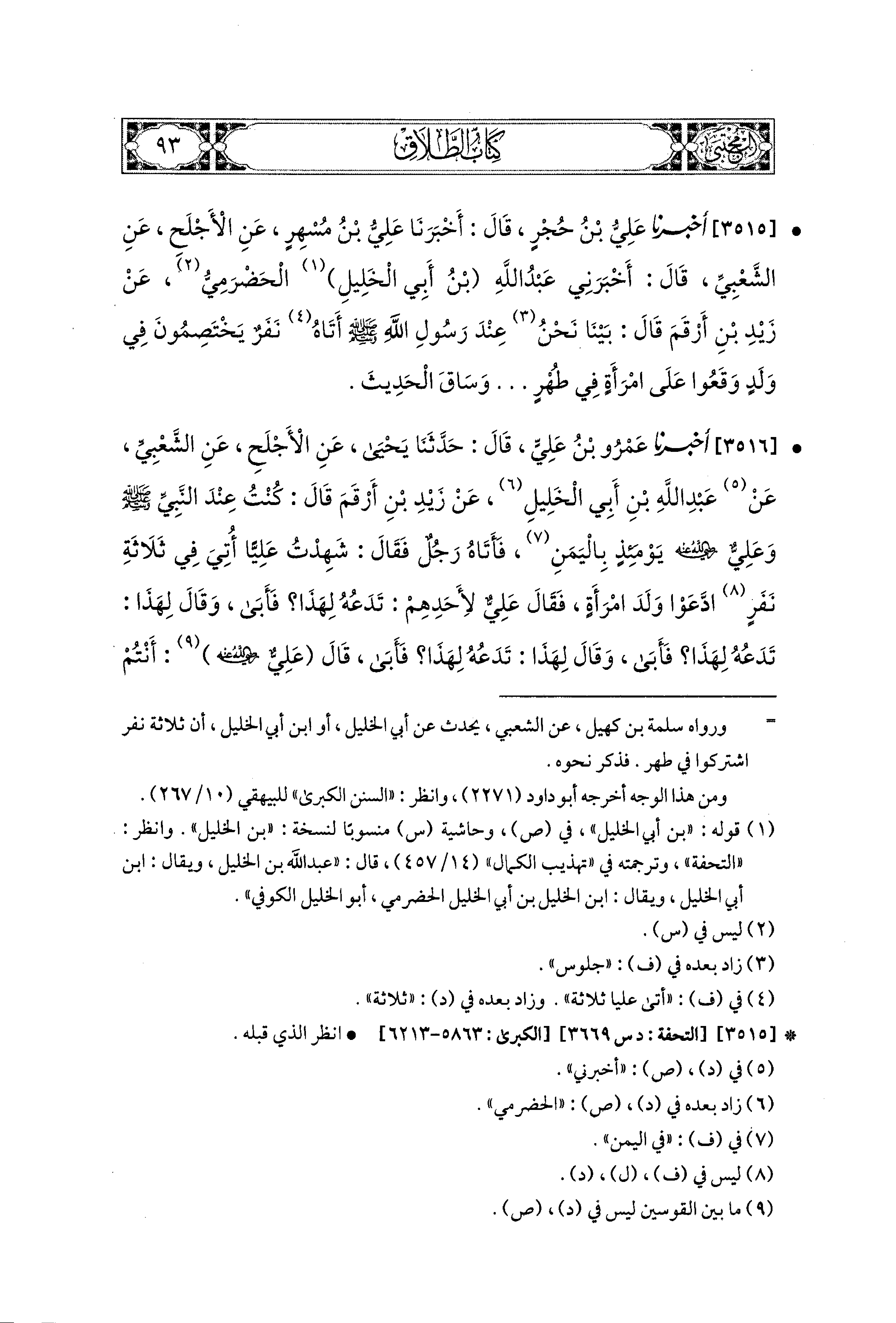 3515- أَخبَرَنا عَلِيُّ بْنُ حُجْرٍ، قال: أَخبَرَنا عَلِيُّ بْنُ مُسْهِرٍ، عَنِ الأَجْلَحِ، عَنِ الشَّعْبِيِّ، قَالَ: أَخْبَرَني عَبدُ اللهِ بْنُ أَبِي الخَلِيلِ الحَضْرَميُّ، عَن زَيْدِ بْنِ أَرْقَمَ، قَالَ: بَيْنَا نَحْنُ عِنْدَ رَسُولِ اللهِ صَلى الله عَليه وسَلم إِذْ جَاءَهُ رَجُلٌ مِنَ اليَمَنِ، فَجَعَلَ يُخْبِرُهُ وَيُحَدِّثُهُ وَعَلِيٌّ بِهَا، فَقَالَ: يَا رَسُولَ اللهِ، أَتَى عَلِيًّا ثَلاَثَةُ نَفَرٍ يَخْتَصِمُونَ فِي وَلَدٍ، وَقَعُوا عَلَى امْرَأَةٍ فِي طُهْرٍ، وَسَاقَ الحَدِيثَ(1).