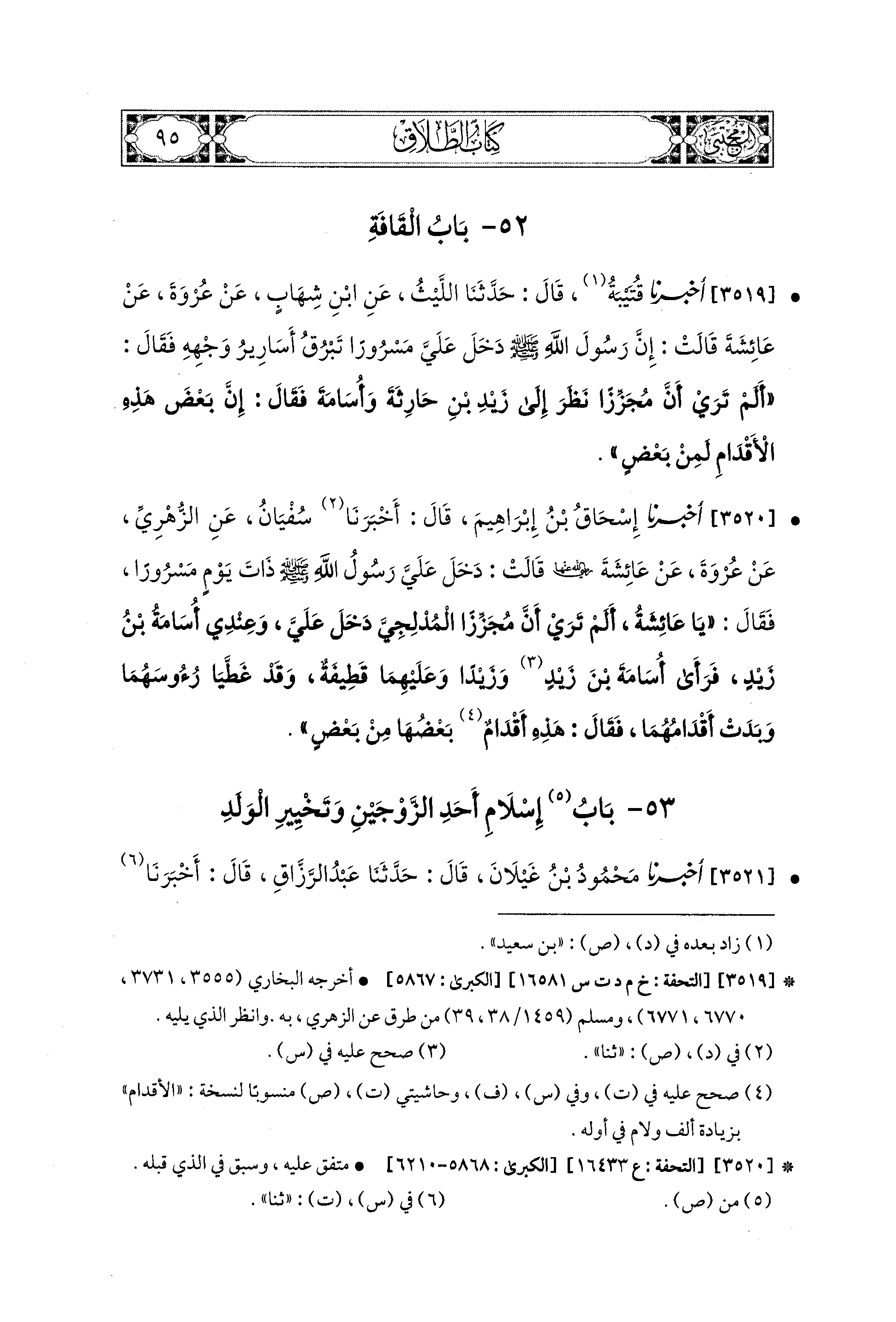 3519- أَخبَرَنا قُتَيبَةُ، قال: حَدثنا اللَّيْثُ، عَنِ ابنِ شِهَابٍ، عَن عُرْوَةَ، عَن عَائِشَةَ، قَالَتْ: إِنَّ رَسُولَ اللهِ صَلى الله عَليه وسَلم دَخَلَ عَلَيَّ مَسْرُورًا تَبْرُقُ أَسَارِيرُ وَجْهِهِ، فَقَالَ: أَلَمْ تَرَيْ أَنَّ مُجَزِّزًا نَظَرَ إِلَى زَيْدِ بْنِ حَارِثَةَ وَأُسَامَةَ فَقَالَ: إِنَّ بَعْضَ هَذِهِ الأَقْدَامِ لَمِنْ بَعْضٍ.