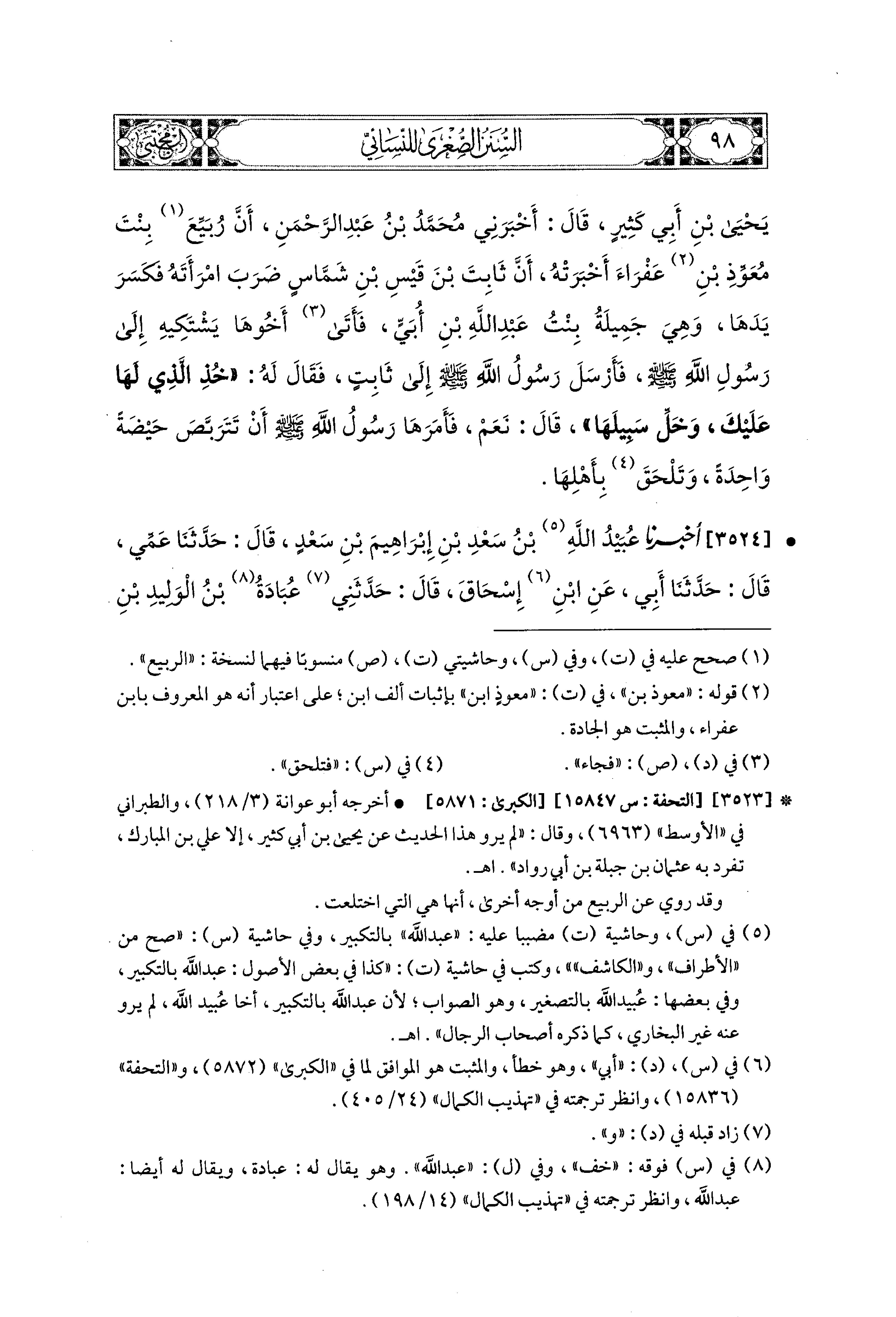 3524- أَخبَرَنا عُبَيدُ اللهِ بْنُ سَعْدِ بْنِ إِبراهِيمَ بْنِ سَعْدٍ، قال: حَدثنا عَمِّي، قال: حَدثنا أَبِي، عَنِ ابنِ إِسحَاقَ، قَالَ: حَدَّثَني عُبَادَةُ بْنُ الوَلِيدِ بْنِ عُبَادَةَ بْنِ الصَّامِتِ، عَن رُبَيِّعٍ بِنْتِ مُعَوِّذٍ، قَالَ: قُلْتُ لَهَا: حَدِّثِيني حَدِيثَكِ، قَالَتْ: اخْتَلَعْتُ مِنْ زَوْجِي ثُمَّ جِئْتُ عُثمَانَ، فَسَأَلْتُهُ مَاذَا عَلَيَّ مِنَ العِدَّةِ؟ فَقَالَ: لاَ عِدَّةَ عَلَيْكِ إِلاَّ أَنْ تَكُوني حَدِيثَةَ عَهْدٍ بِهِ، فَتَمْكُثِي حَتَّى تَحِيضِي حَيْضَةً، قَالَ: وَأَنَا مُتَّبِعٌ فِي ذَلِكَ قَضَاءَ رَسُولِ اللهِ صَلى الله عَليه وسَلم فِي مَرْيَمَ المَغَالِيَّةِ، كَانَتْ تَحْتَ ثَابِتِ بْنِ قَيْسِ بْنِ شَمَّاسٍ فَاخْتَلَعَتْ مِنْهُ.